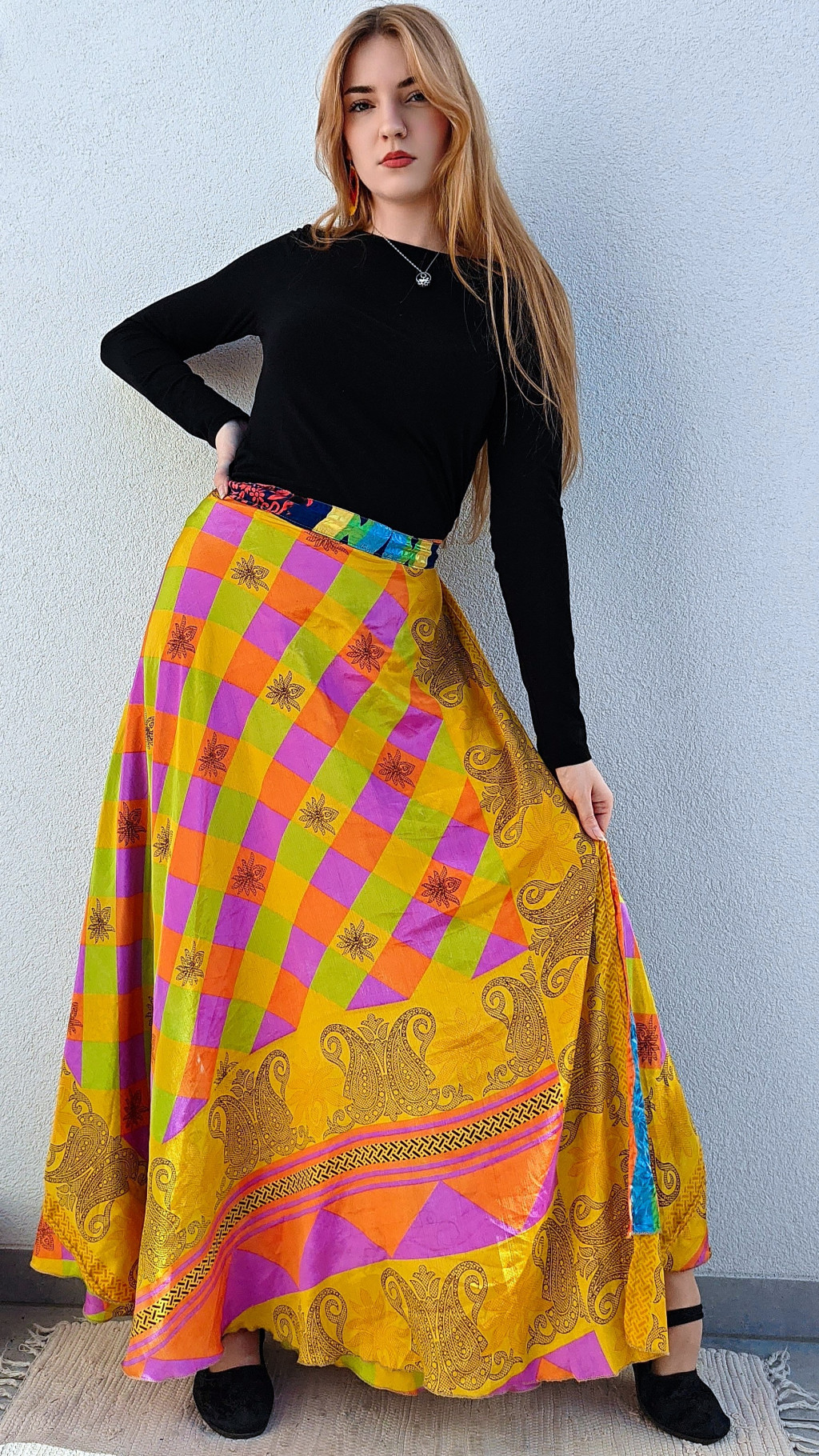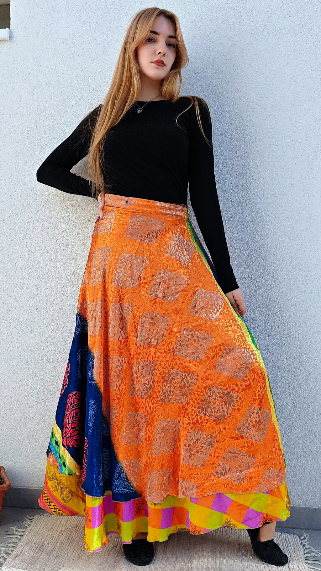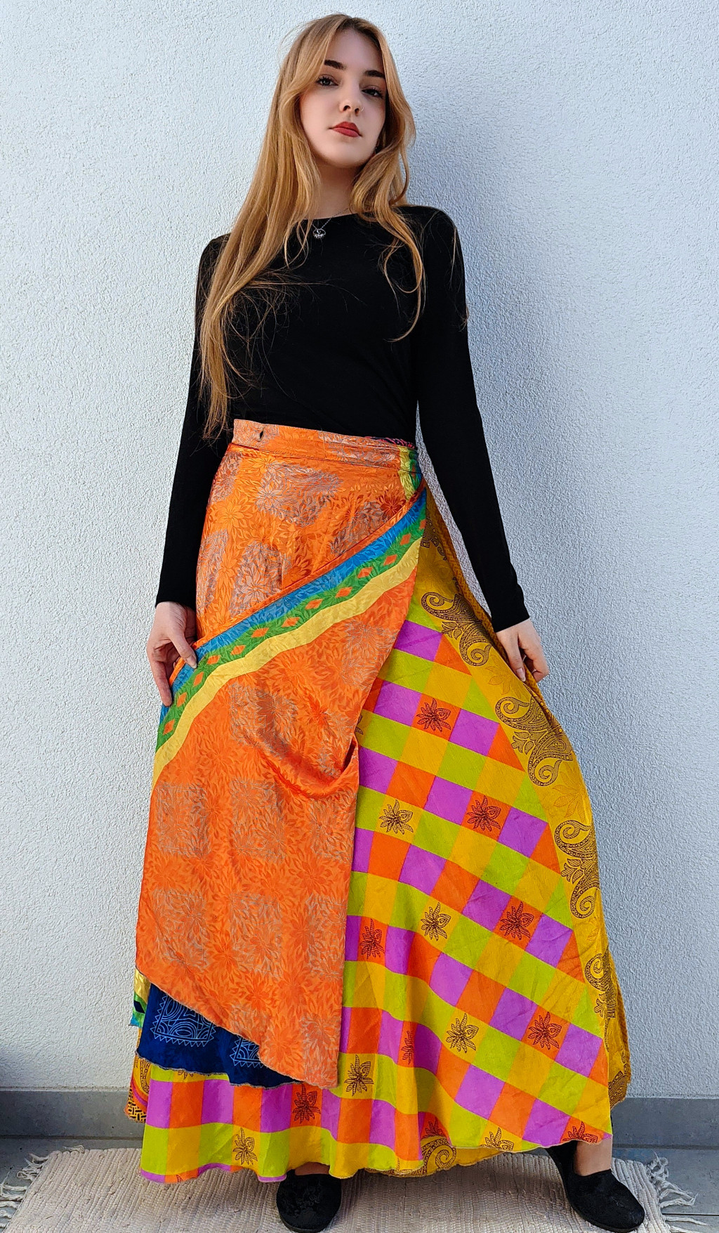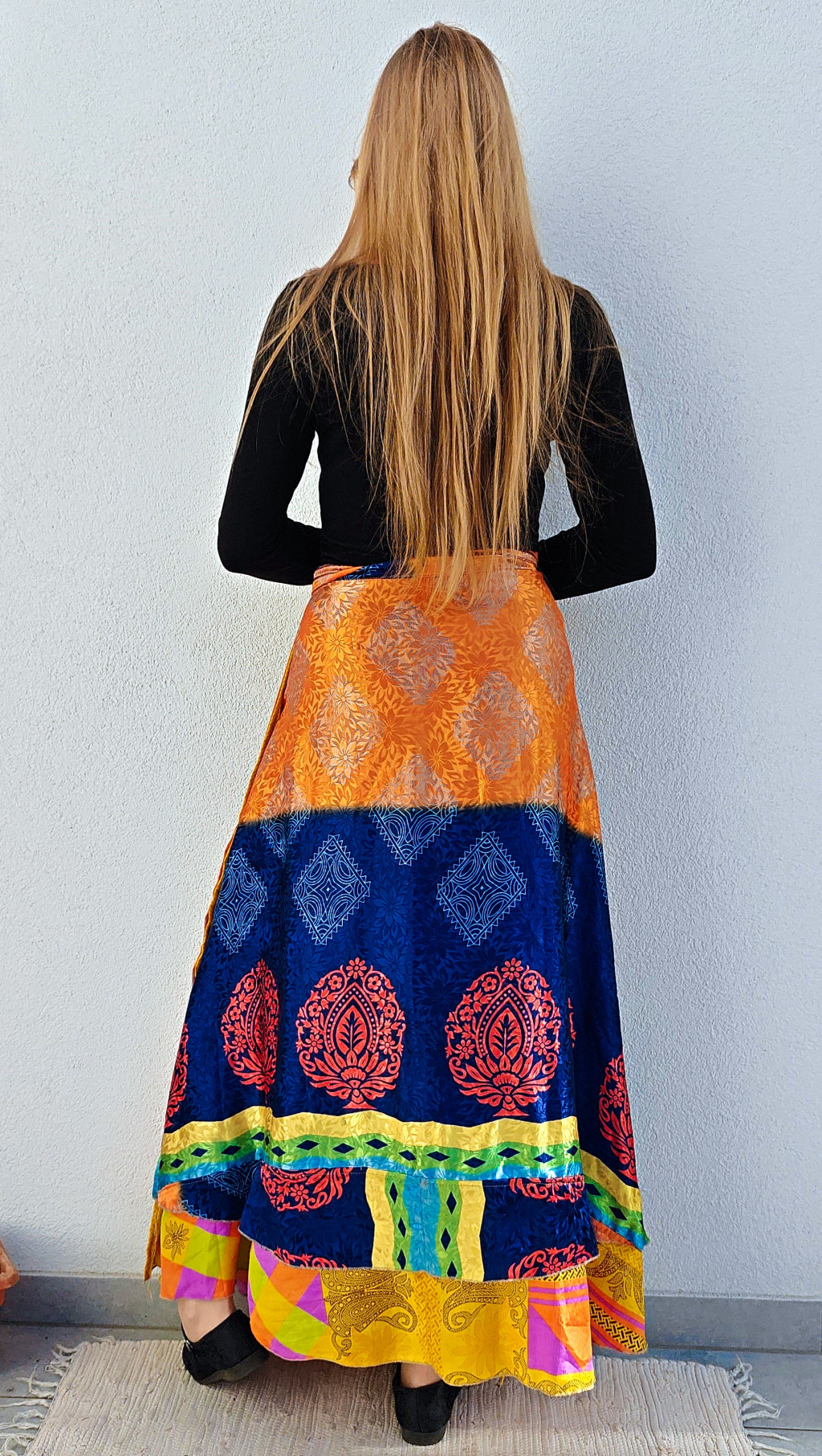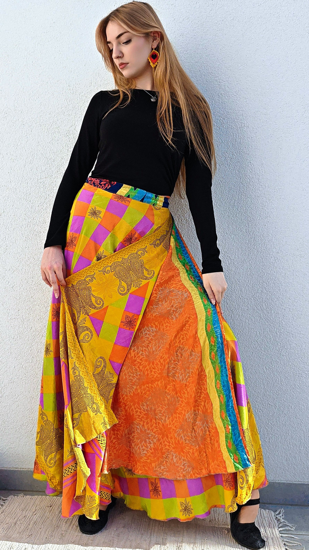 Lapszoknyáink újrahasznosított szárikból készülnek Indiában, egy hosszabb és egy rövidebb anyag derékban összevarrva! Két oldalú, kifordítható, mindkét oldala hordható, sokféleképpen köthető, variálható. Szoknyáinkból nincs két egyforma, mindegyikből csak EGY darab van, ha megtetszik, csapj le rá!