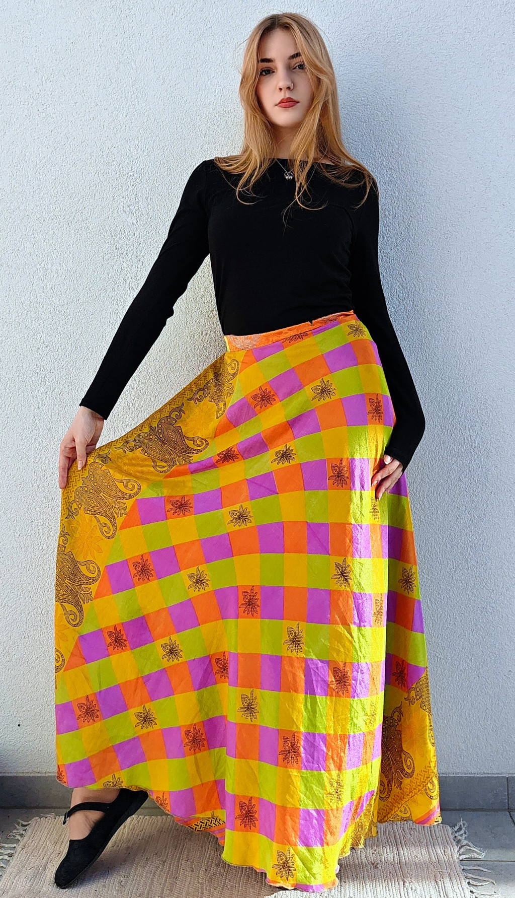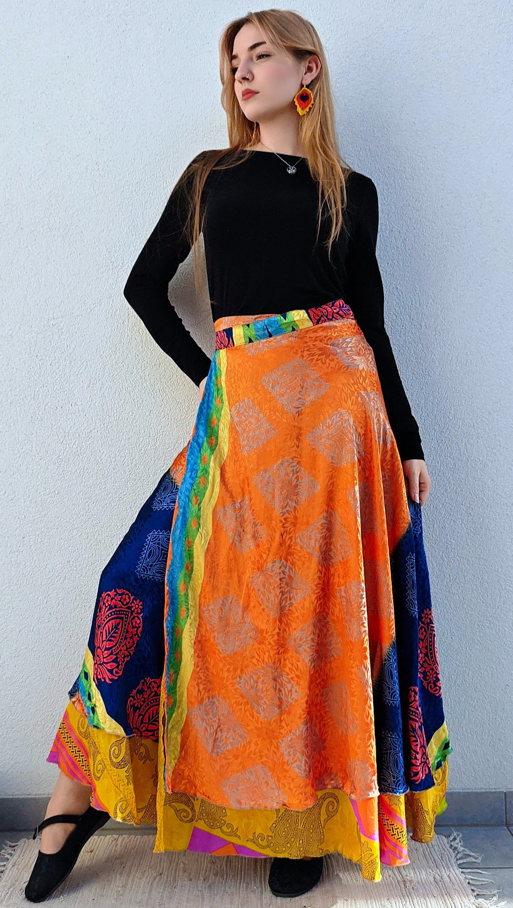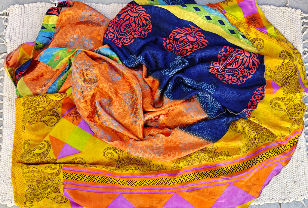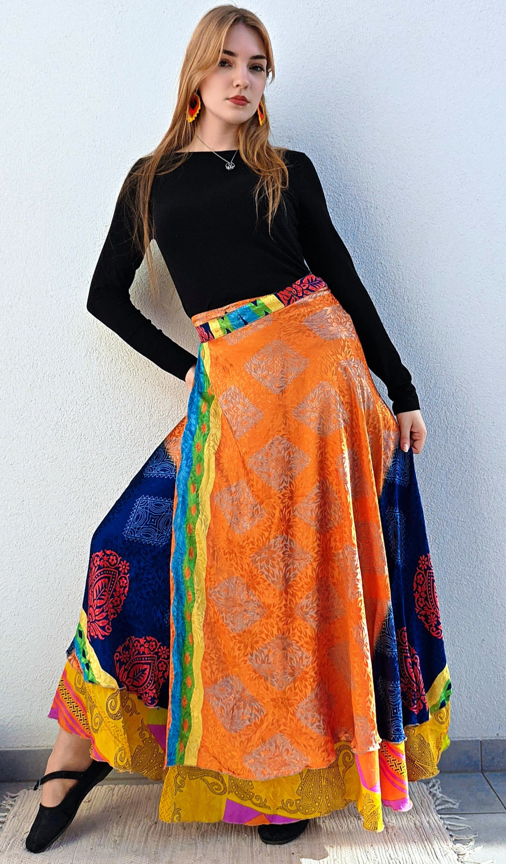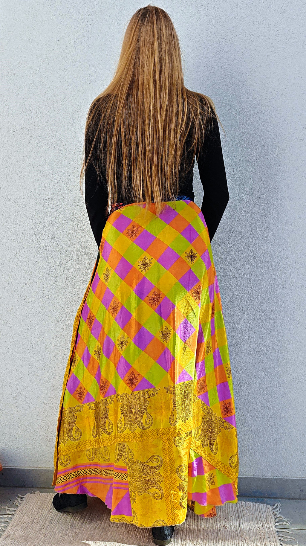 Lapszoknyáink újrahasznosított szárikból készülnek Indiában, egy hosszabb és egy rövidebb anyag derékban összevarrva! Két oldalú, kifordítható, mindkét oldala hordható, sokféleképpen köthető, variálható. Szoknyáinkból nincs két egyforma, mindegyikből csak EGY darab van, ha megtetszik, csapj le rá!