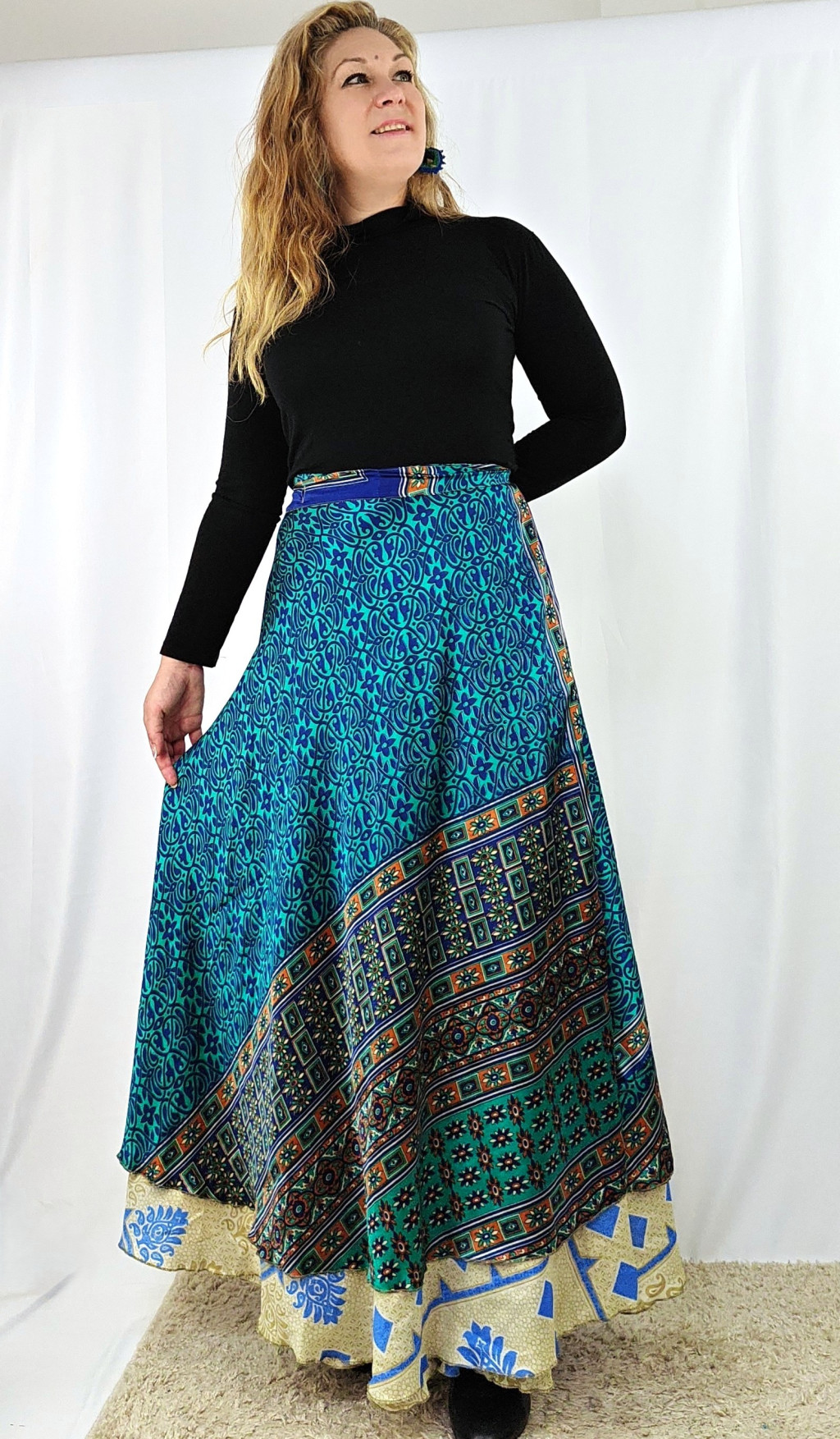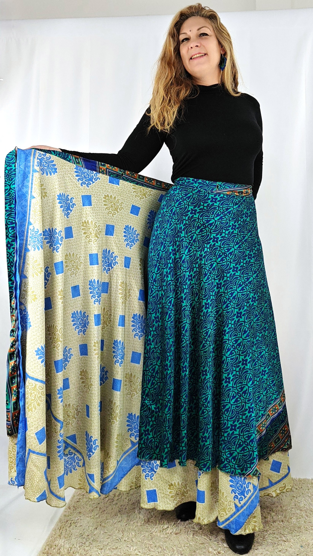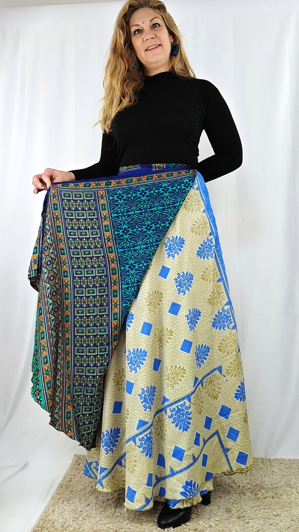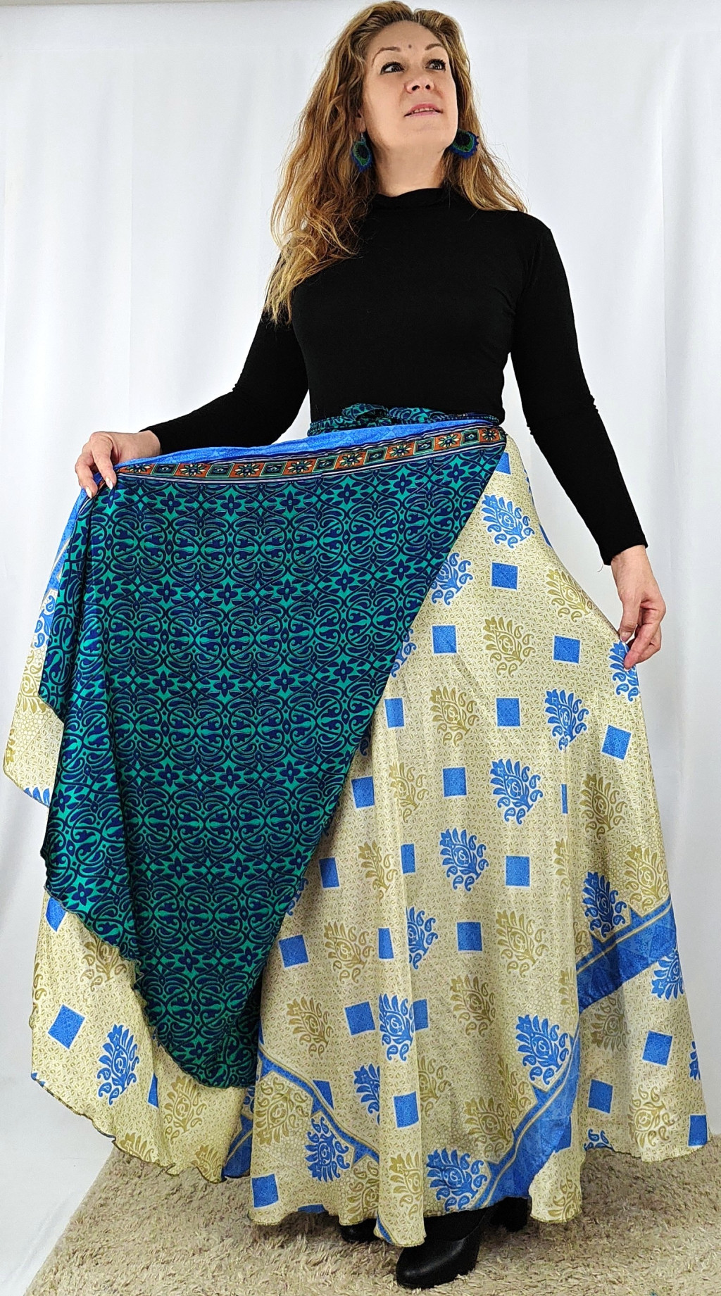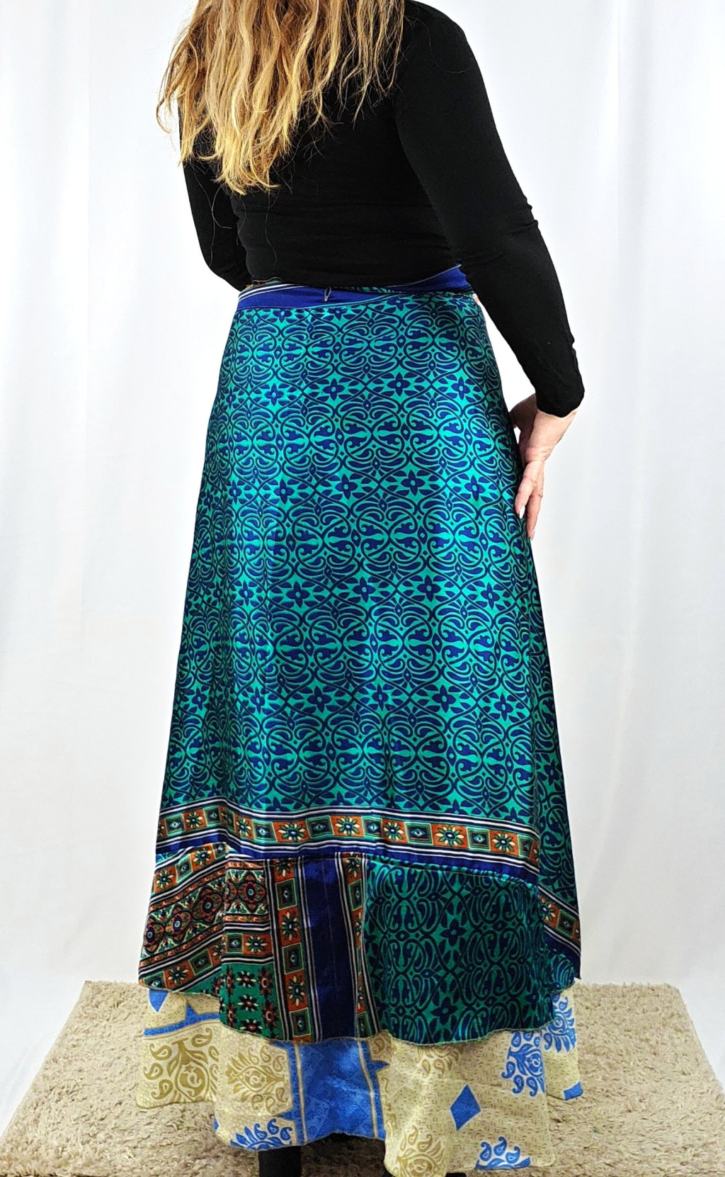 Lapszoknyáink újrahasznosított szárikból készülnek Indiában, egy hosszabb és egy rövidebb anyag derékban összevarrva! Két oldalú, kifordítható, mindkét oldala hordható, sokféleképpen köthető, variálható. Szoknyáinkból nincs két egyforma, mindegyikből csak EGY darab van, ha megtetszik, csapj le rá!