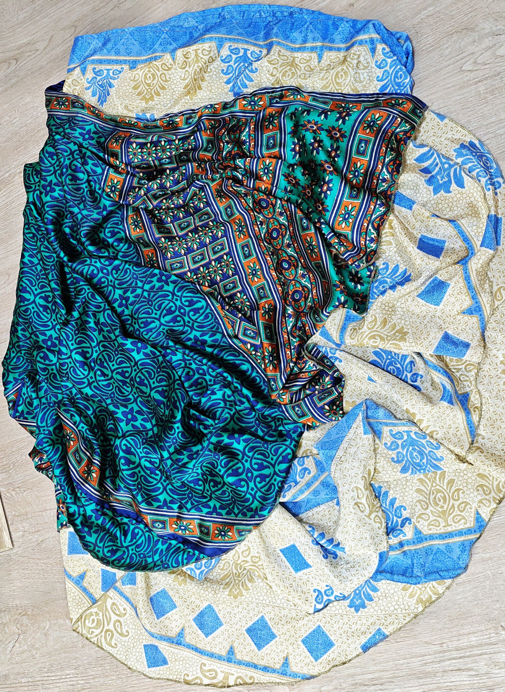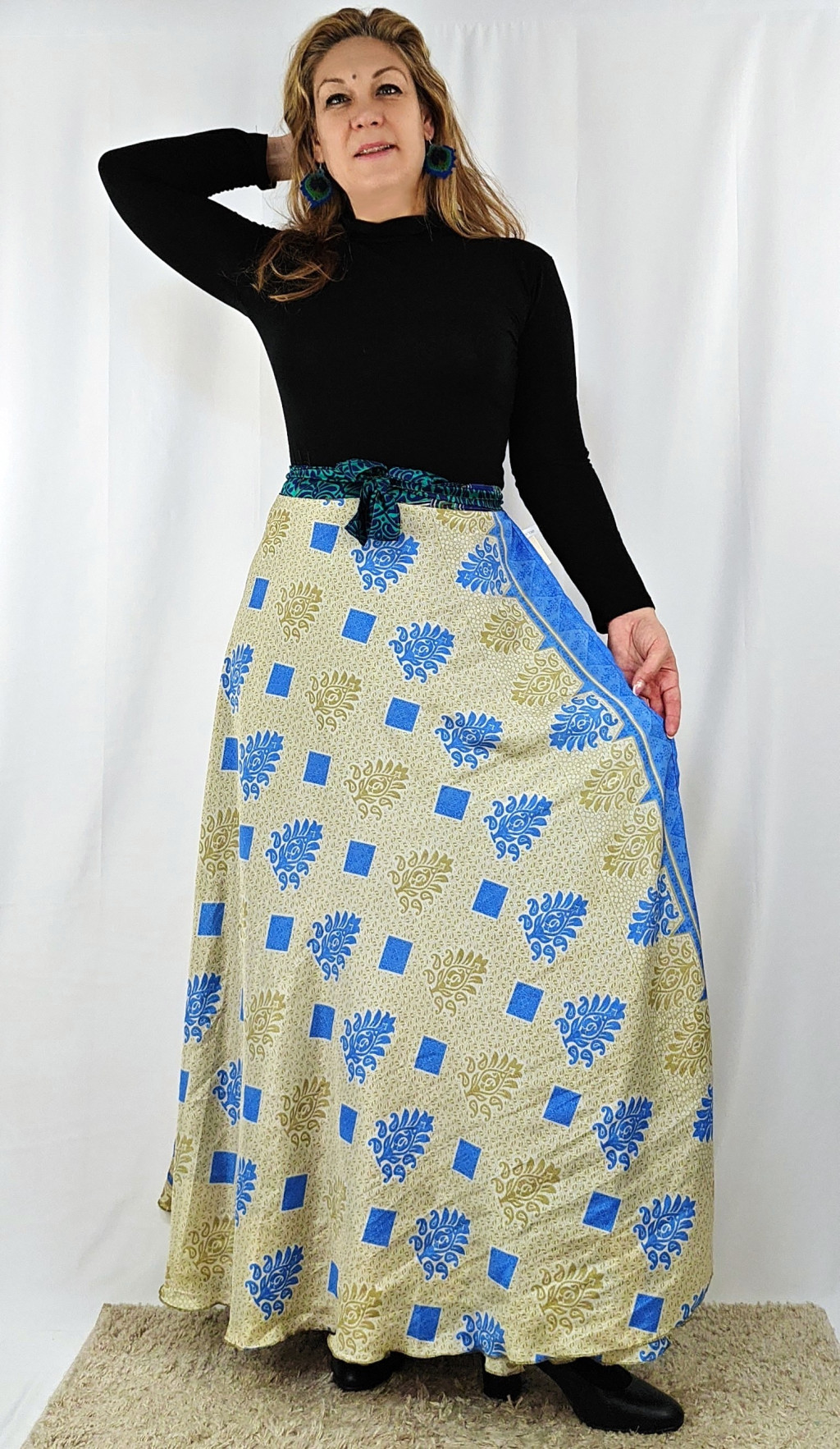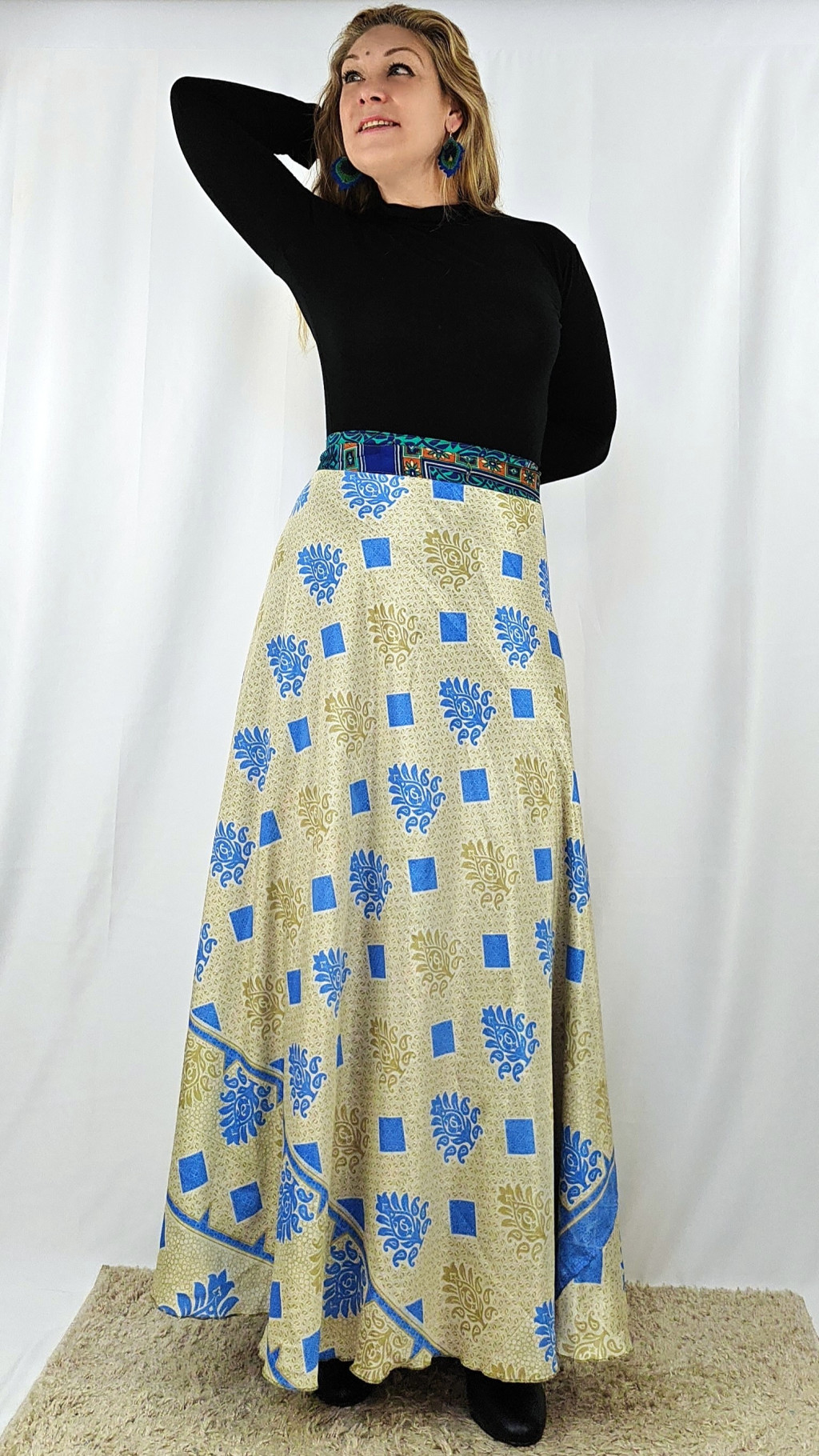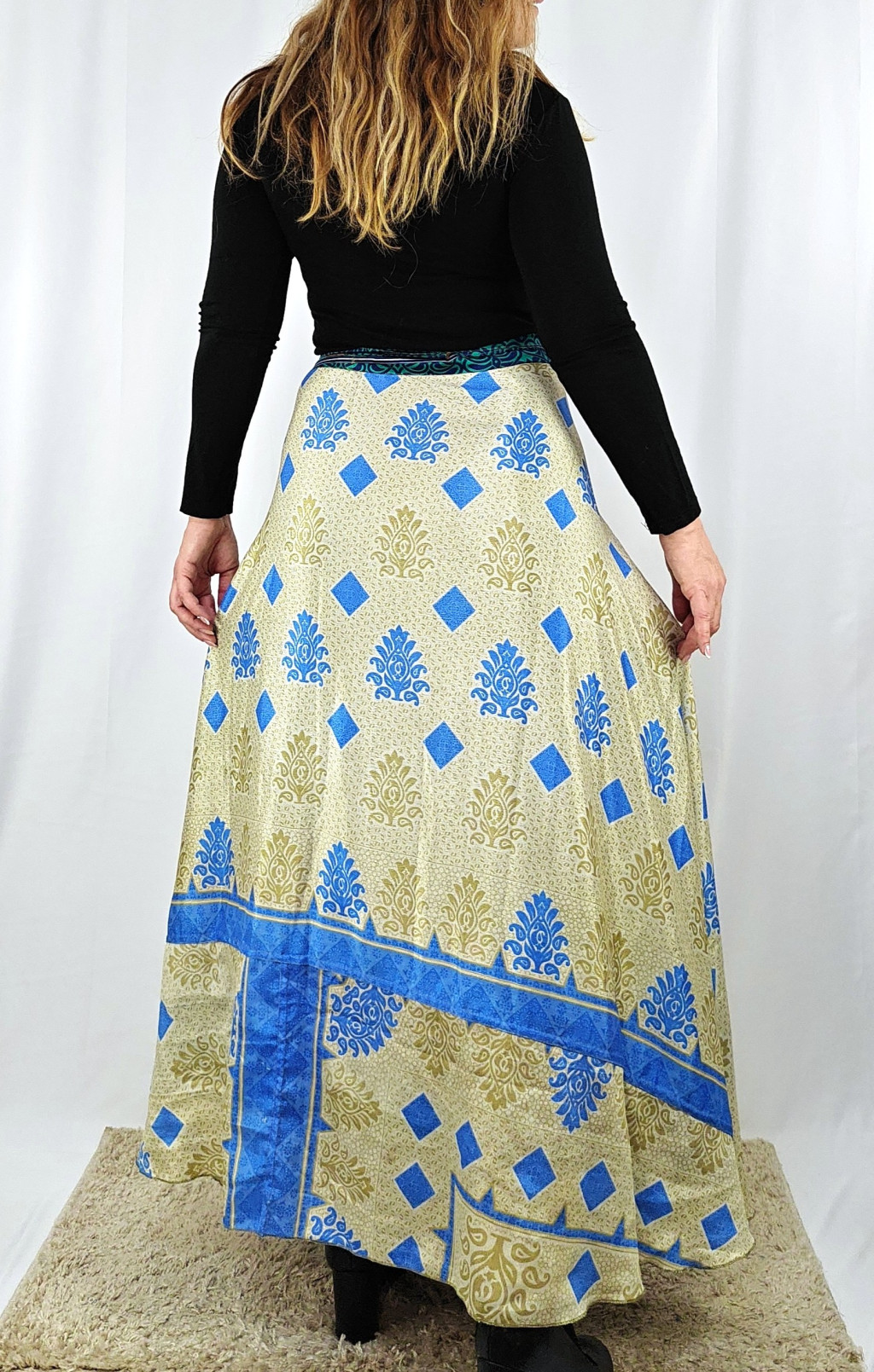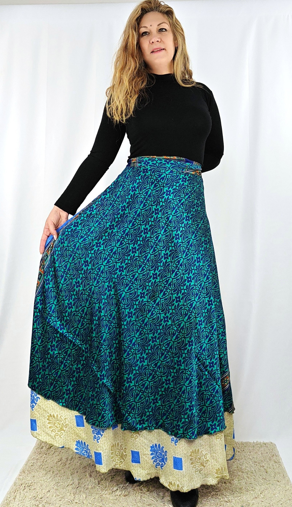 Lapszoknyáink újrahasznosított szárikból készülnek Indiában, egy hosszabb és egy rövidebb anyag derékban összevarrva! Két oldalú, kifordítható, mindkét oldala hordható, sokféleképpen köthető, variálható. Szoknyáinkból nincs két egyforma, mindegyikből csak EGY darab van, ha megtetszik, csapj le rá!