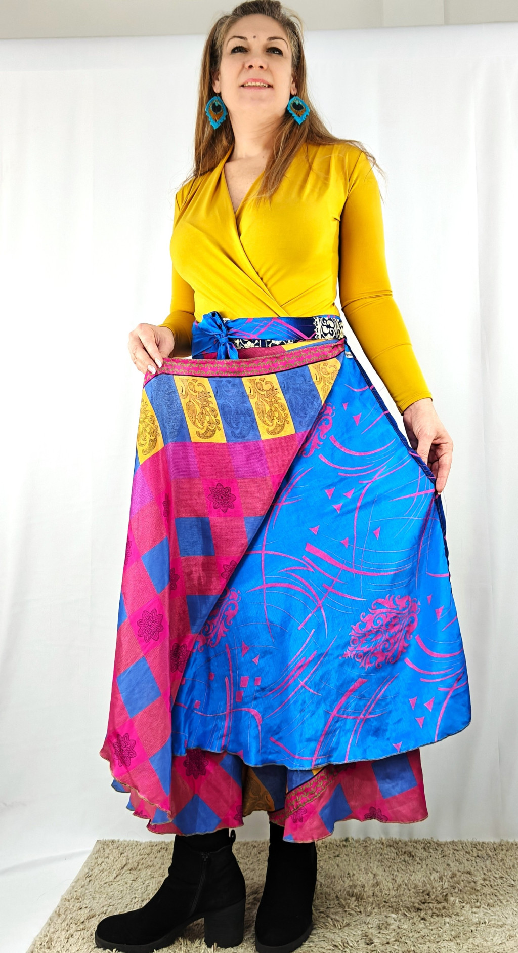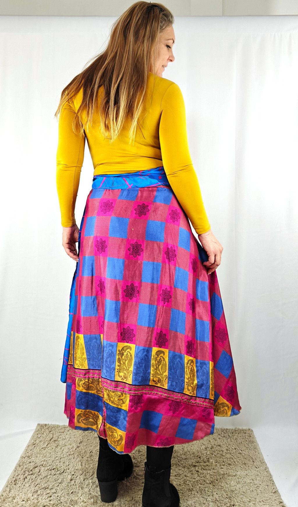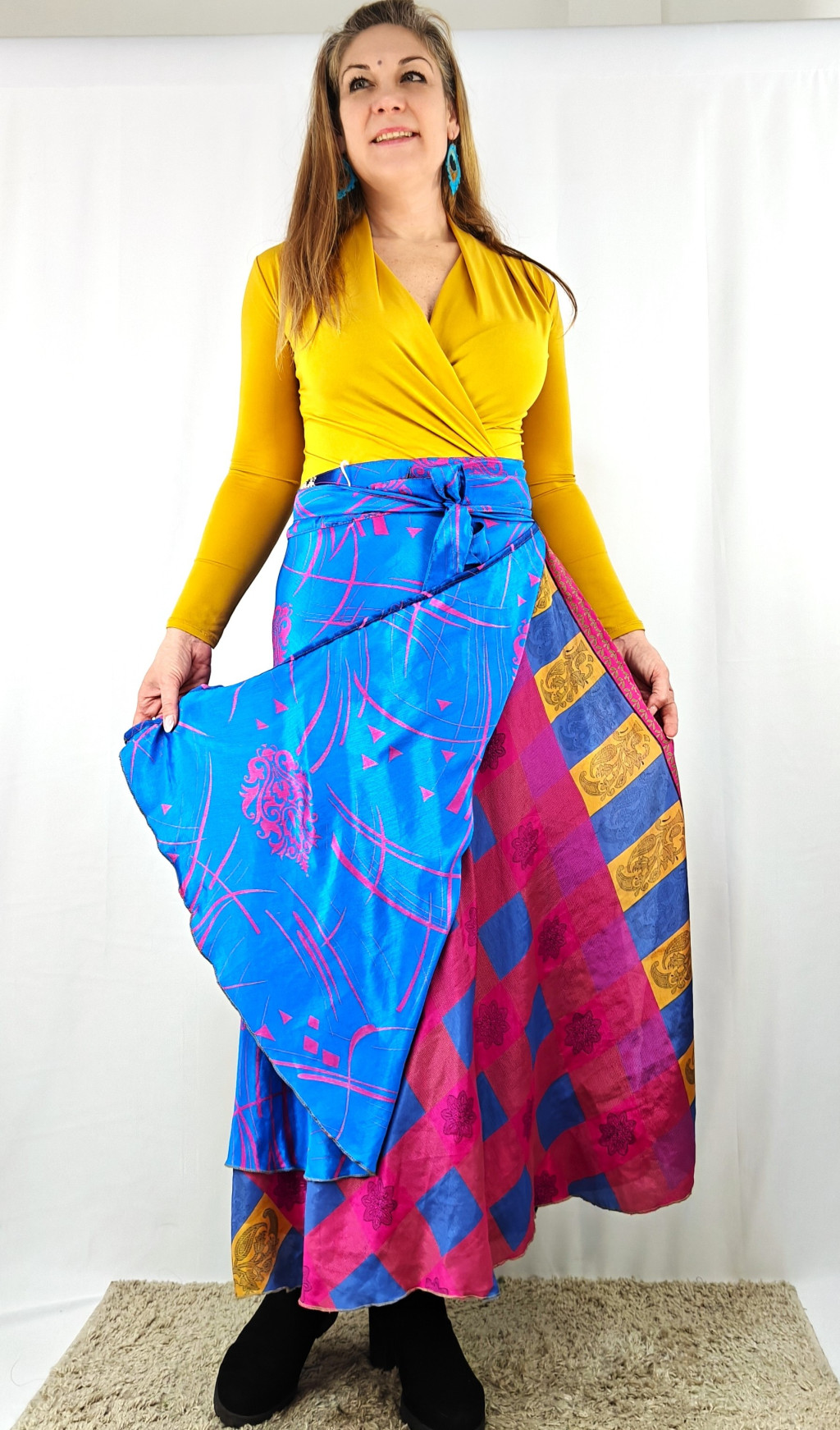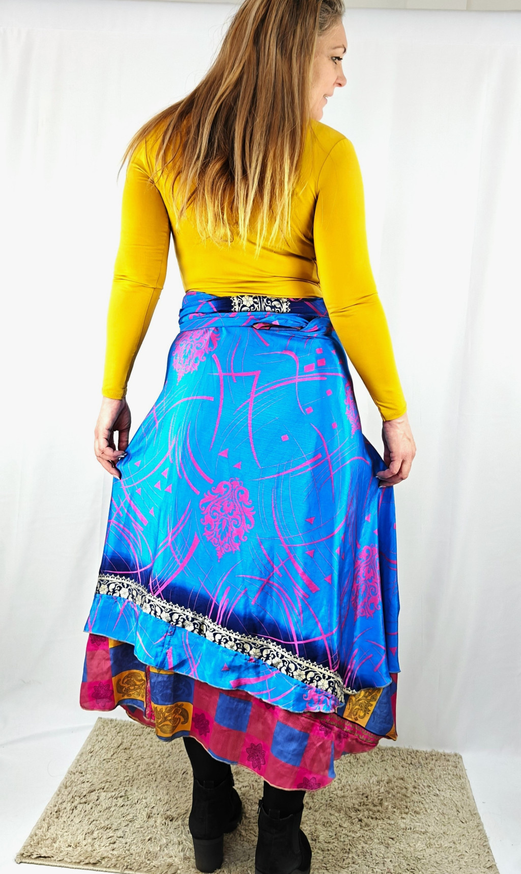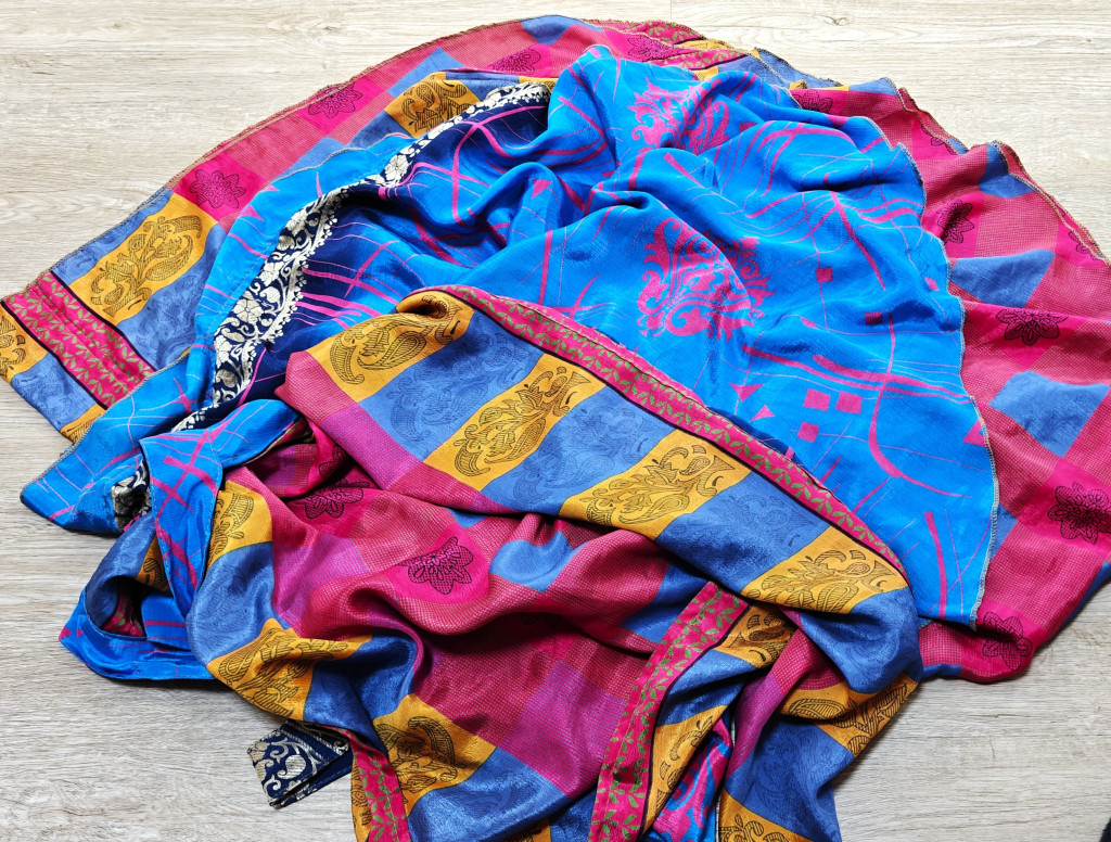 Lapszoknyáink újrahasznosított szárikból készülnek Indiában, egy hosszabb és egy rövidebb anyag derékban összevarrva! Két oldalú, kifordítható, mindkét oldala hordható, sokféleképpen köthető, variálható. Szoknyáinkból nincs két egyforma, mindegyikből csak EGY darab van, ha megtetszik, csapj le rá!