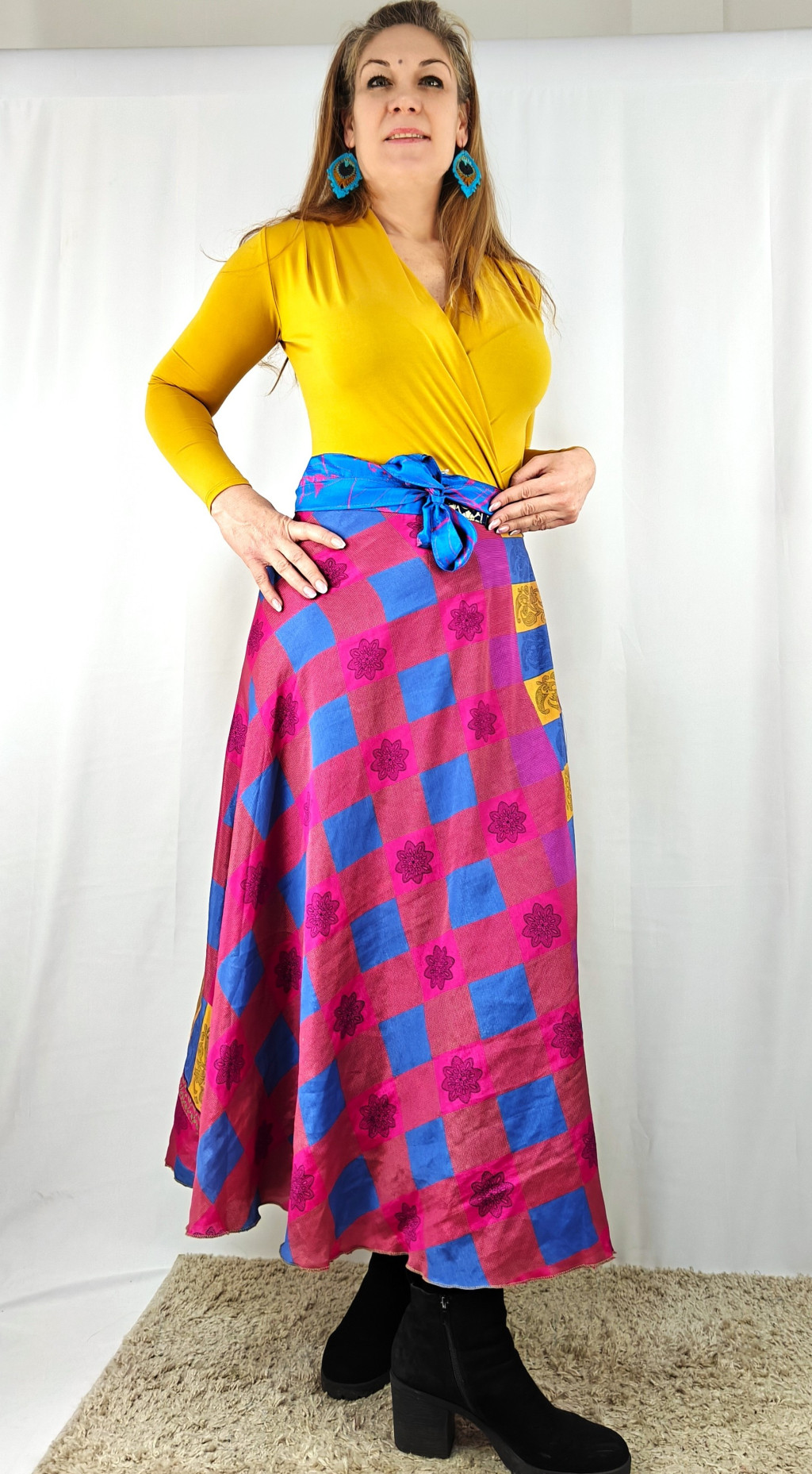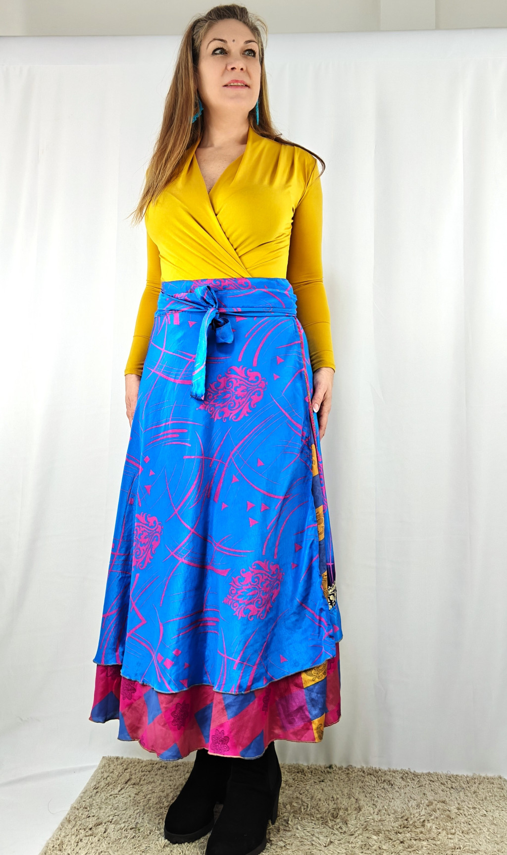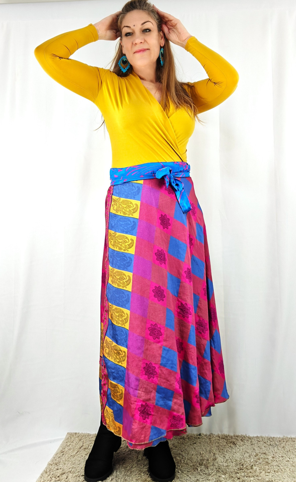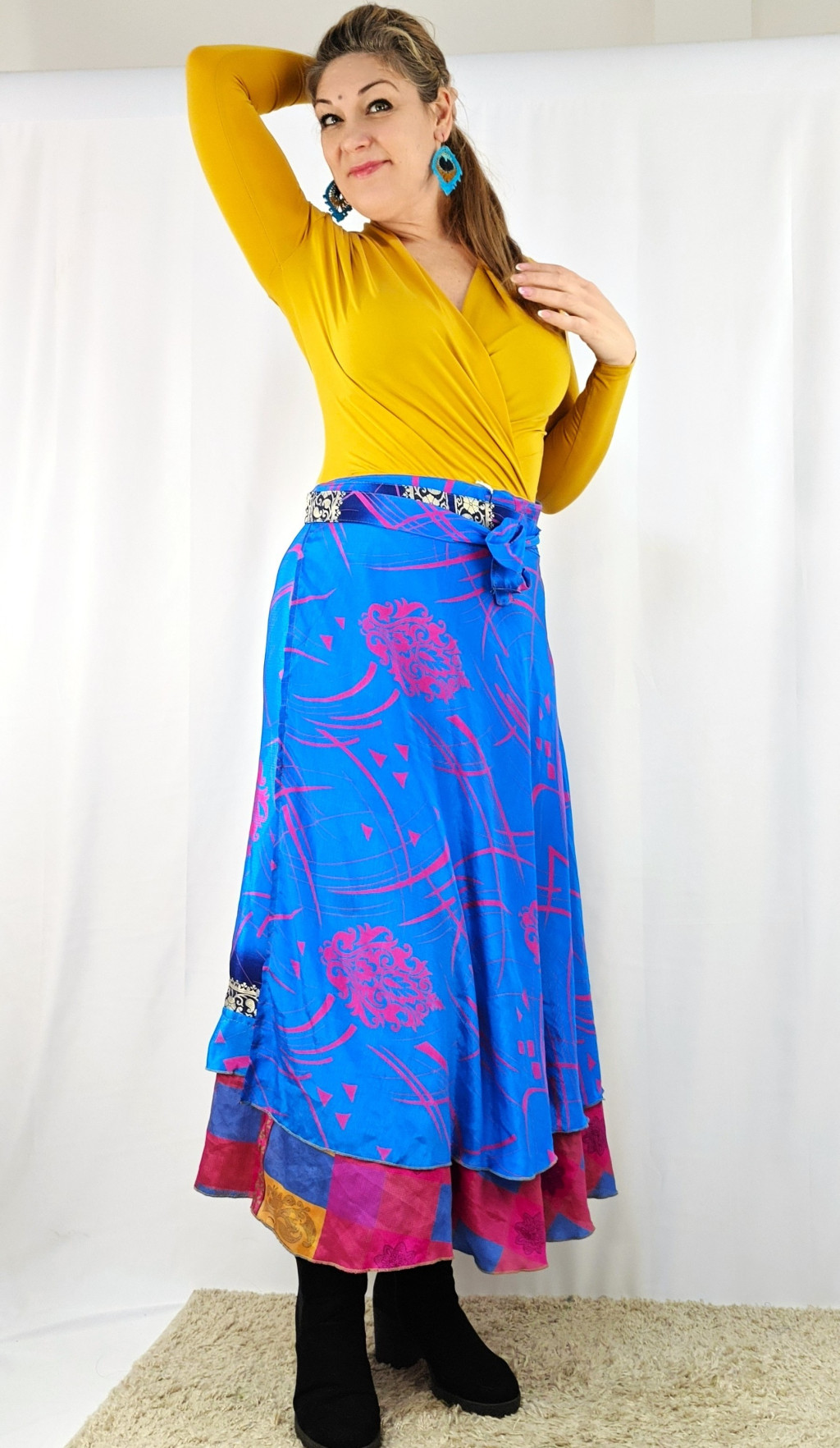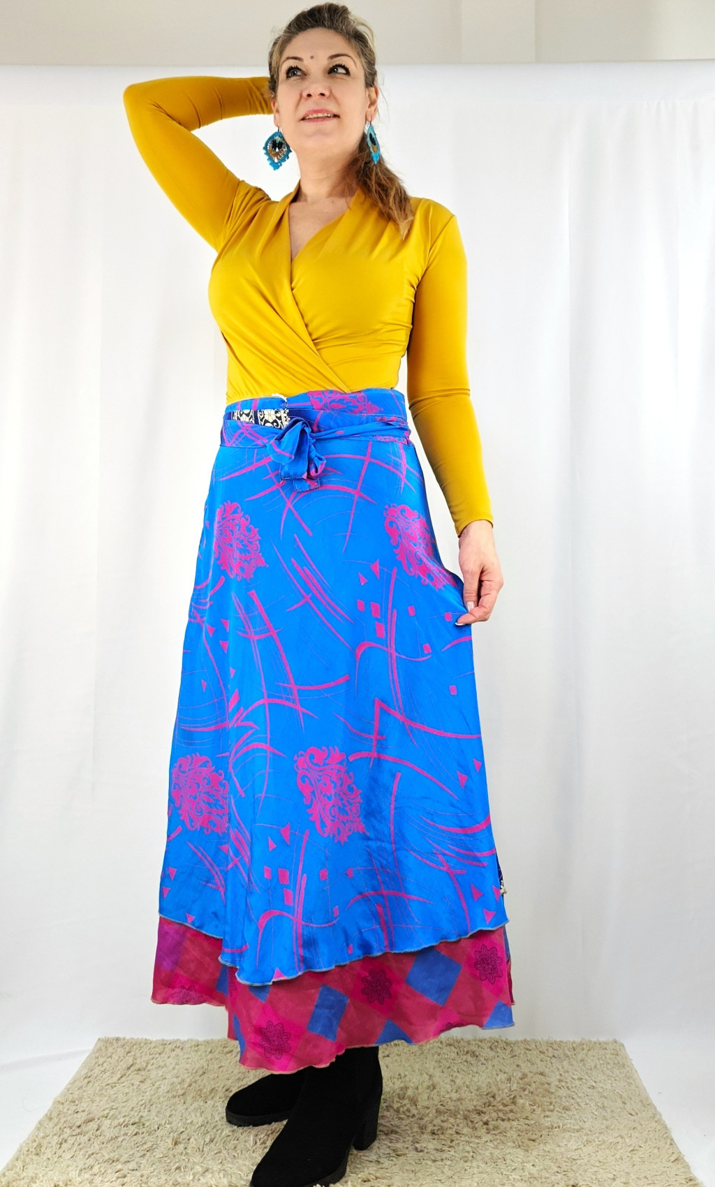 Lapszoknyáink újrahasznosított szárikból készülnek Indiában, egy hosszabb és egy rövidebb anyag derékban összevarrva! Két oldalú, kifordítható, mindkét oldala hordható, sokféleképpen köthető, variálható. Szoknyáinkból nincs két egyforma, mindegyikből csak EGY darab van, ha megtetszik, csapj le rá!