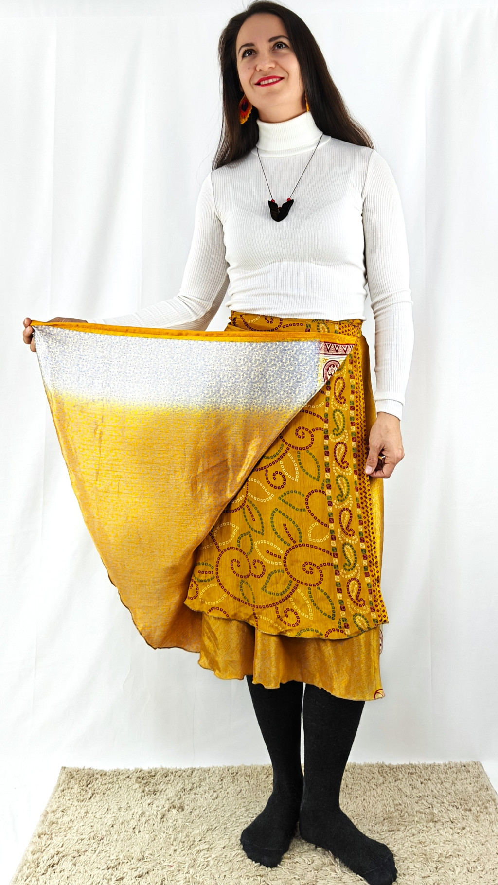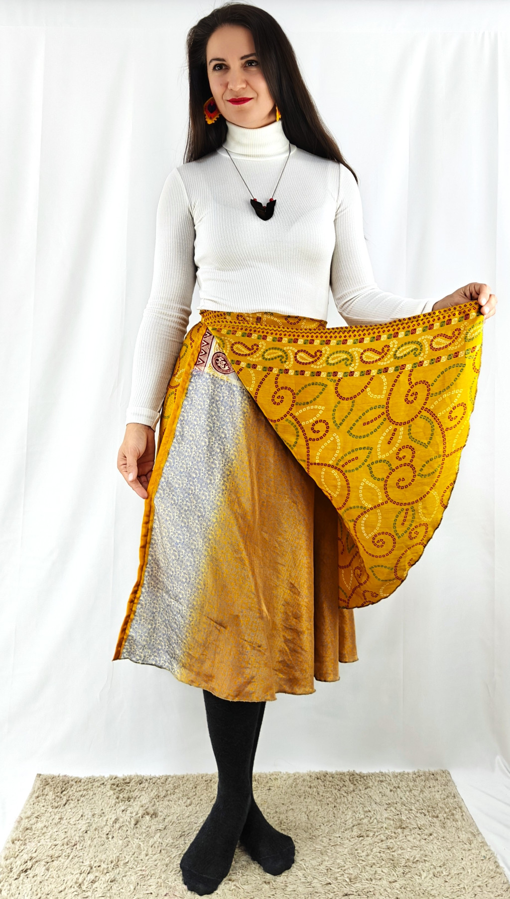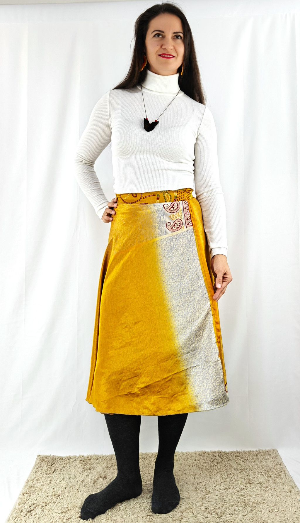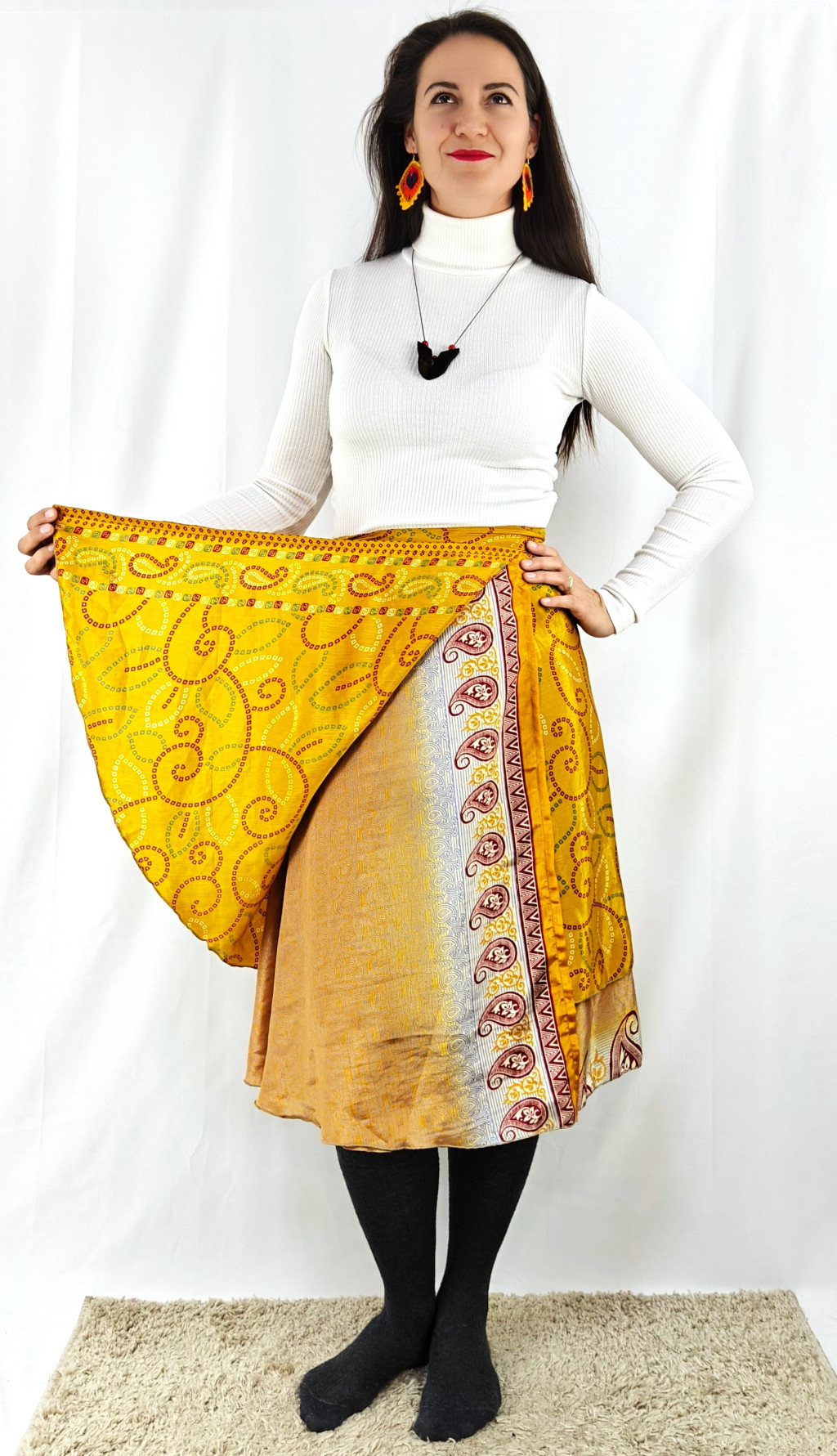 Lapszoknyáink újrahasznosított szárikból készülnek Indiában, egy hosszabb és egy rövidebb anyag derékban összevarrva! Két oldalú, kifordítható, mindkét oldala hordható, sokféleképpen köthető, variálható. Szoknyáinkból nincs két egyforma, mindegyikből csak EGY darab van, ha megtetszik, csapj le rá!