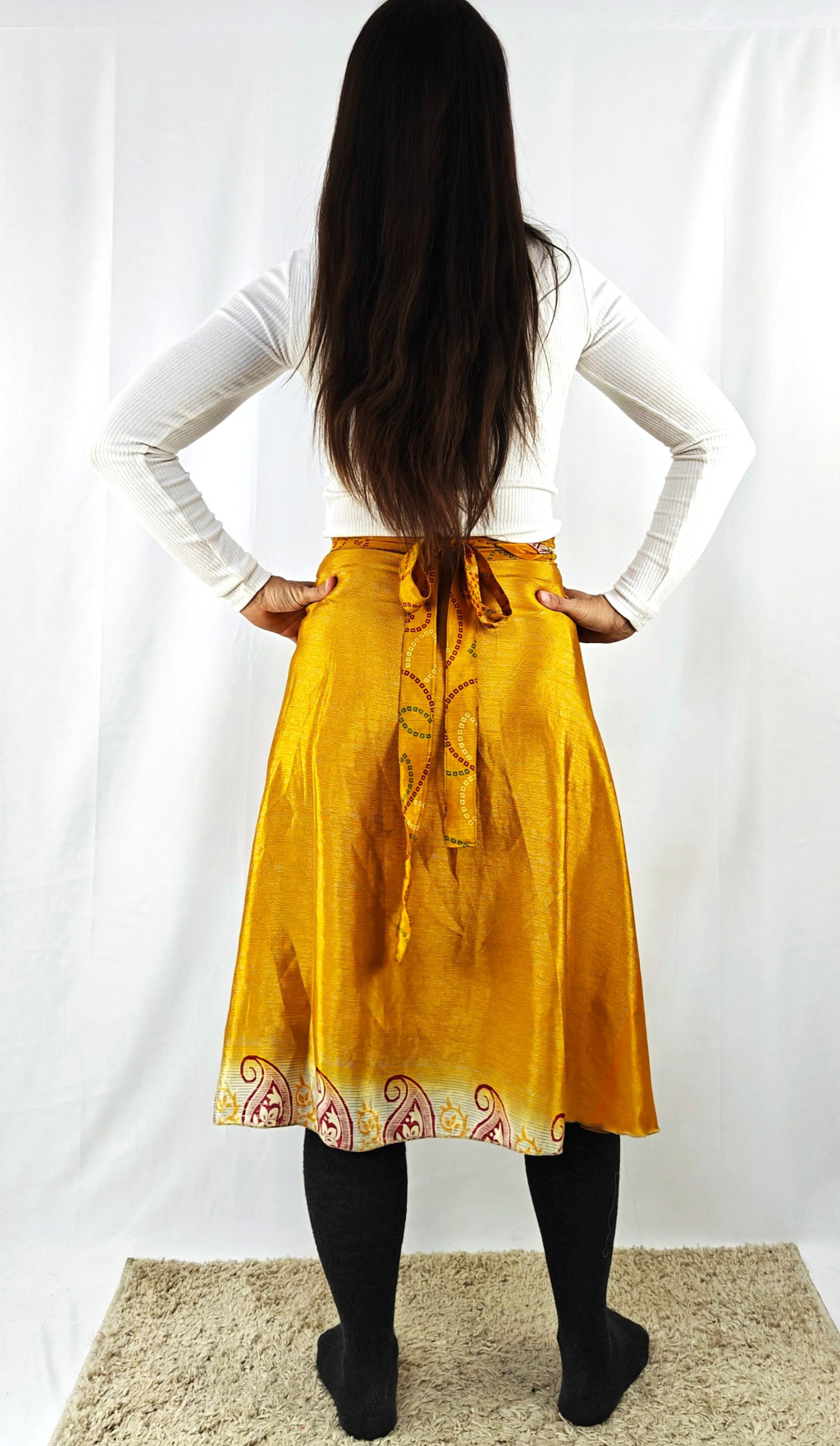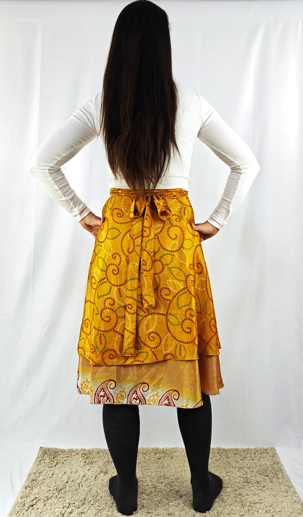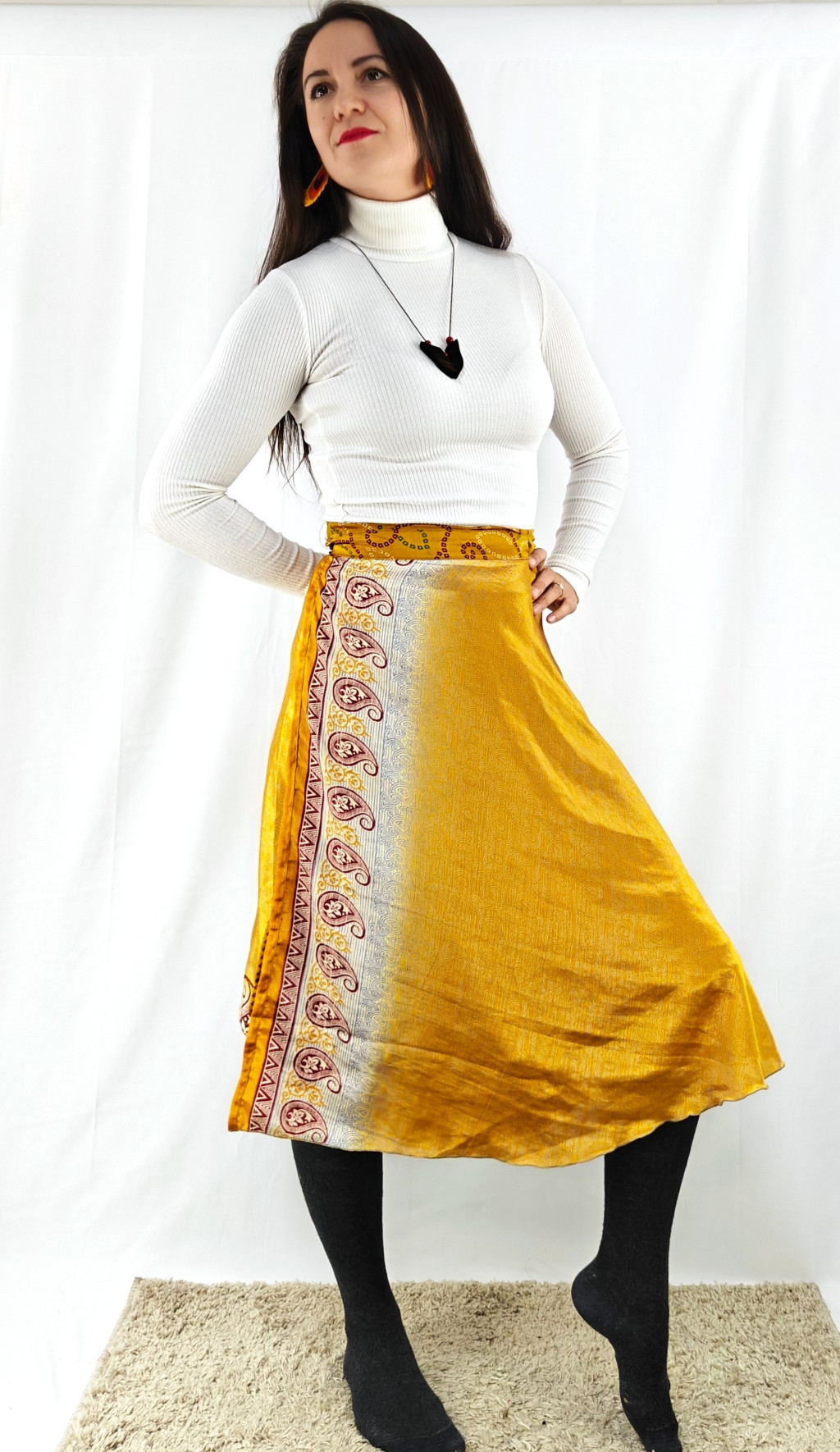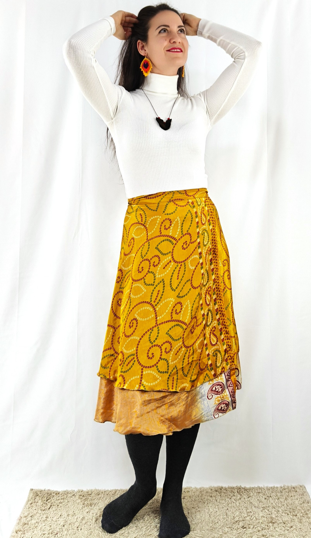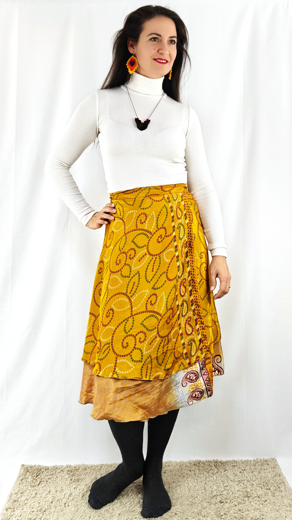 Lapszoknyáink újrahasznosított szárikból készülnek Indiában, egy hosszabb és egy rövidebb anyag derékban összevarrva! Két oldalú, kifordítható, mindkét oldala hordható, sokféleképpen köthető, variálható. Szoknyáinkból nincs két egyforma, mindegyikből csak EGY darab van, ha megtetszik, csapj le rá!