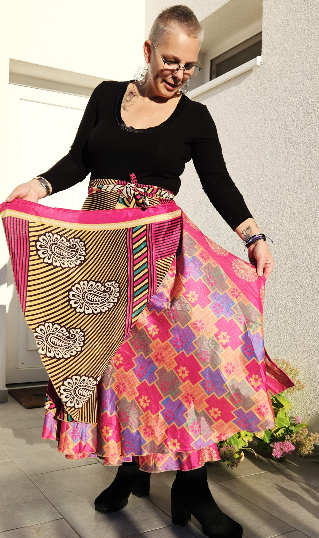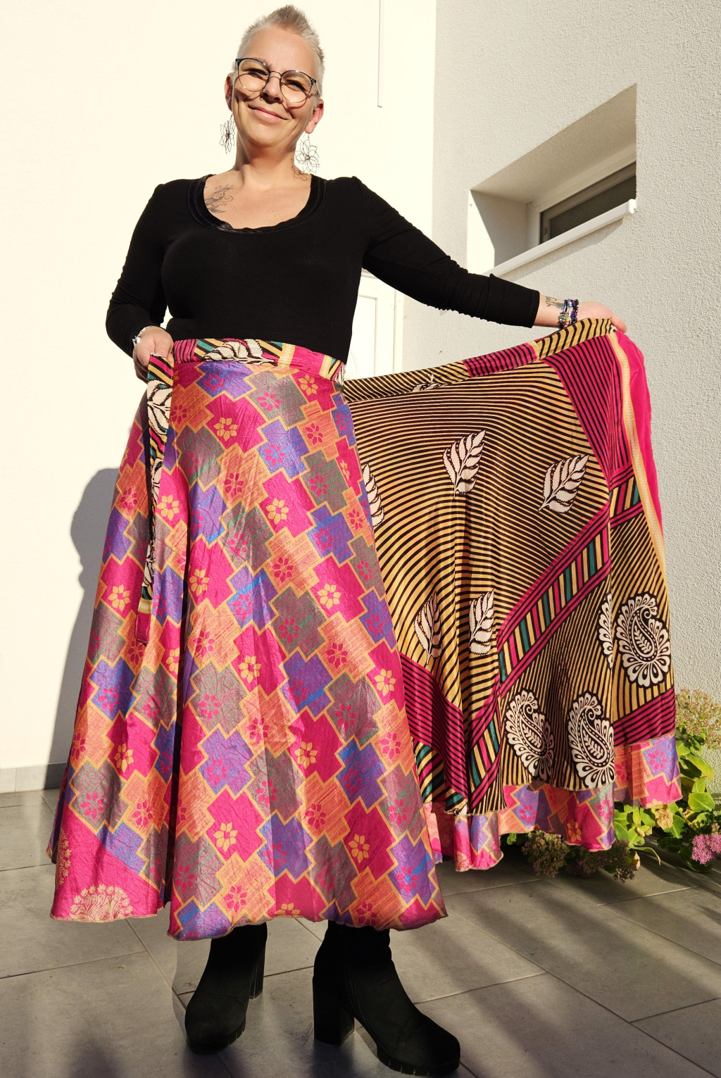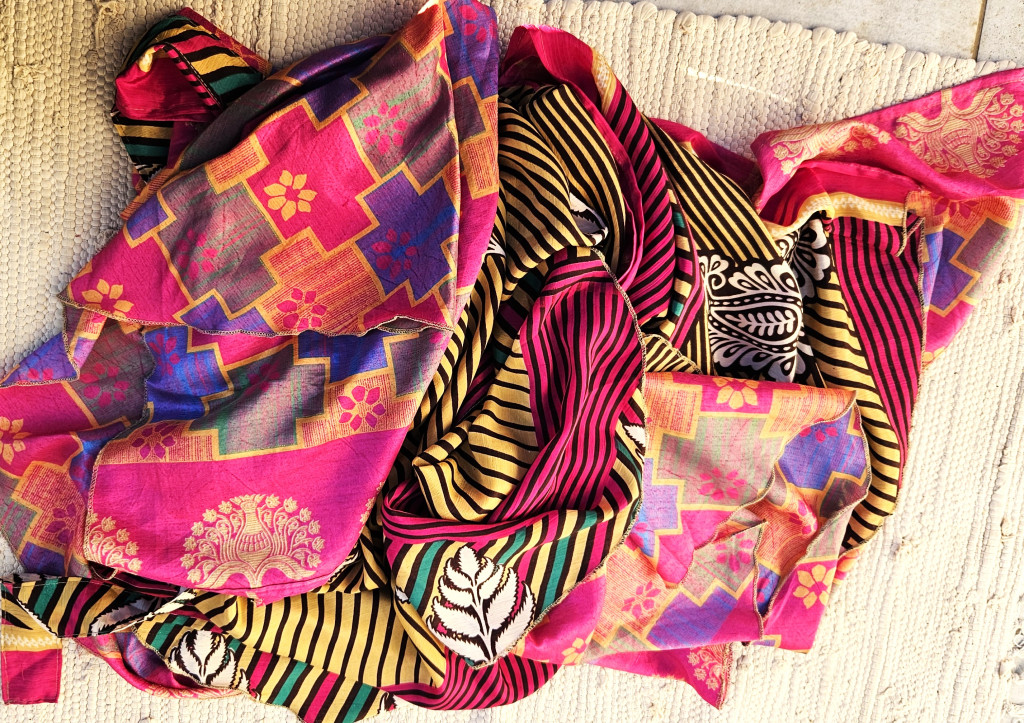 Lapszoknyáink újrahasznosított szárikból készülnek Indiában, egy hosszabb és egy rövidebb anyag derékban összevarrva! Kifordítható, mindkét oldala hordható, sokféleképpen köthető, variálható. Szoknyáinkból nincs két egyforma, mindegyikből csak EGY darab van, ha megtetszik, csapj le rá!