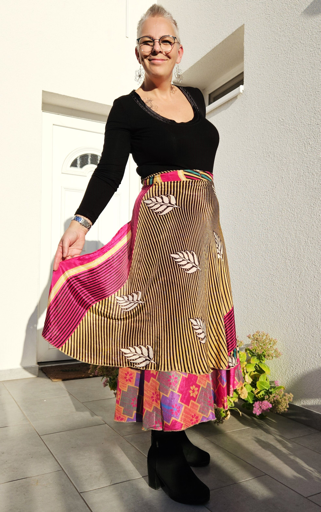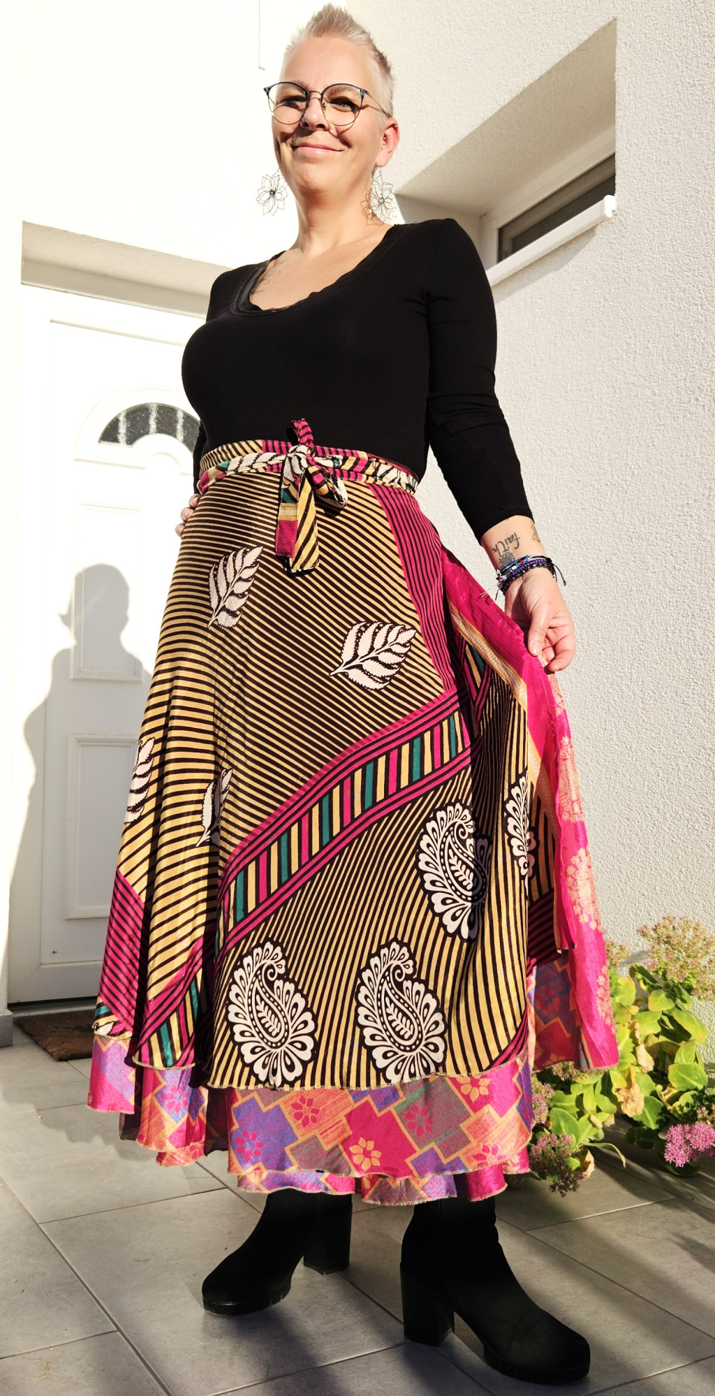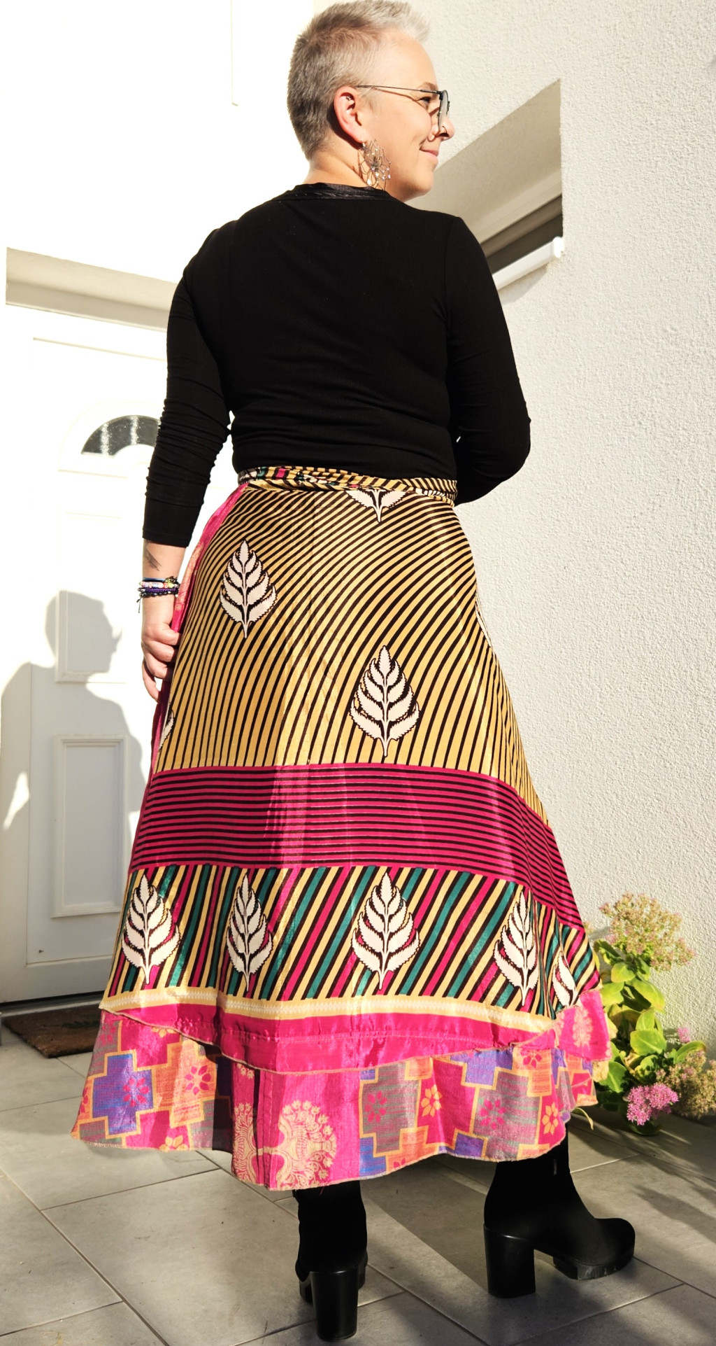 Lapszoknyáink újrahasznosított szárikból készülnek Indiában, egy hosszabb és egy rövidebb anyag derékban összevarrva! Kifordítható, mindkét oldala hordható, sokféleképpen köthető, variálható. Szoknyáinkból nincs két egyforma, mindegyikből csak EGY darab van, ha megtetszik, csapj le rá!