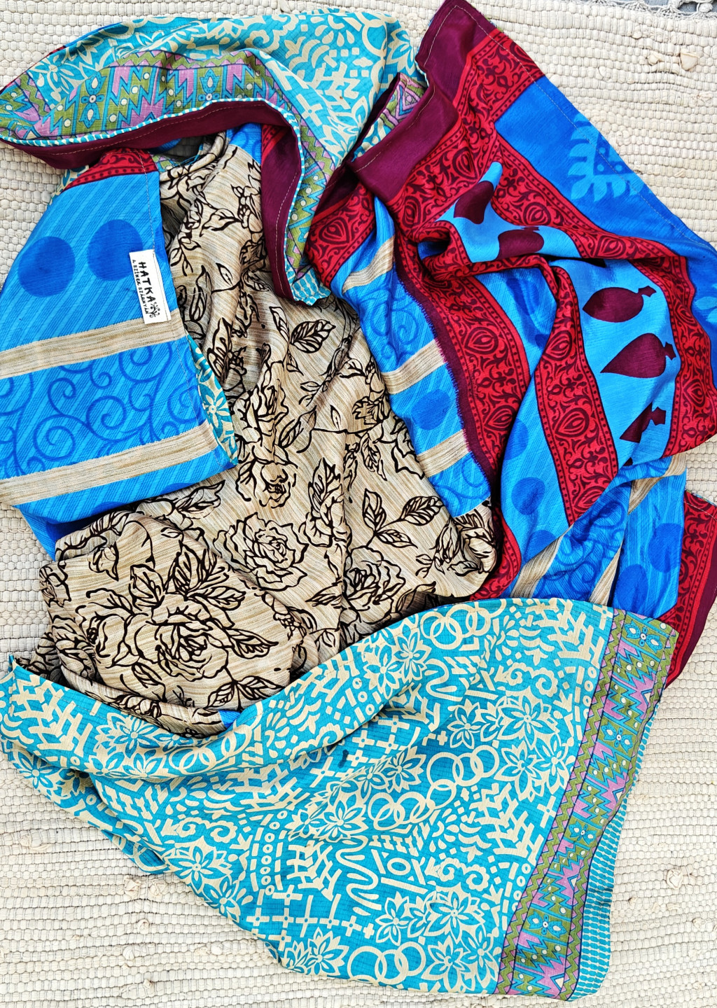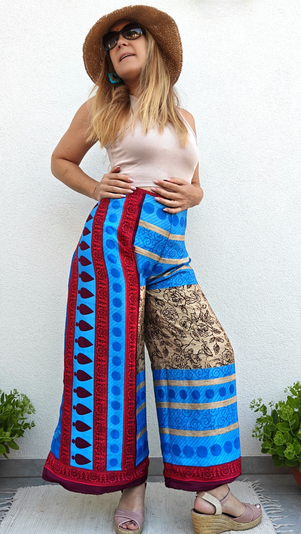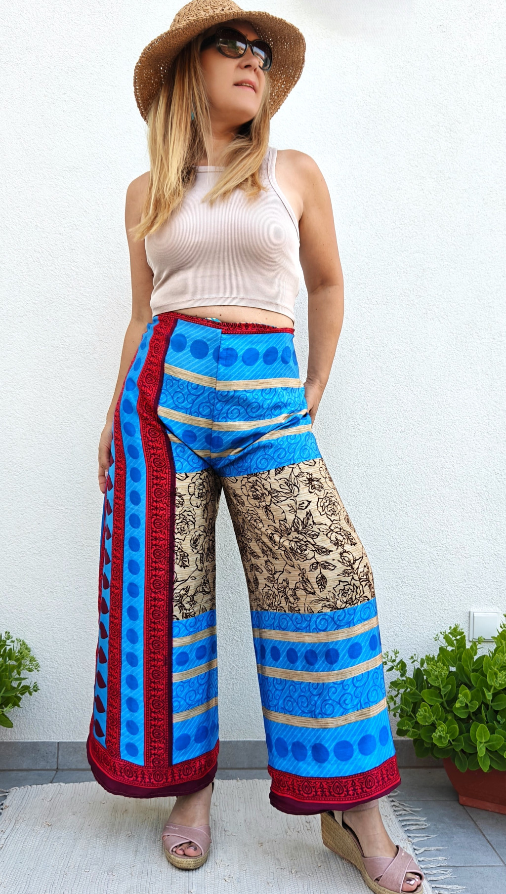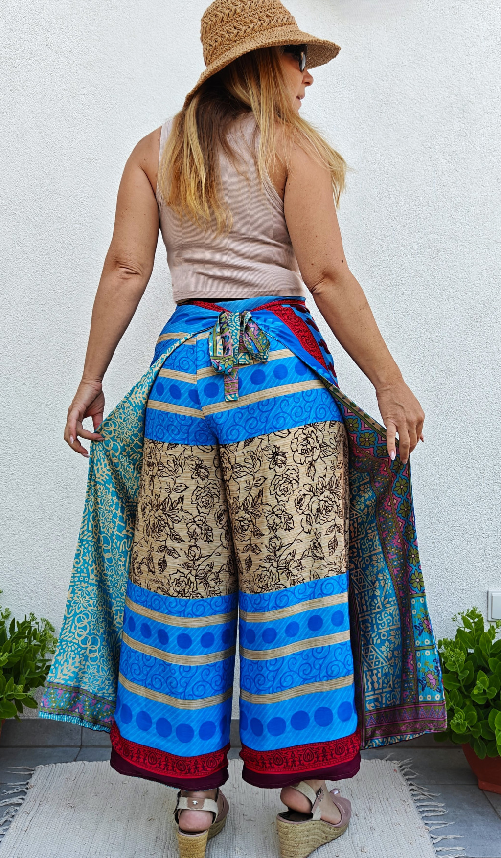 Lapnadrágjaink újrahasznosított szárikból készülnek Indiában. Két különböző csodás anyagot varrnak össze, így a külső és belső fele is hordható!