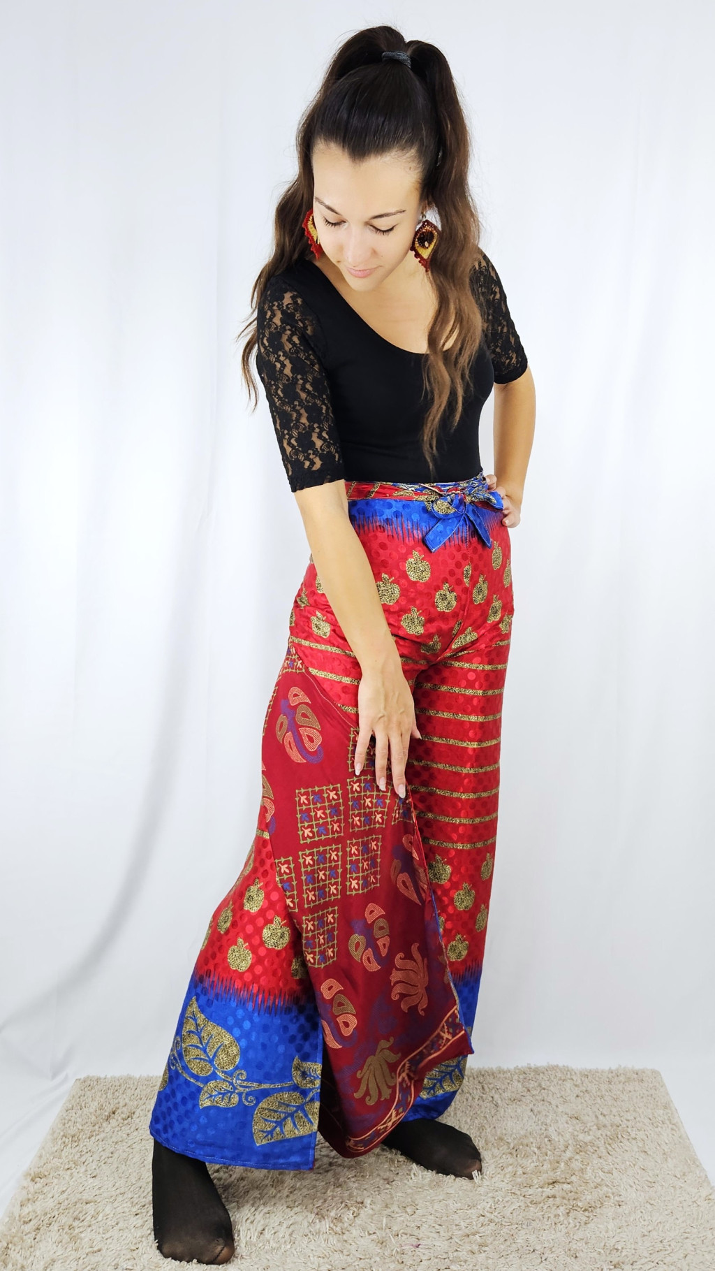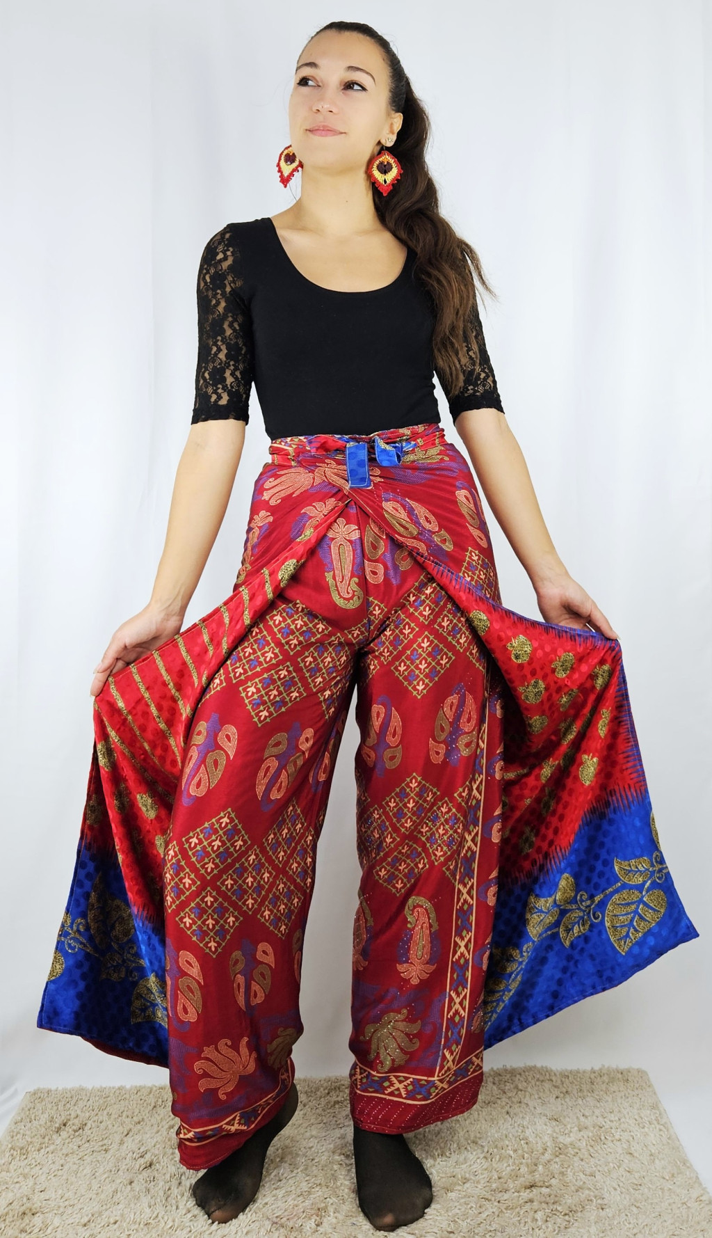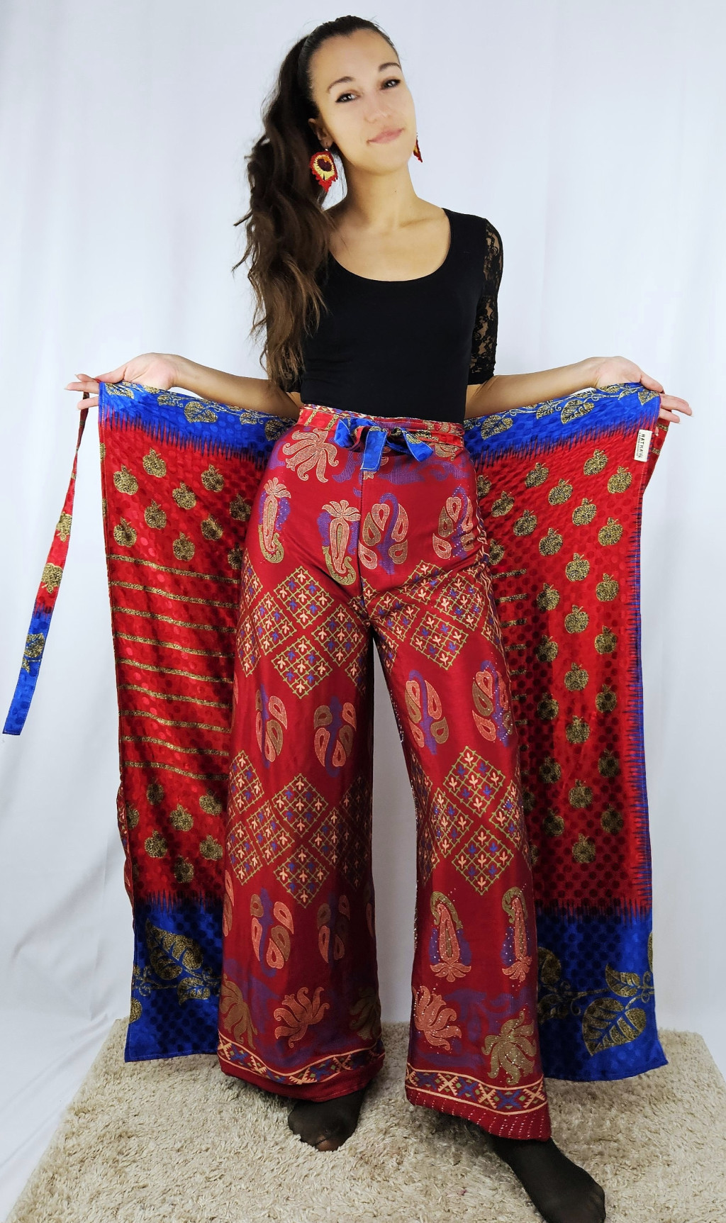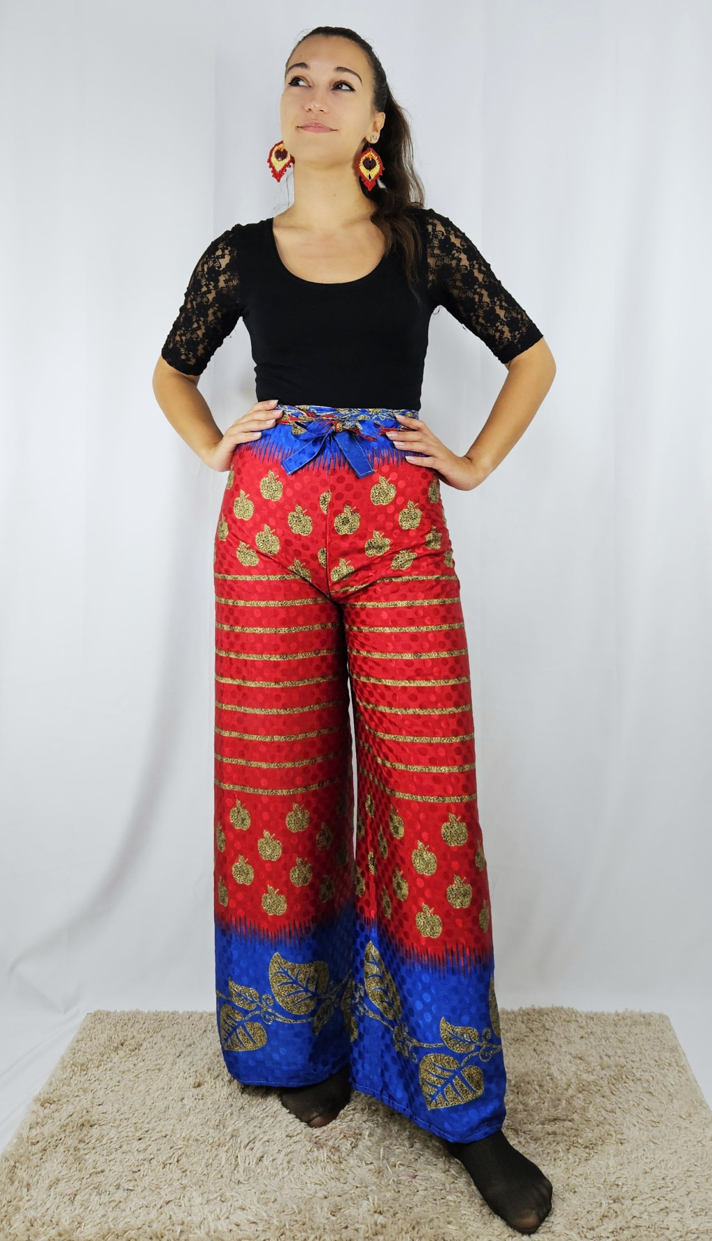 Lapnadrágjaink újrahasznosított szárikból készülnek Indiában. Két különböző csodás anyagot varrnak össze, így a külső és belső fele is hordható!