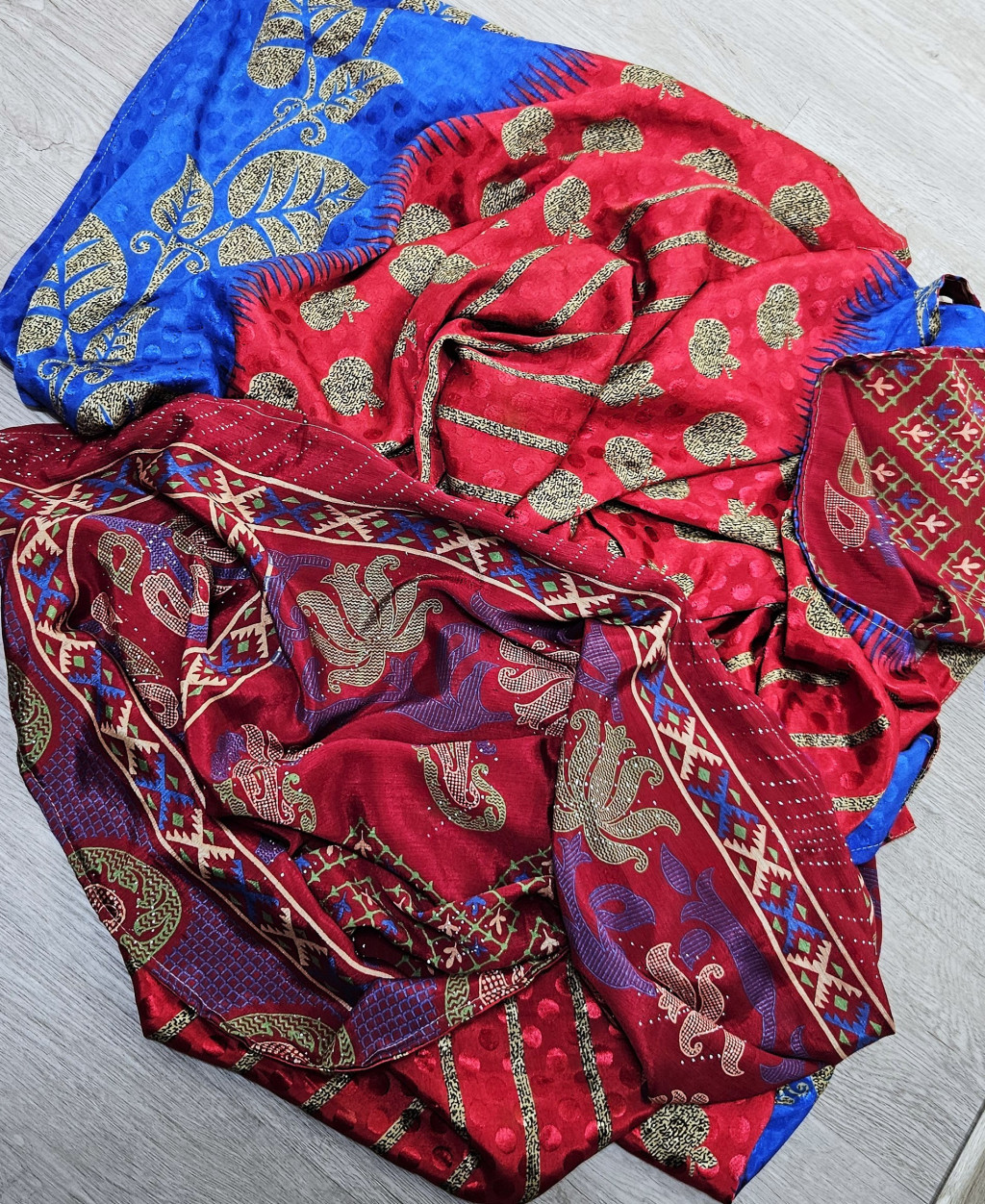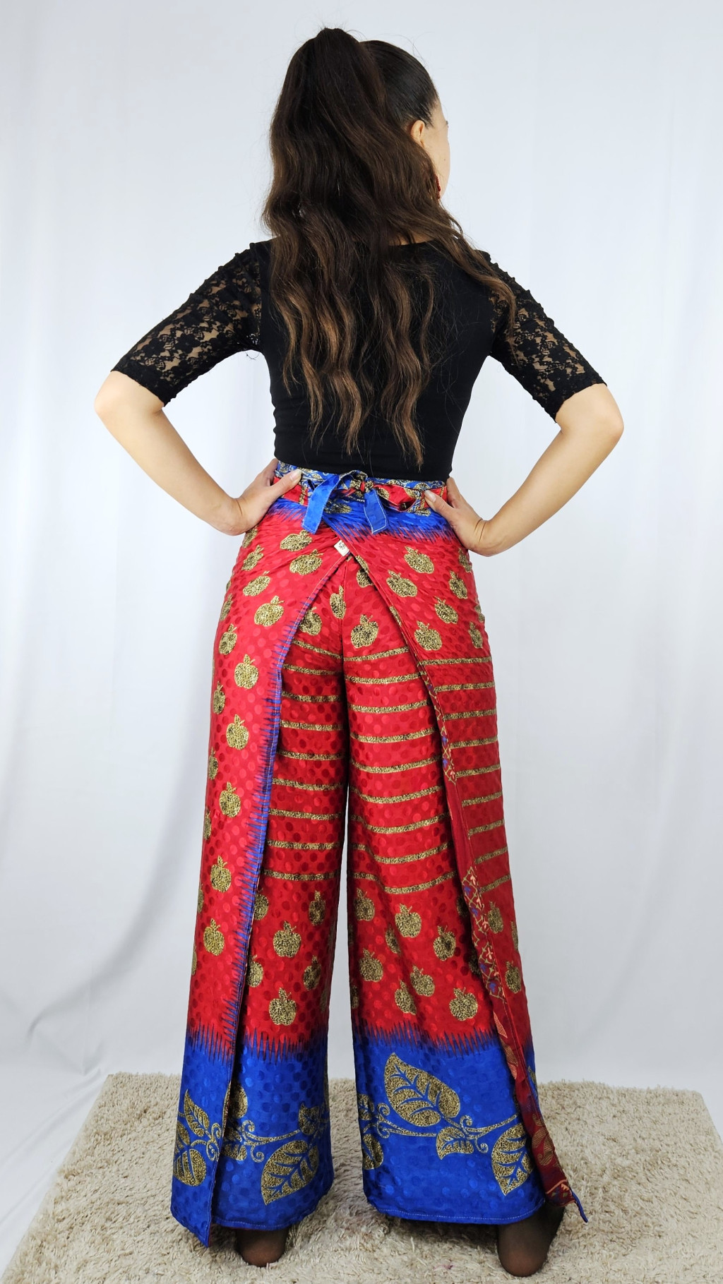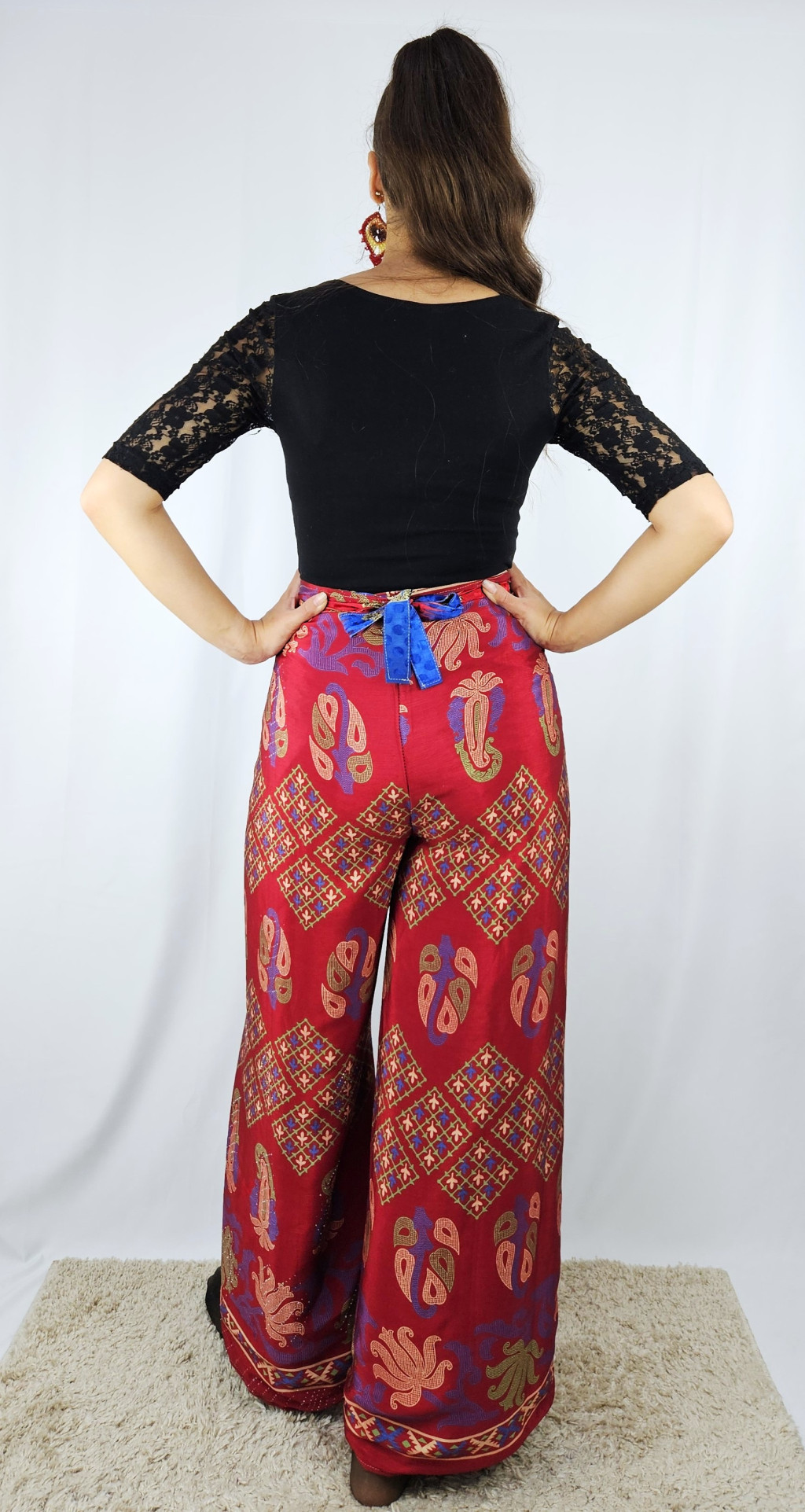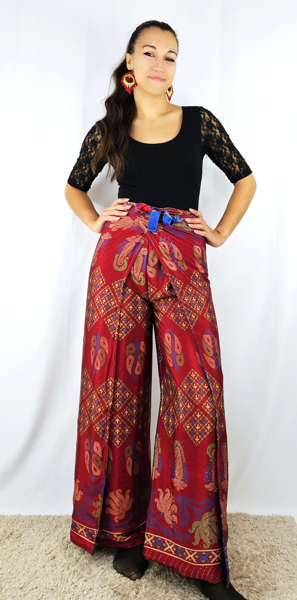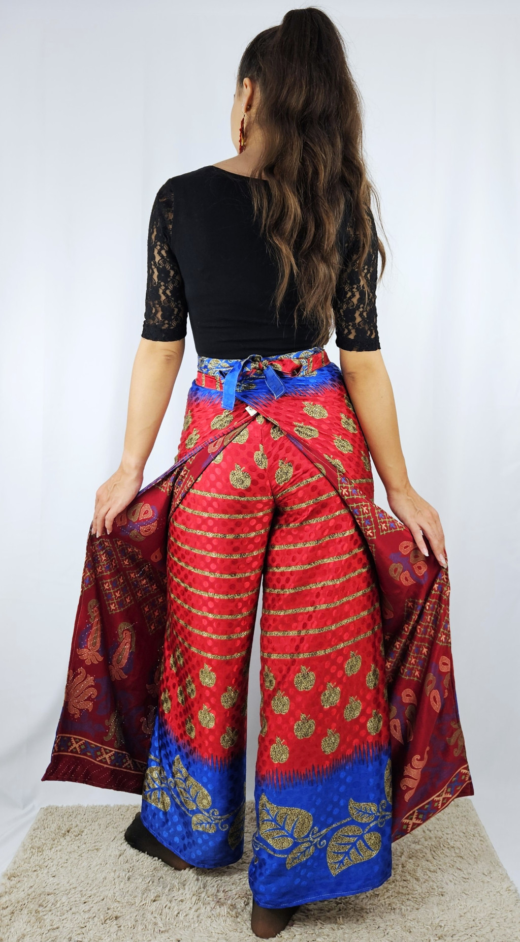 Lapnadrágjaink újrahasznosított szárikból készülnek Indiában. Két különböző csodás anyagot varrnak össze, így a külső és belső fele is hordható!
