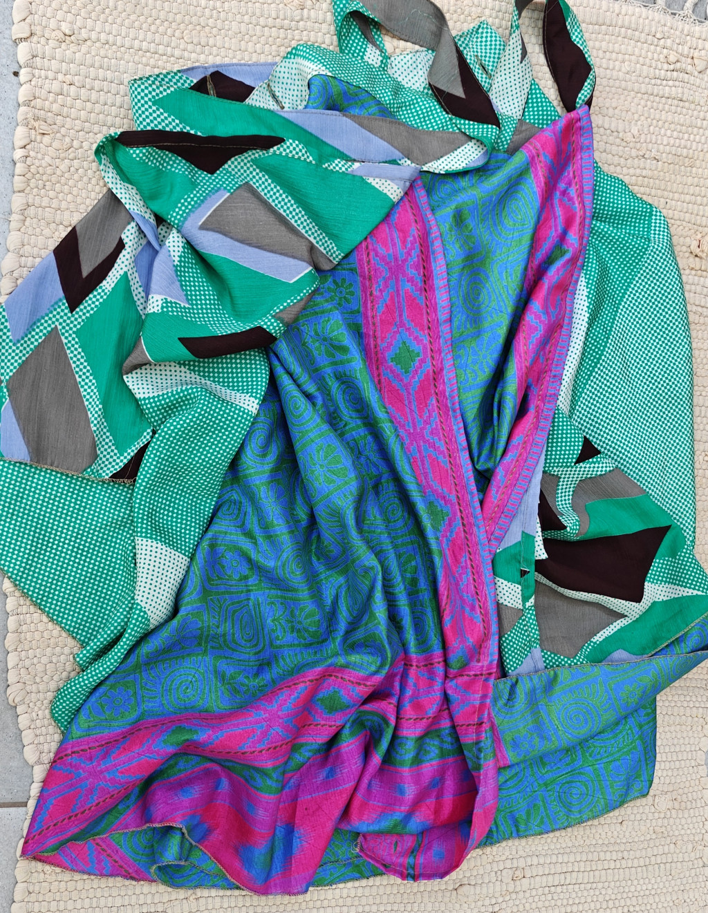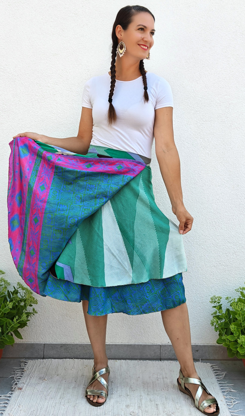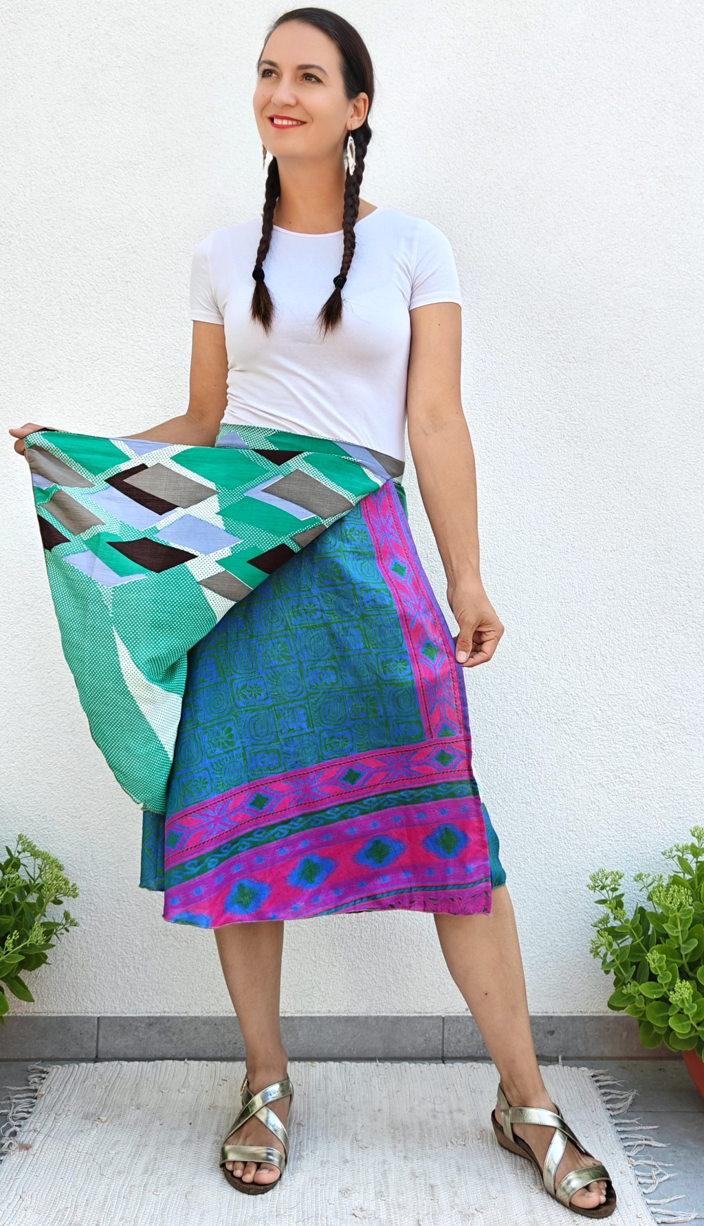 Lapszoknyáink újrahasznosított szárikból készülnek Indiában, egy hosszabb és egy rövidebb anyag derékban összevarrva! Két oldalú, kifordítható, mindkét oldala hordható, sokféleképpen köthető, variálható. Szoknyáinkból nincs két egyforma, mindegyikből csak EGY darab van, ha megtetszik, csapj le rá!