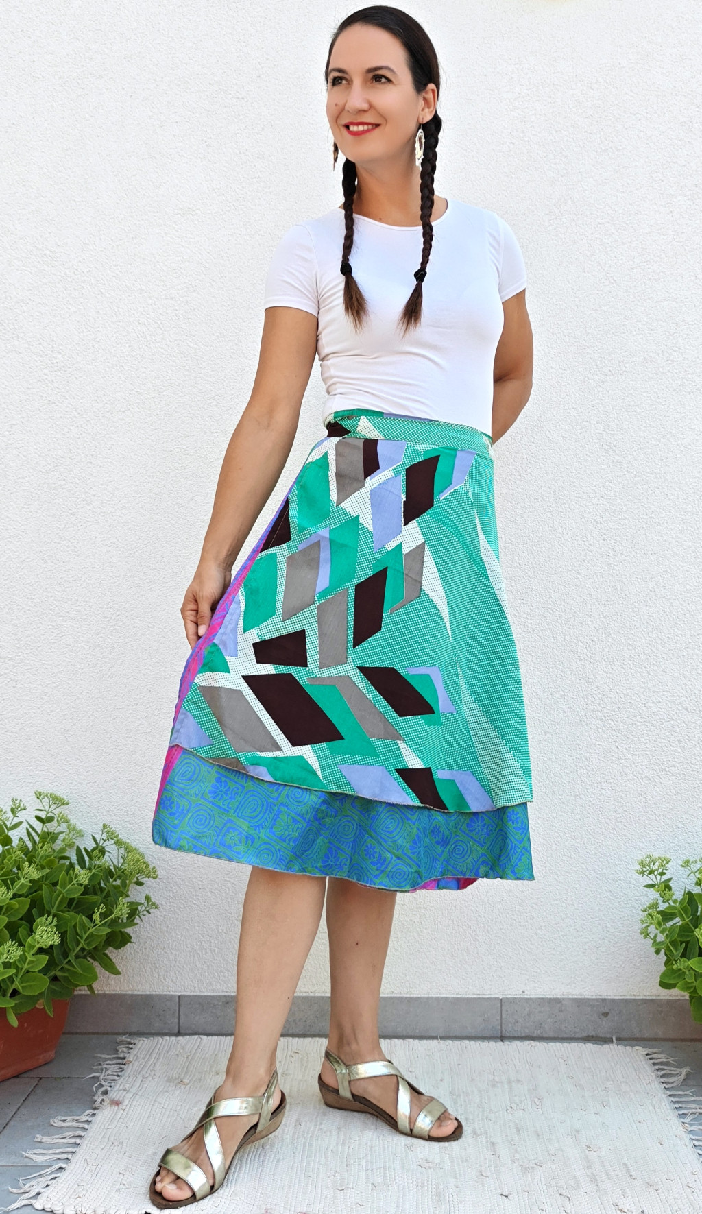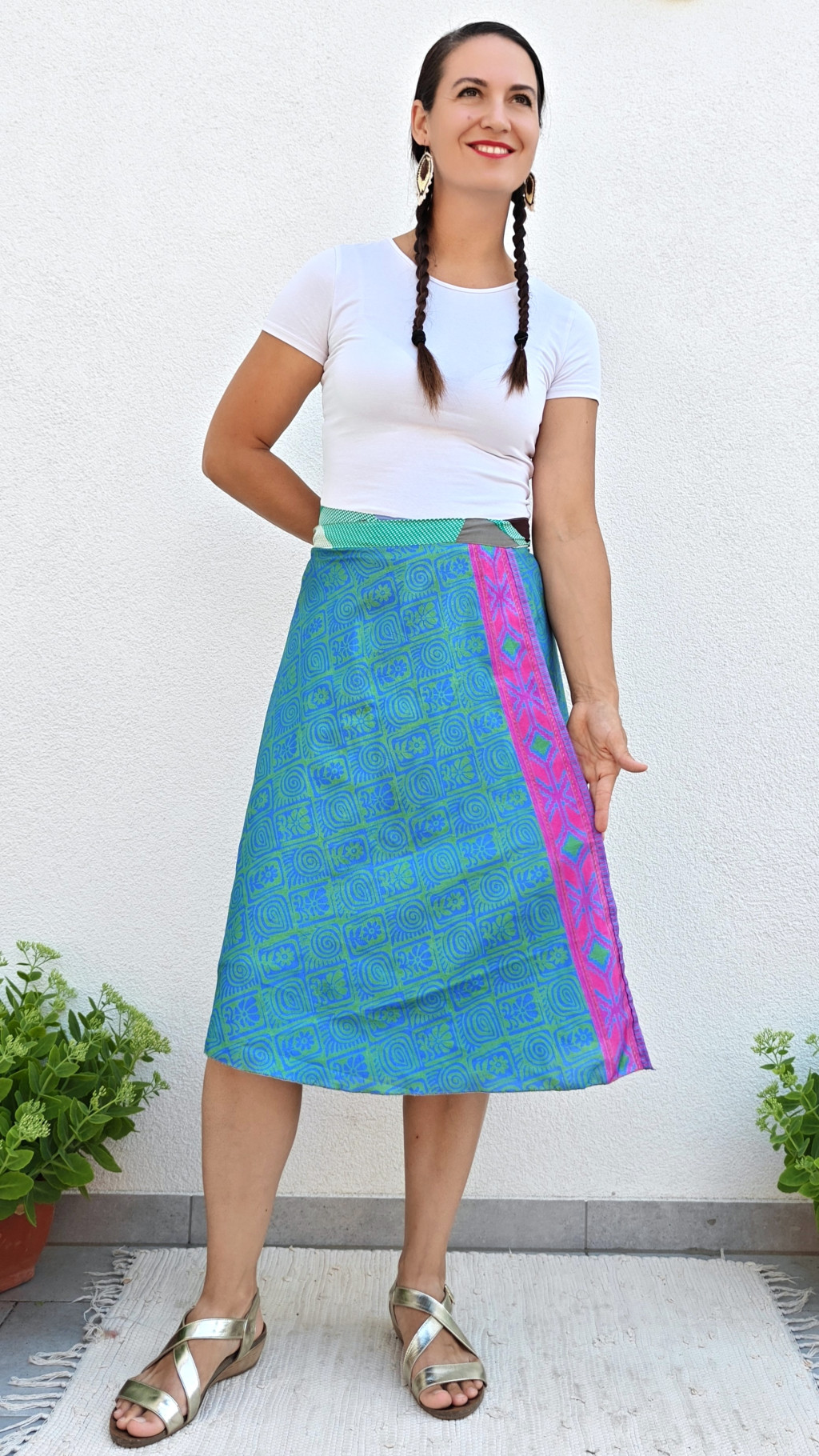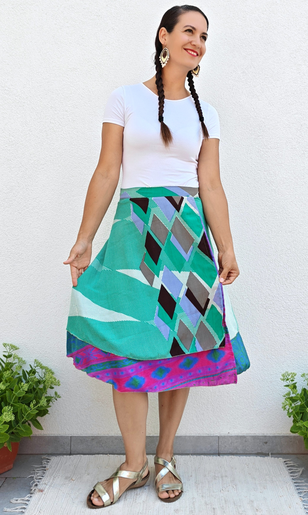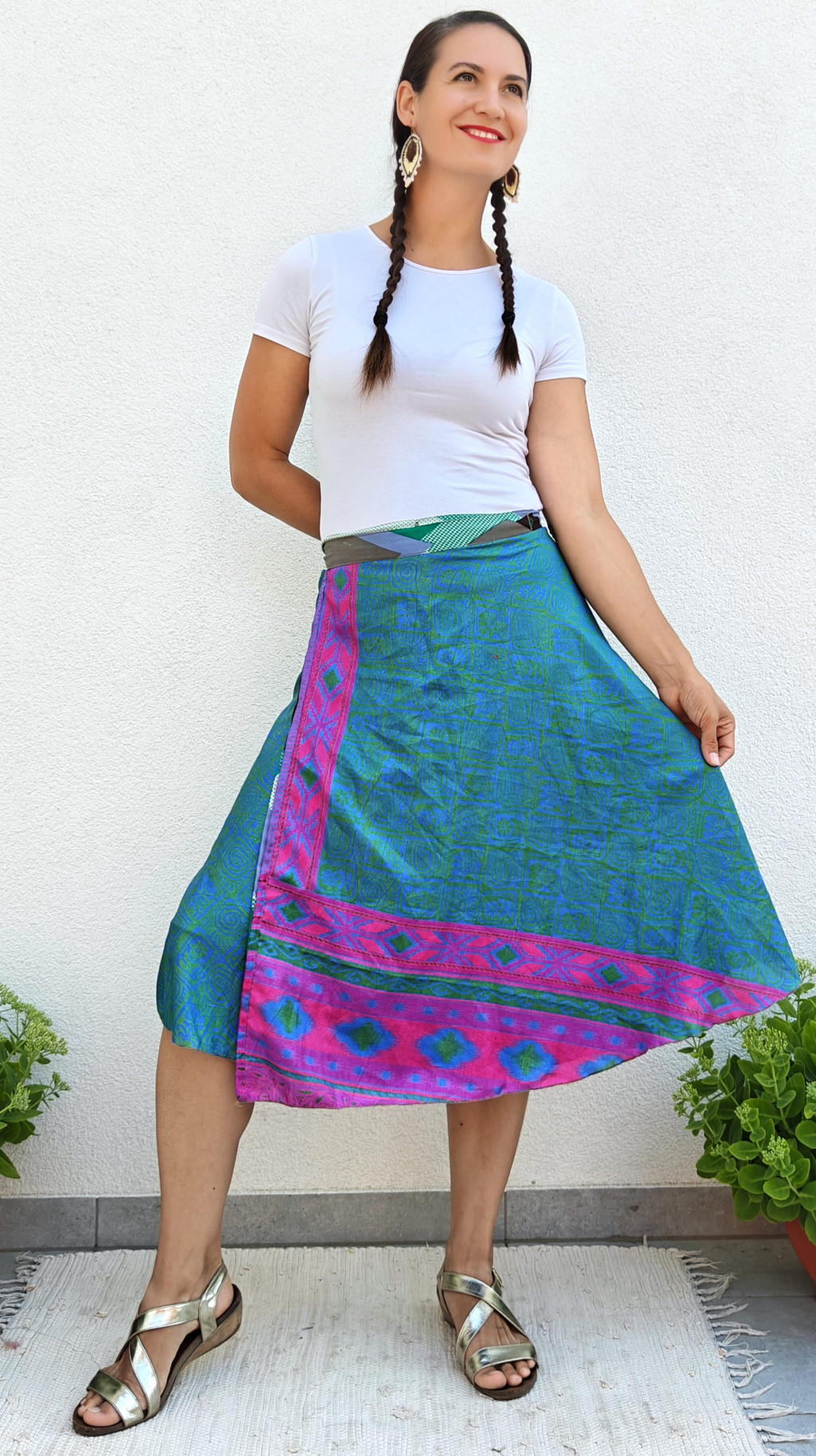 Lapszoknyáink újrahasznosított szárikból készülnek Indiában, egy hosszabb és egy rövidebb anyag derékban összevarrva! Két oldalú, kifordítható, mindkét oldala hordható, sokféleképpen köthető, variálható. Szoknyáinkból nincs két egyforma, mindegyikből csak EGY darab van, ha megtetszik, csapj le rá!