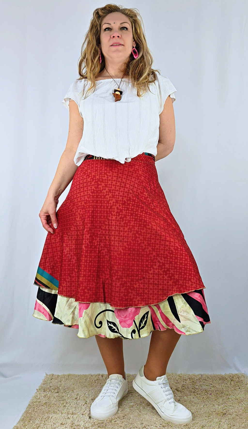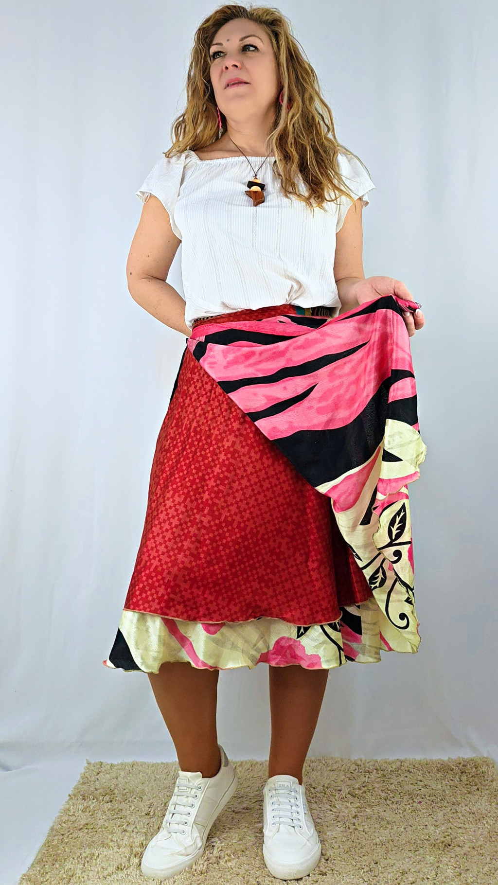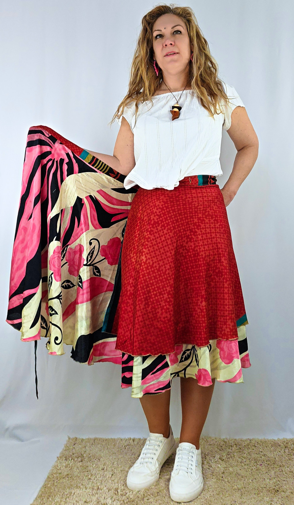 Lapszoknyáink újrahasznosított szárikból készülnek Indiában, egy hosszabb és egy rövidebb anyag derékban összevarrva! Két oldalú, kifordítható, mindkét oldala hordható, sokféleképpen köthető, variálható. Szoknyáinkból nincs két egyforma, mindegyikből csak EGY darab van, ha megtetszik, csapj le rá!