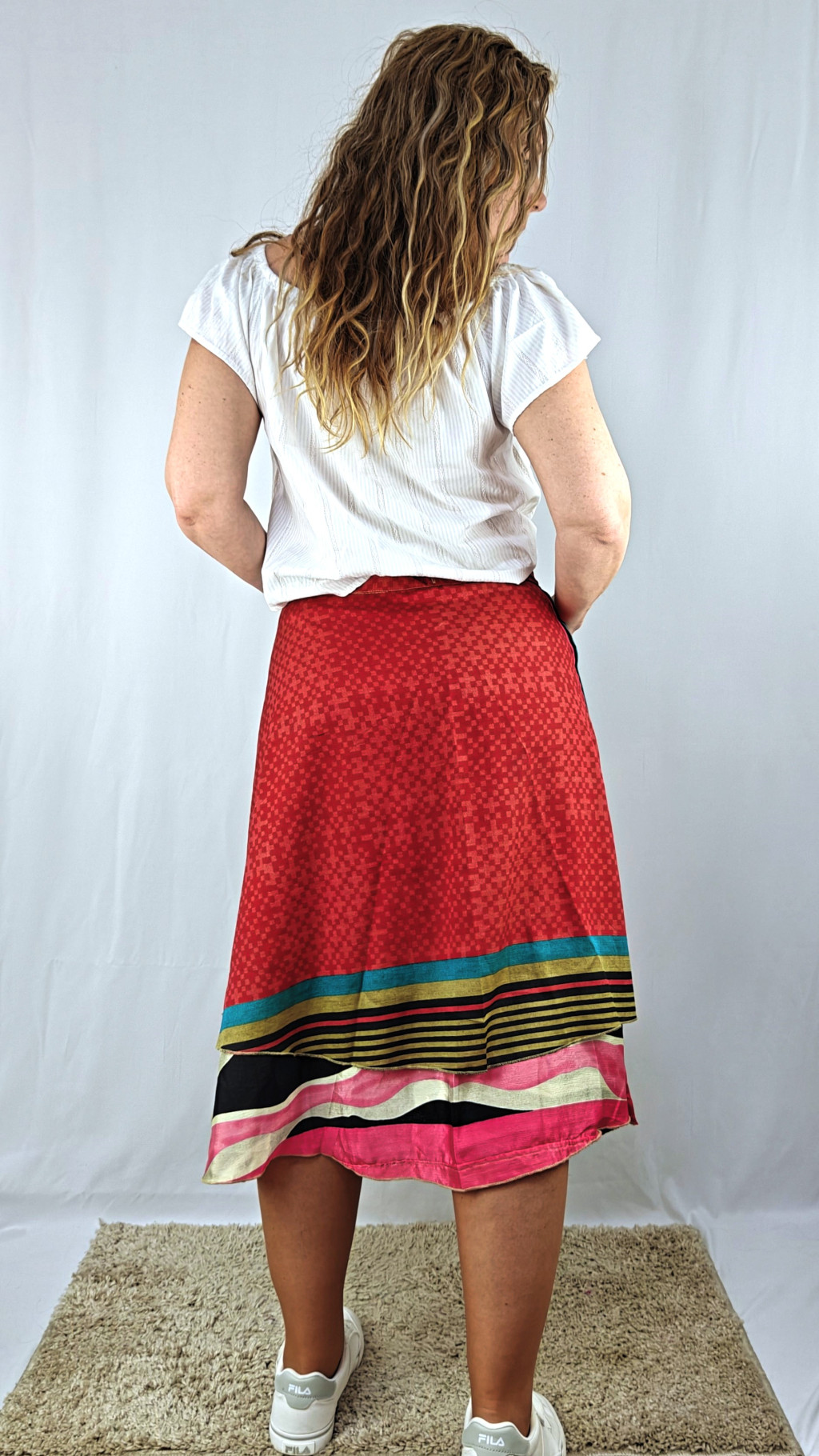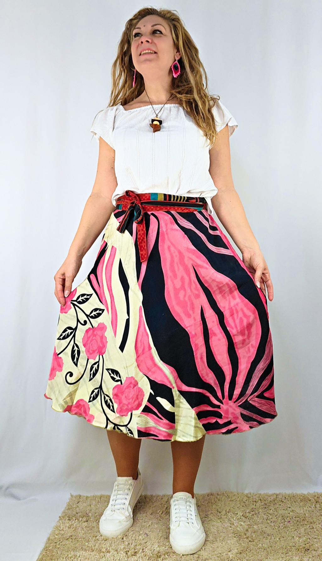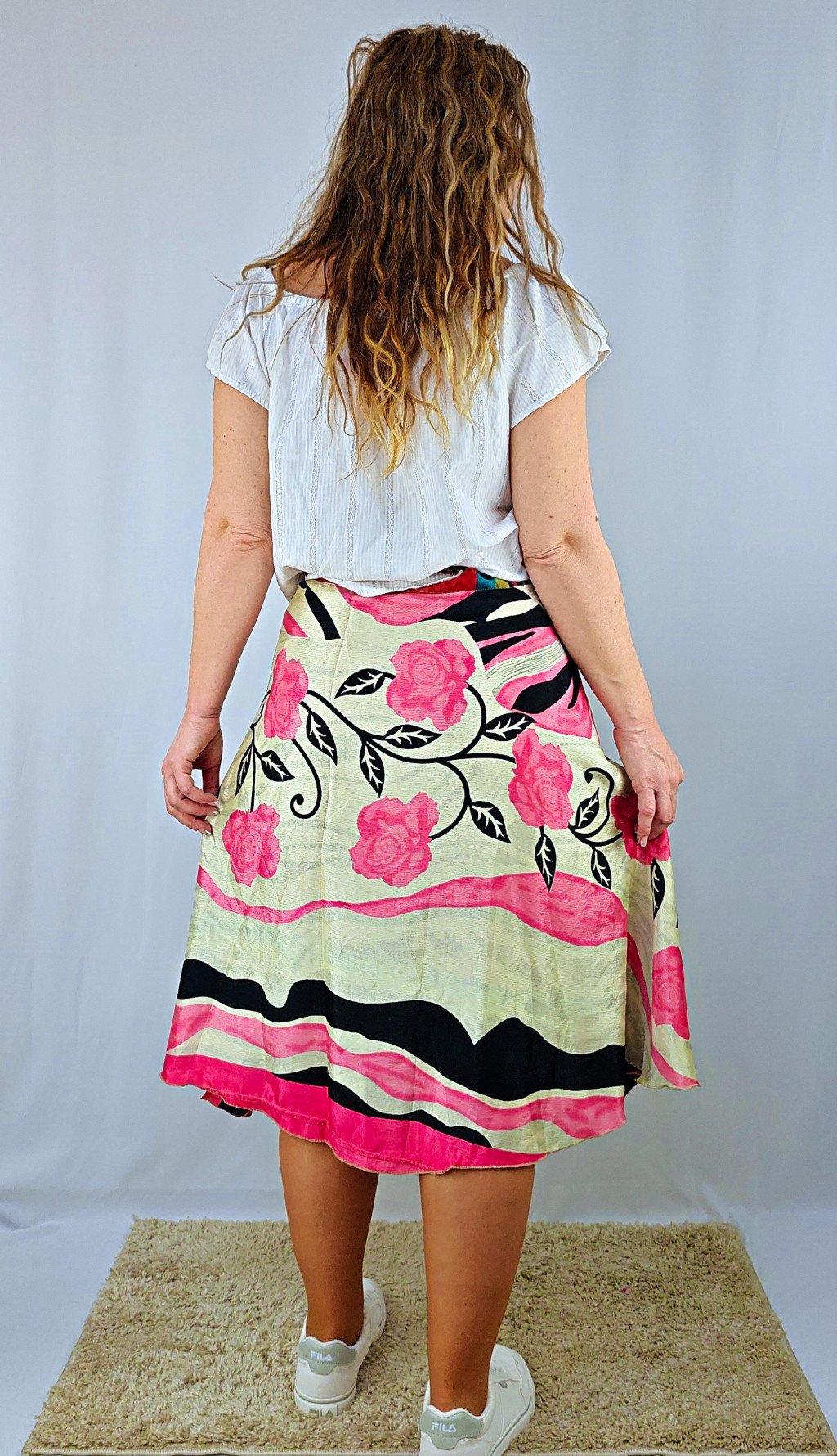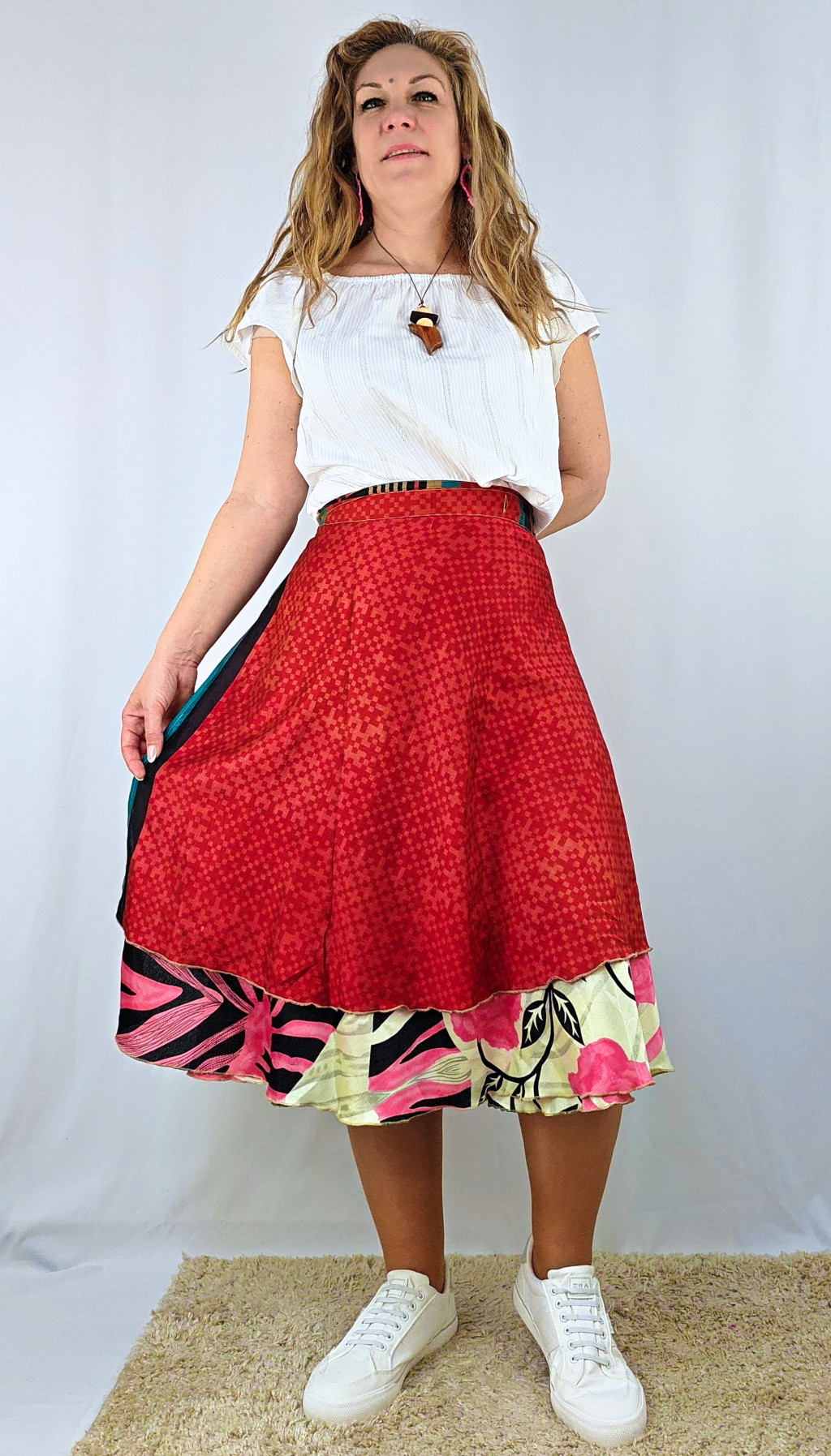 Lapszoknyáink újrahasznosított szárikból készülnek Indiában, egy hosszabb és egy rövidebb anyag derékban összevarrva! Két oldalú, kifordítható, mindkét oldala hordható, sokféleképpen köthető, variálható. Szoknyáinkból nincs két egyforma, mindegyikből csak EGY darab van, ha megtetszik, csapj le rá!