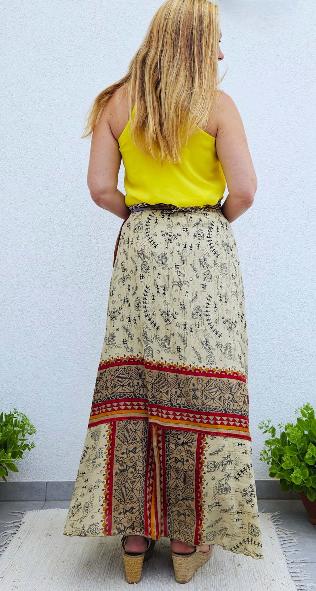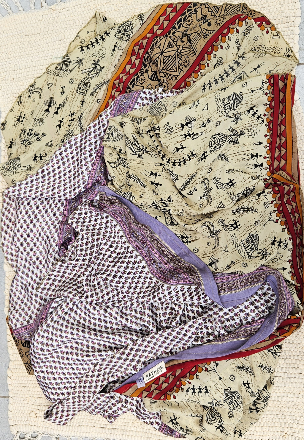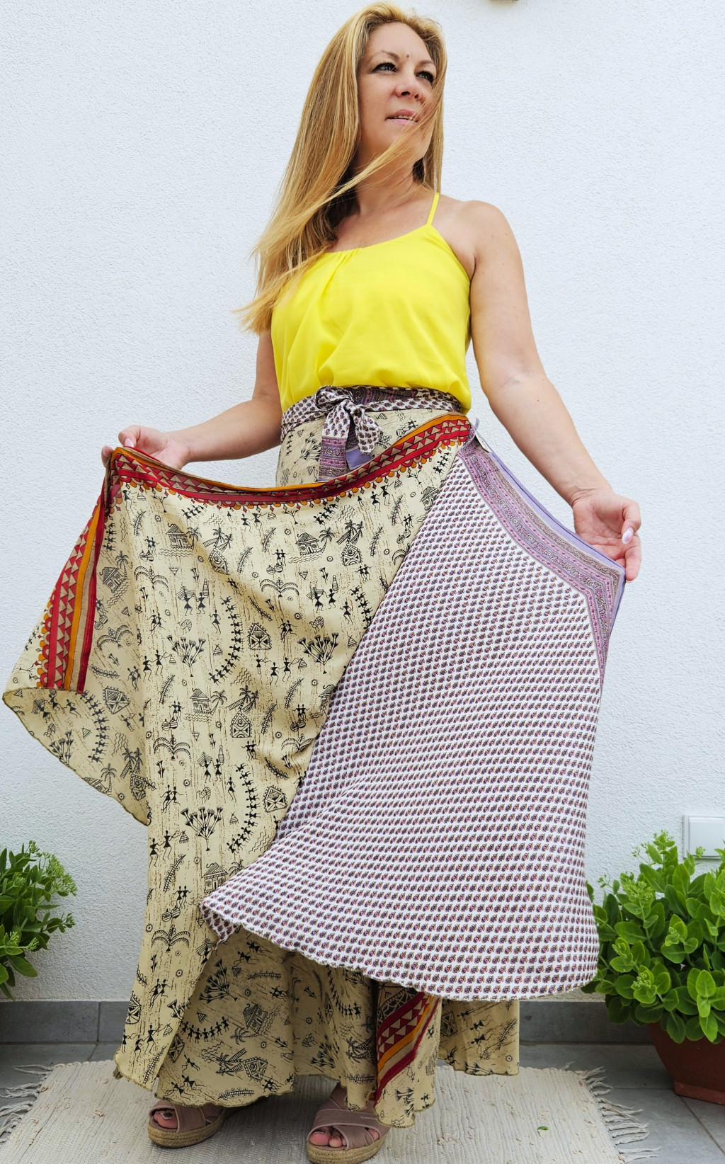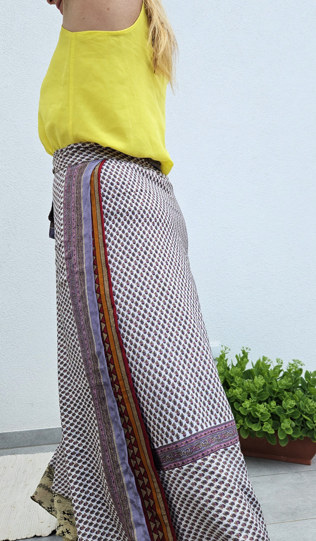 Lapszoknyáink újrahasznosított szárikból készülnek Indiában, egy hosszabb és egy rövidebb anyag derékban összevarrva! Kifordítható, mindkét oldala hordható, sokféleképpen köthető, variálható. Szoknyáinkból nincs két egyforma, mindegyikből csak EGY darab van, ha megtetszik, csapj le rá!