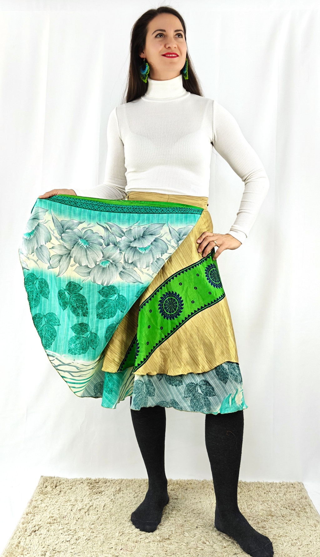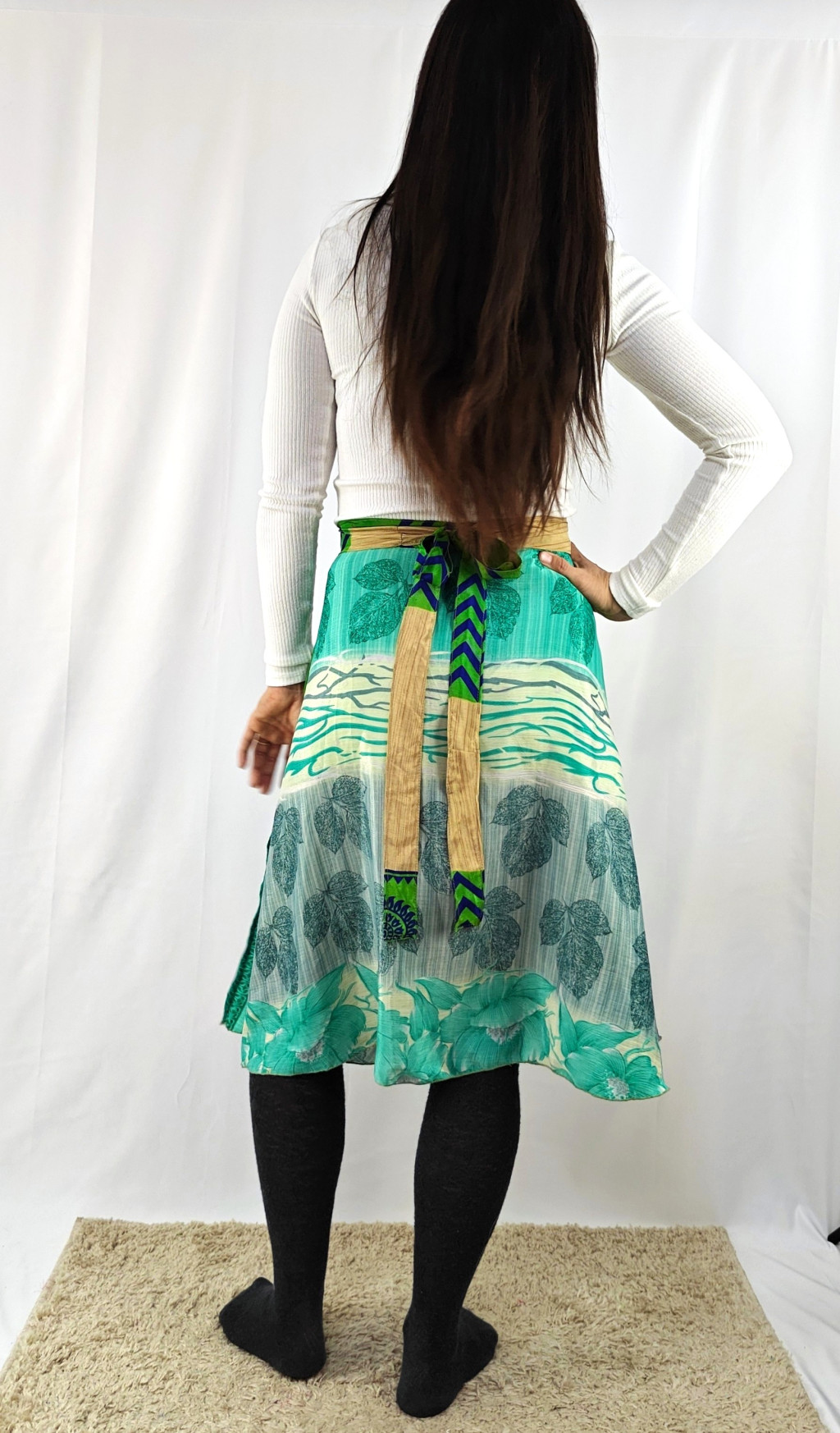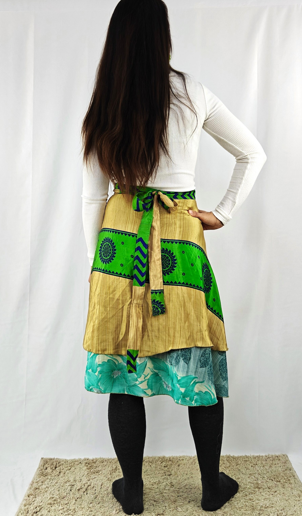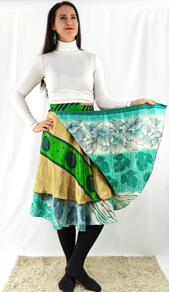 Lapszoknyáink újrahasznosított szárikból készülnek Indiában, egy hosszabb és egy rövidebb anyag derékban összevarrva! Két oldalú, kifordítható, mindkét oldala hordható, sokféleképpen köthető, variálható. Szoknyáinkból nincs két egyforma, mindegyikből csak EGY darab van, ha megtetszik, csapj le rá!