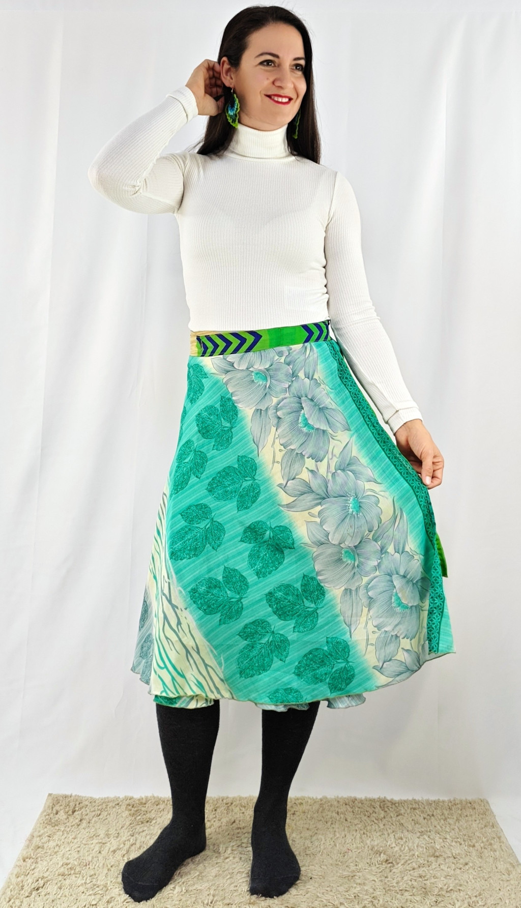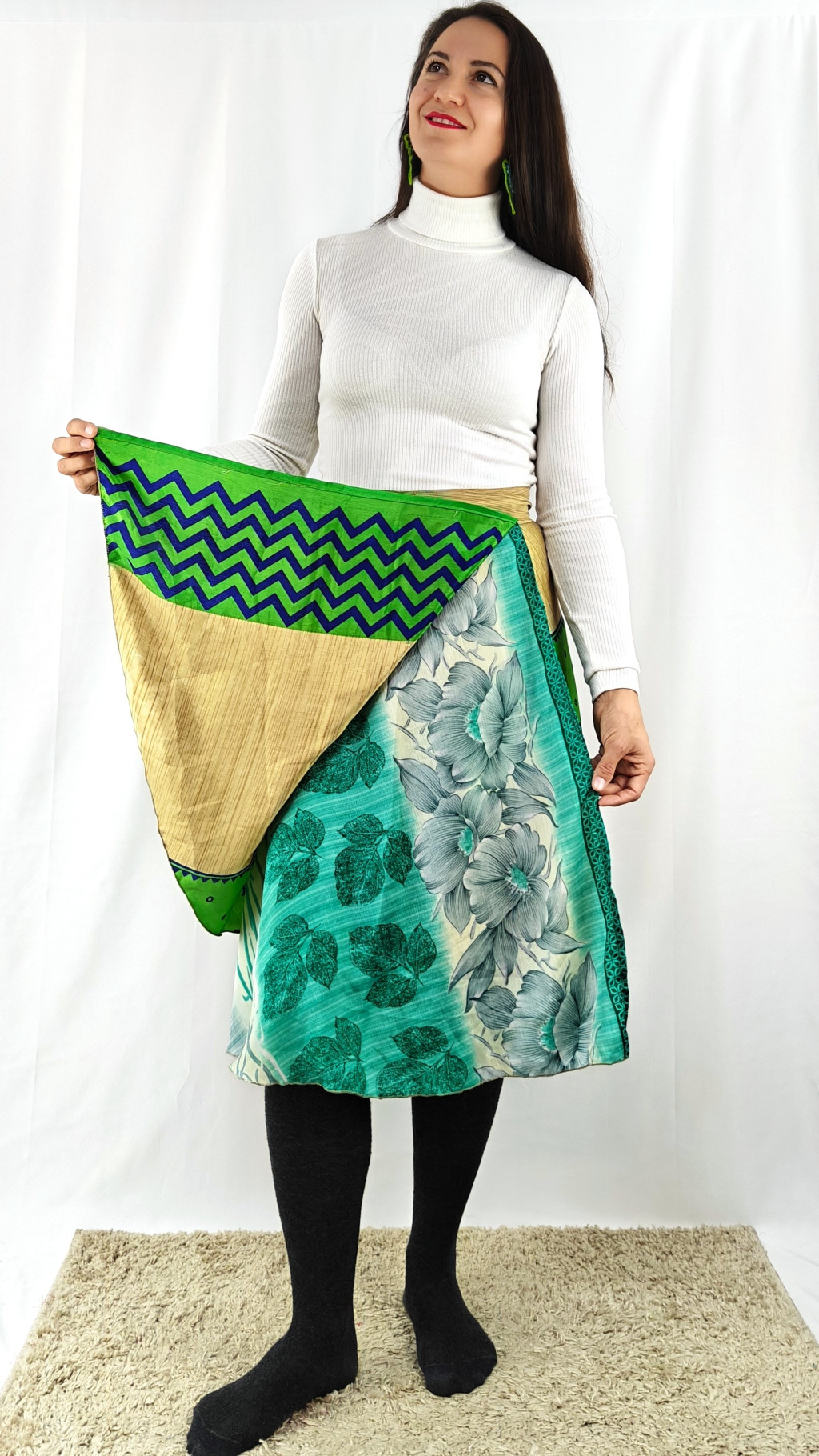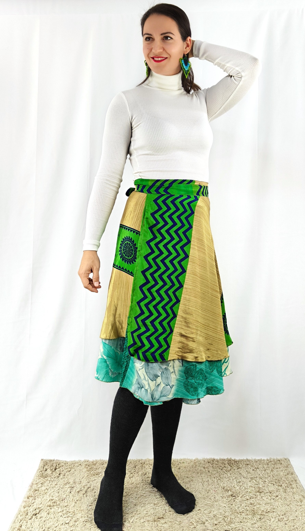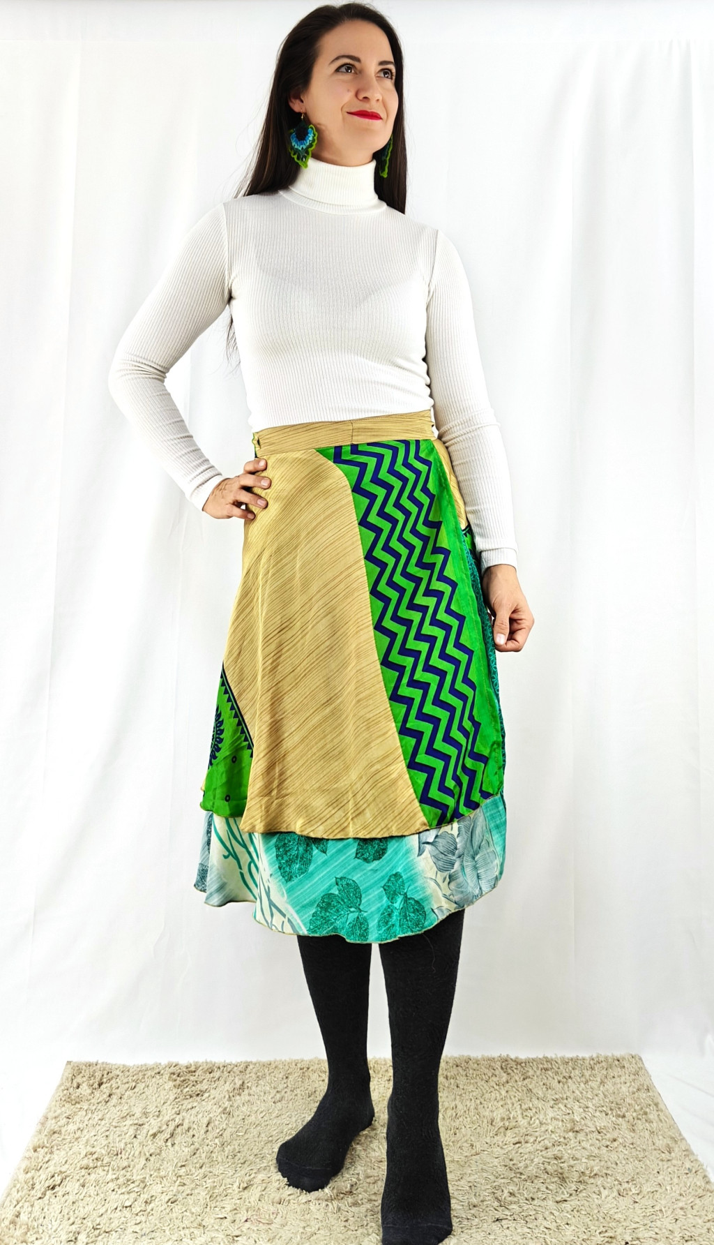 Lapszoknyáink újrahasznosított szárikból készülnek Indiában, egy hosszabb és egy rövidebb anyag derékban összevarrva! Két oldalú, kifordítható, mindkét oldala hordható, sokféleképpen köthető, variálható. Szoknyáinkból nincs két egyforma, mindegyikből csak EGY darab van, ha megtetszik, csapj le rá!
