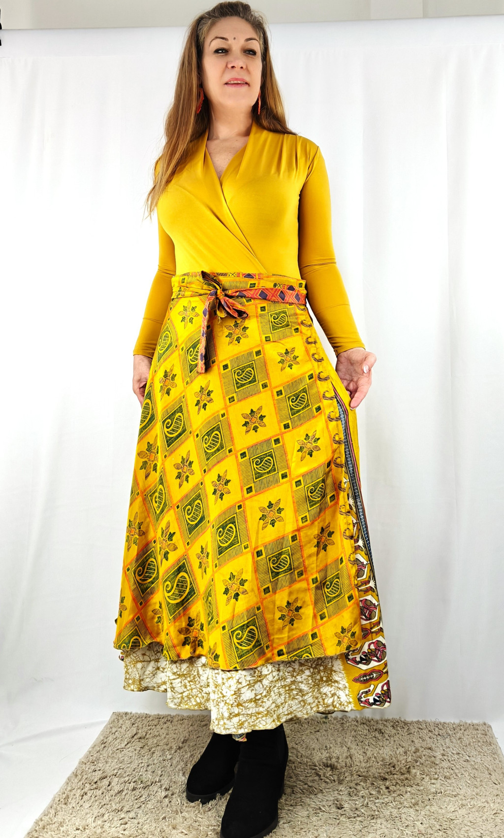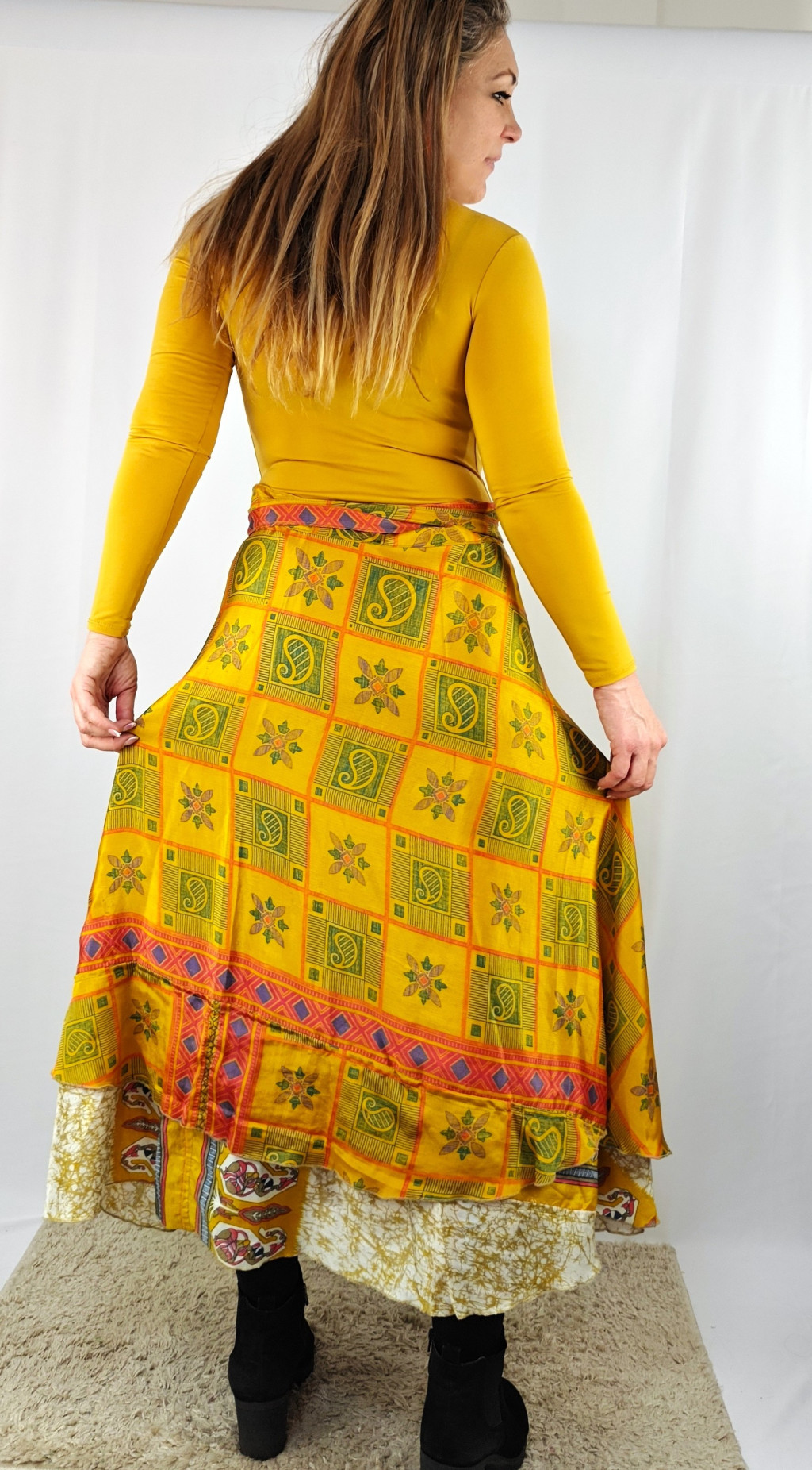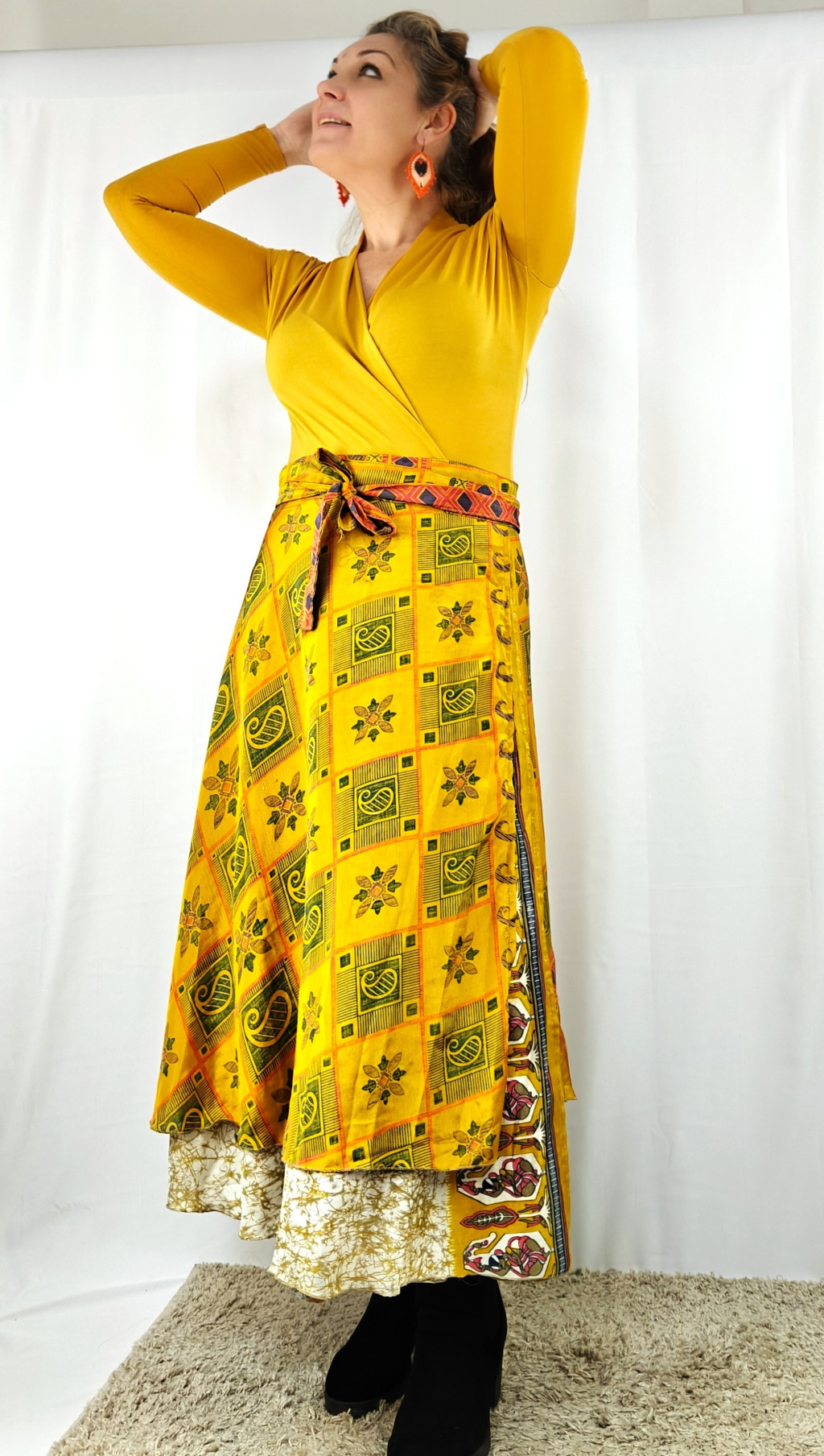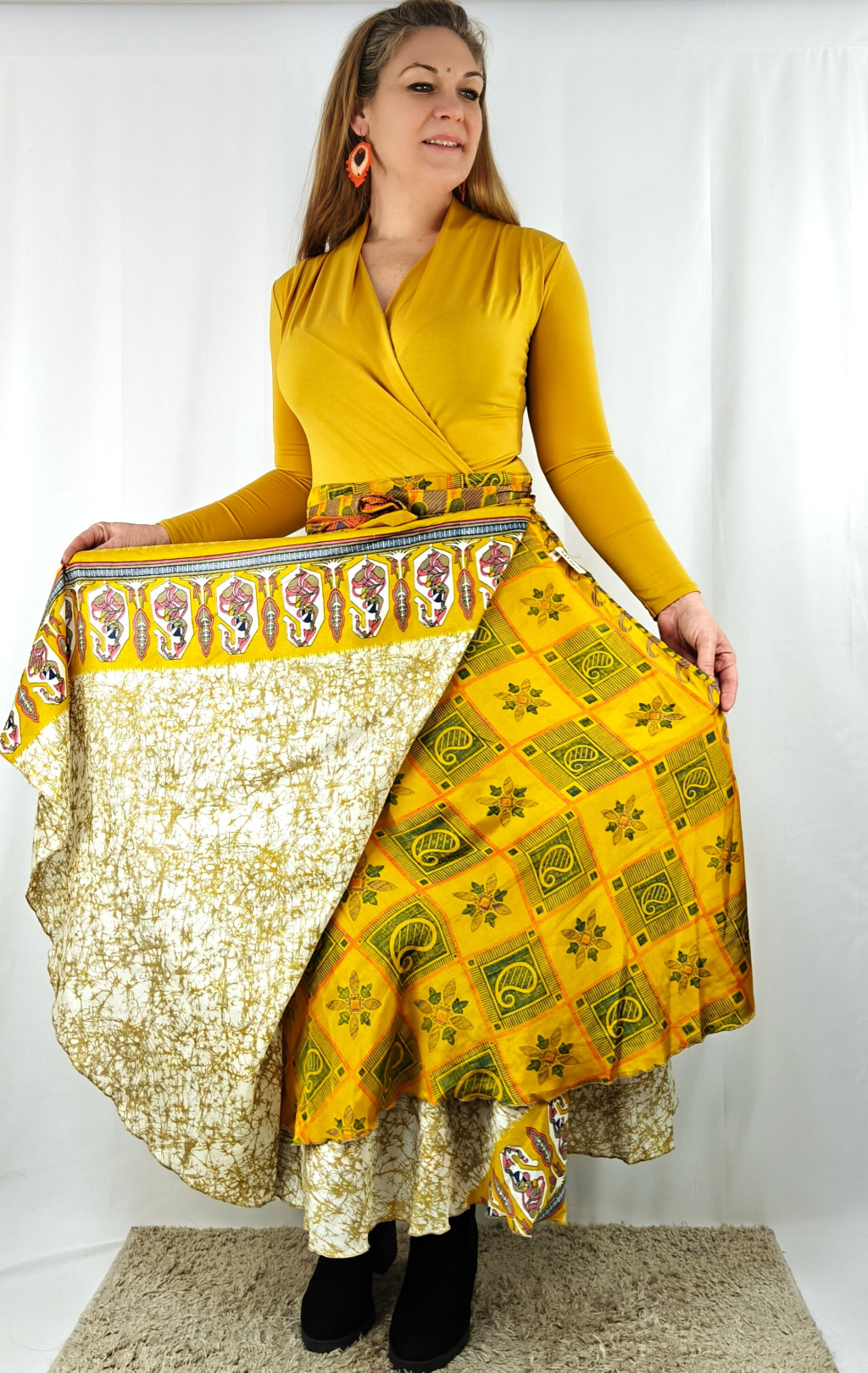 Lapszoknyáink újrahasznosított szárikból készülnek Indiában, egy hosszabb és egy rövidebb anyag derékban összevarrva! Két oldalú, kifordítható, mindkét oldala hordható, sokféleképpen köthető, variálható. Szoknyáinkból nincs két egyforma, mindegyikből csak EGY darab van, ha megtetszik, csapj le rá!