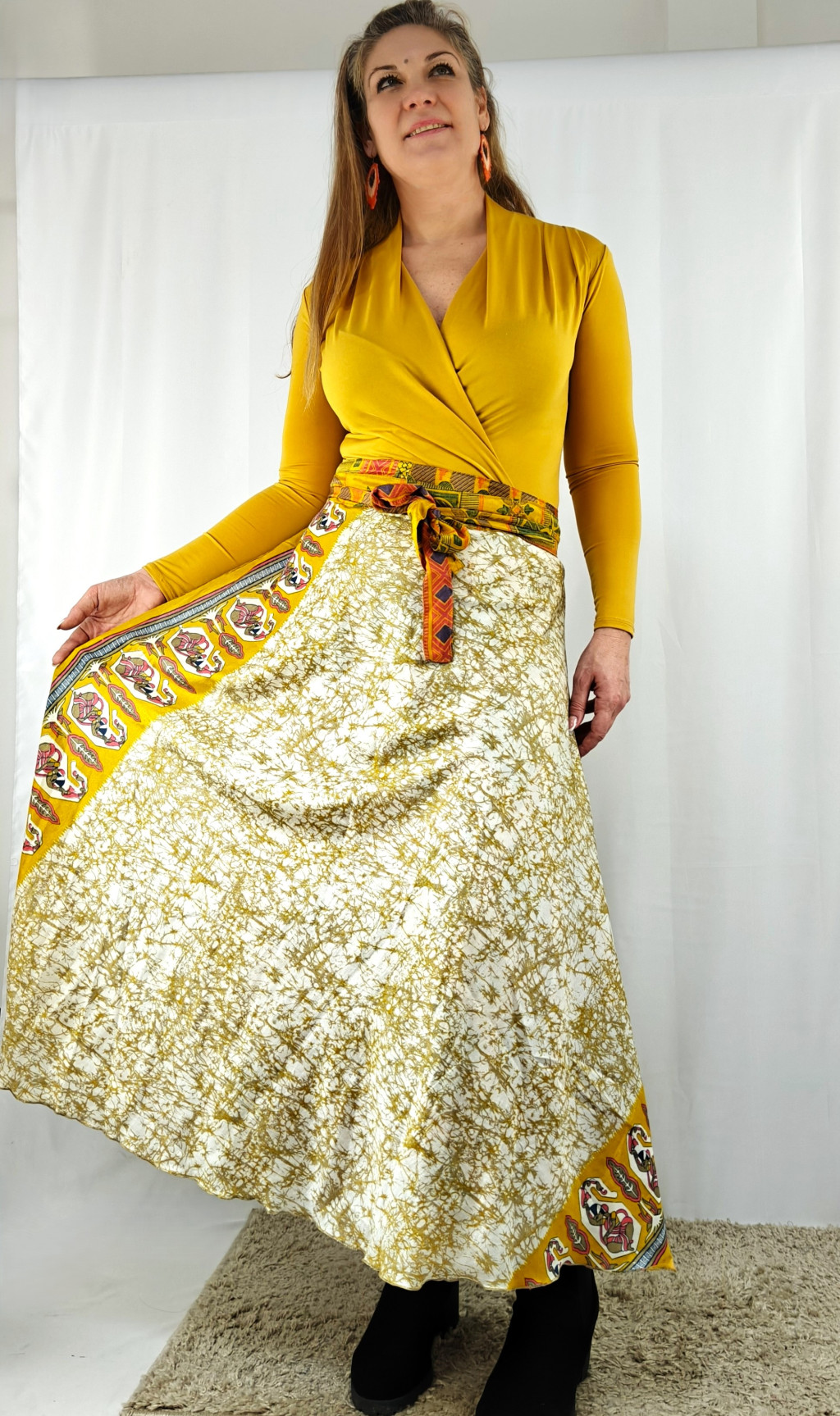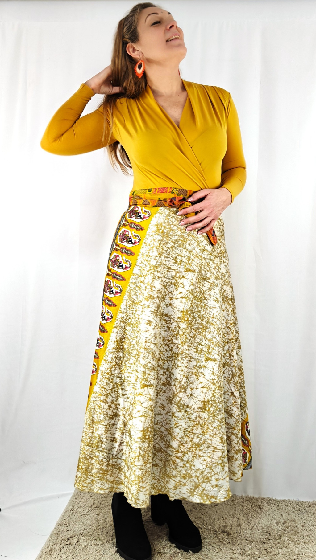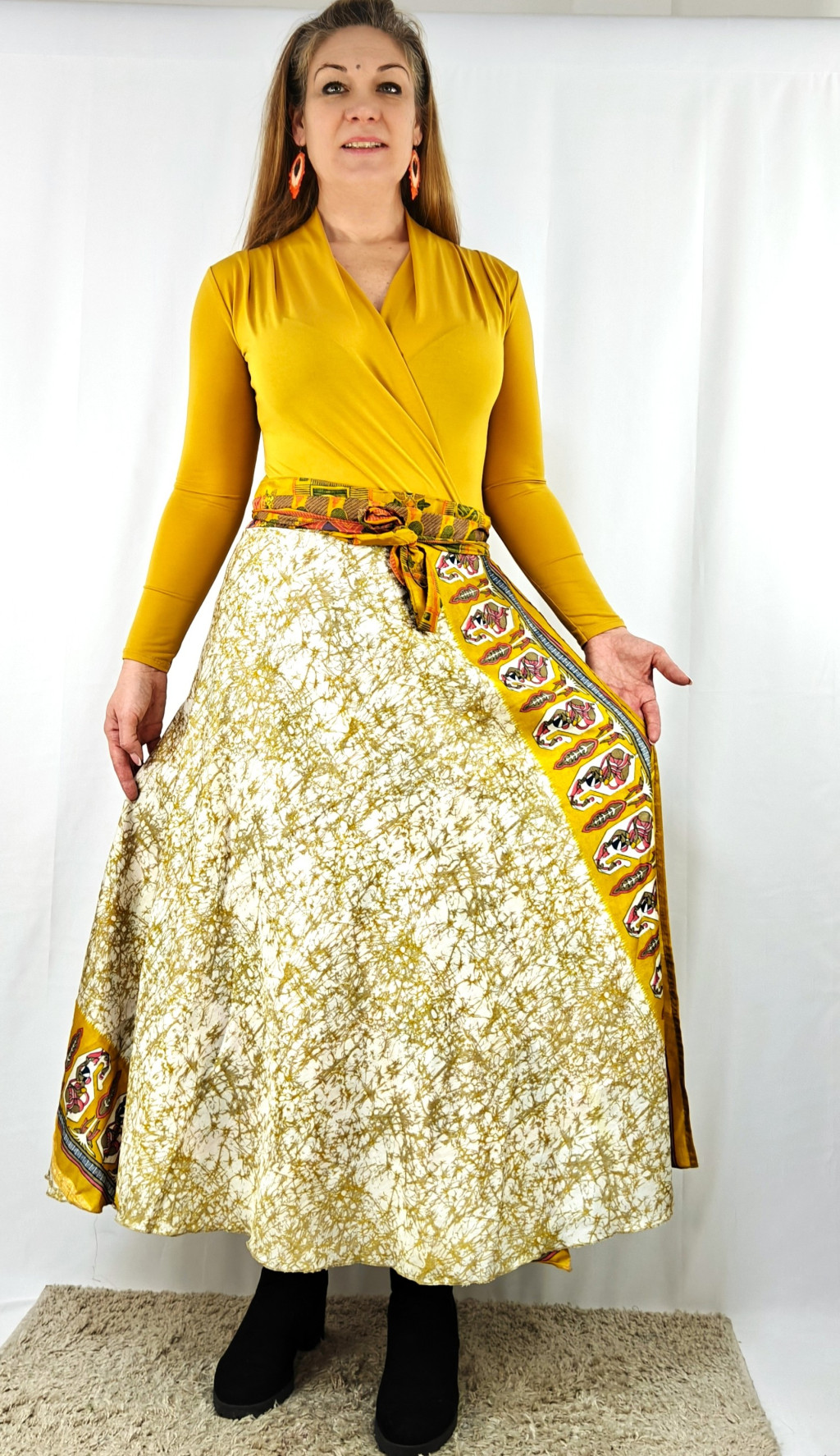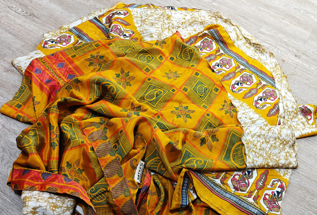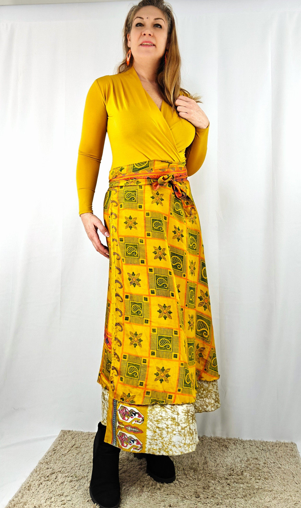 Lapszoknyáink újrahasznosított szárikból készülnek Indiában, egy hosszabb és egy rövidebb anyag derékban összevarrva! Két oldalú, kifordítható, mindkét oldala hordható, sokféleképpen köthető, variálható. Szoknyáinkból nincs két egyforma, mindegyikből csak EGY darab van, ha megtetszik, csapj le rá!