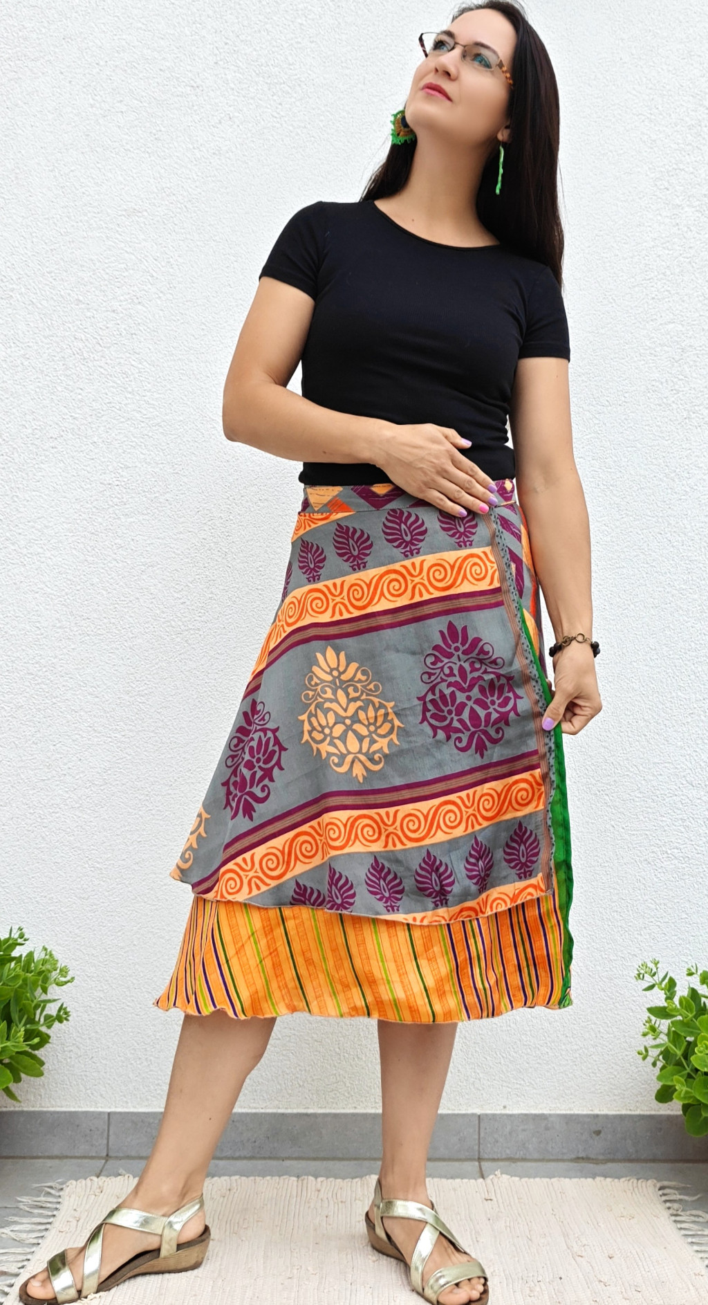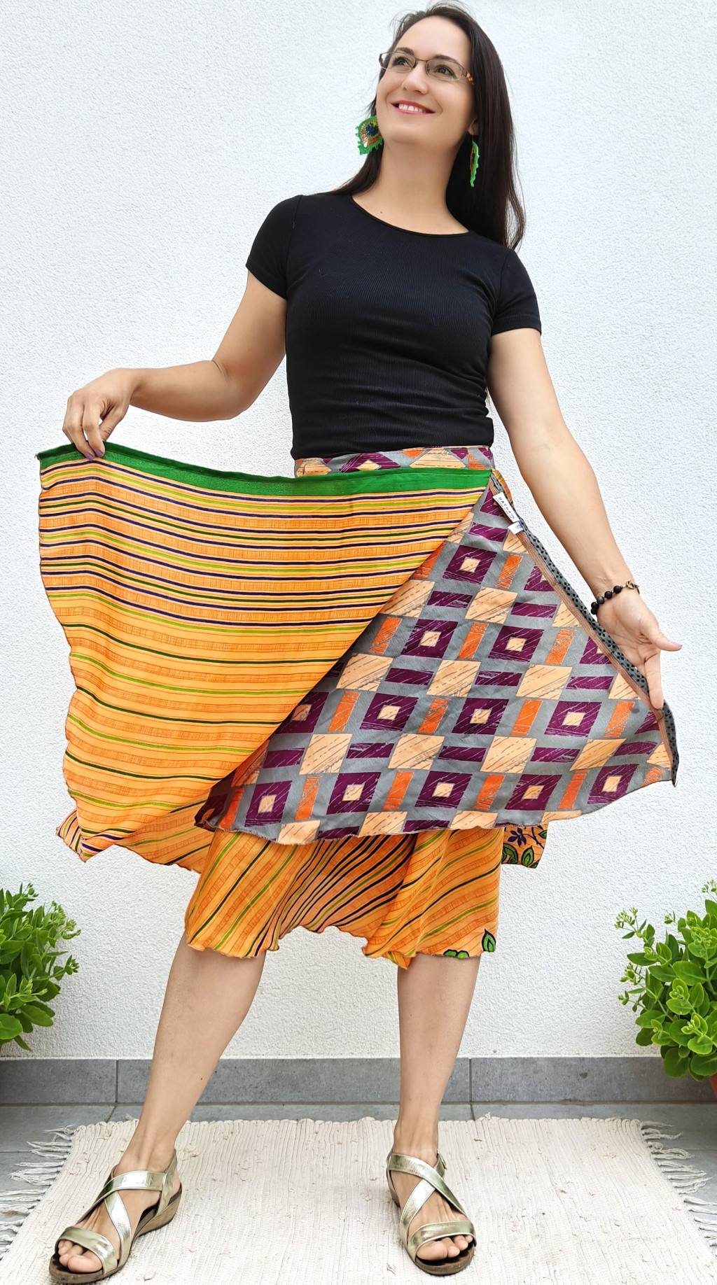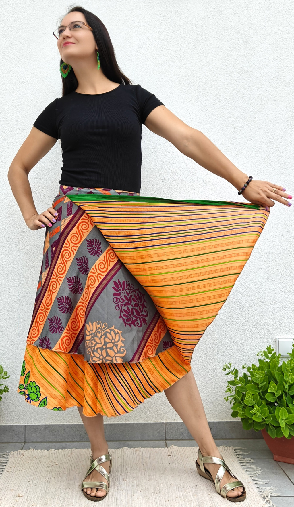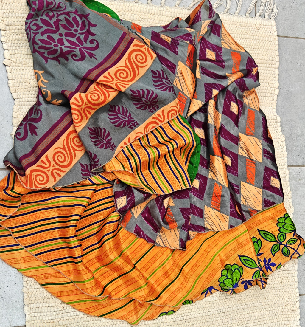 Lapszoknyáink újrahasznosított szárikból készülnek Indiában, egy hosszabb és egy rövidebb anyag derékban összevarrva! Kifordítható, mindkét oldala hordható, sokféleképpen köthető, variálható. Szoknyáinkból nincs két egyforma, mindegyikből csak EGY darab van, ha megtetszik, csapj le rá!