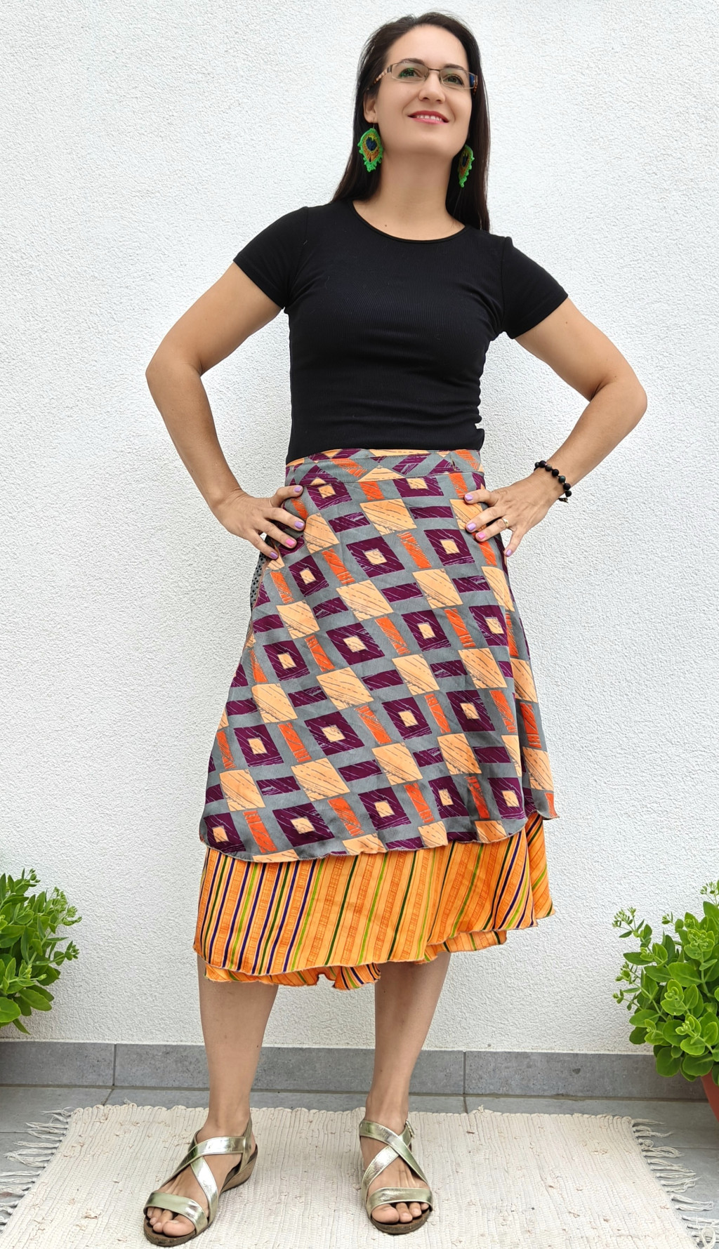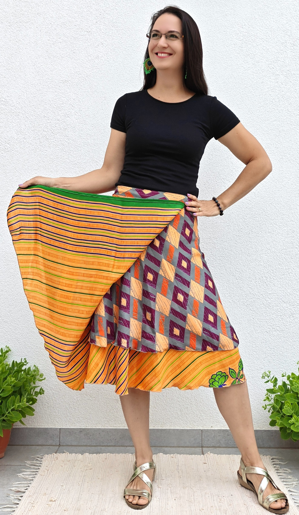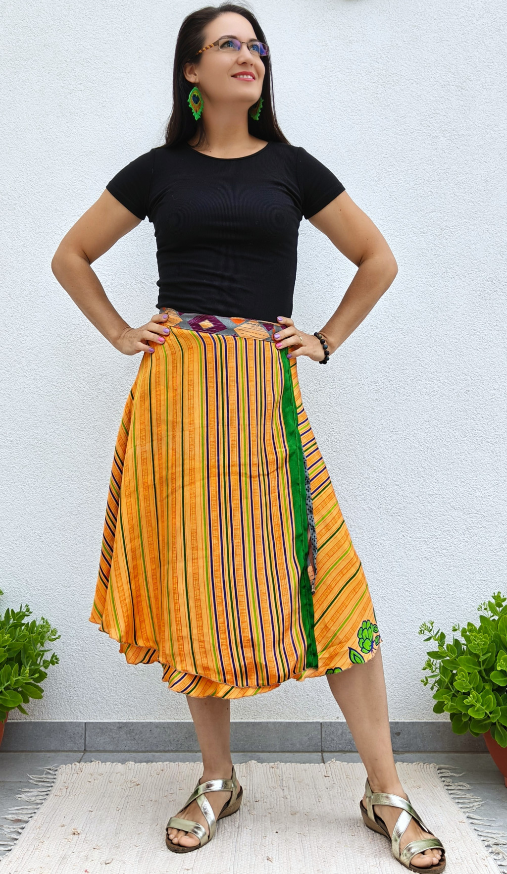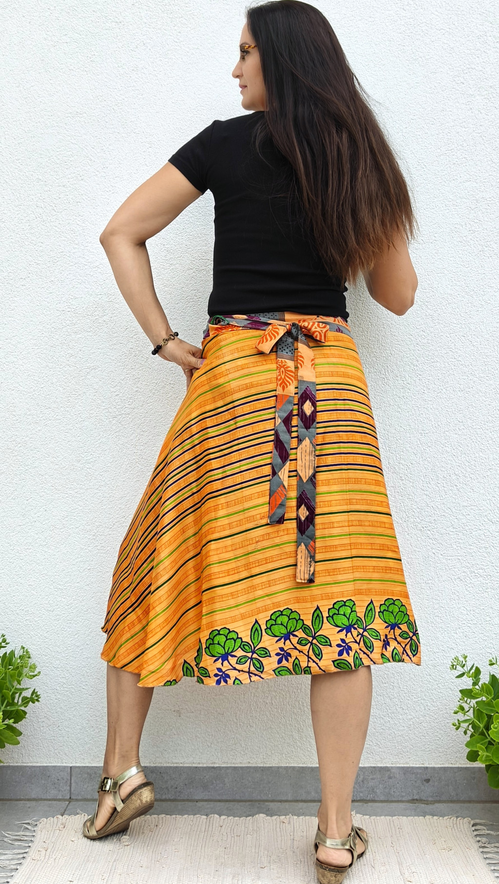 Lapszoknyáink újrahasznosított szárikból készülnek Indiában, egy hosszabb és egy rövidebb anyag derékban összevarrva! Kifordítható, mindkét oldala hordható, sokféleképpen köthető, variálható. Szoknyáinkból nincs két egyforma, mindegyikből csak EGY darab van, ha megtetszik, csapj le rá!