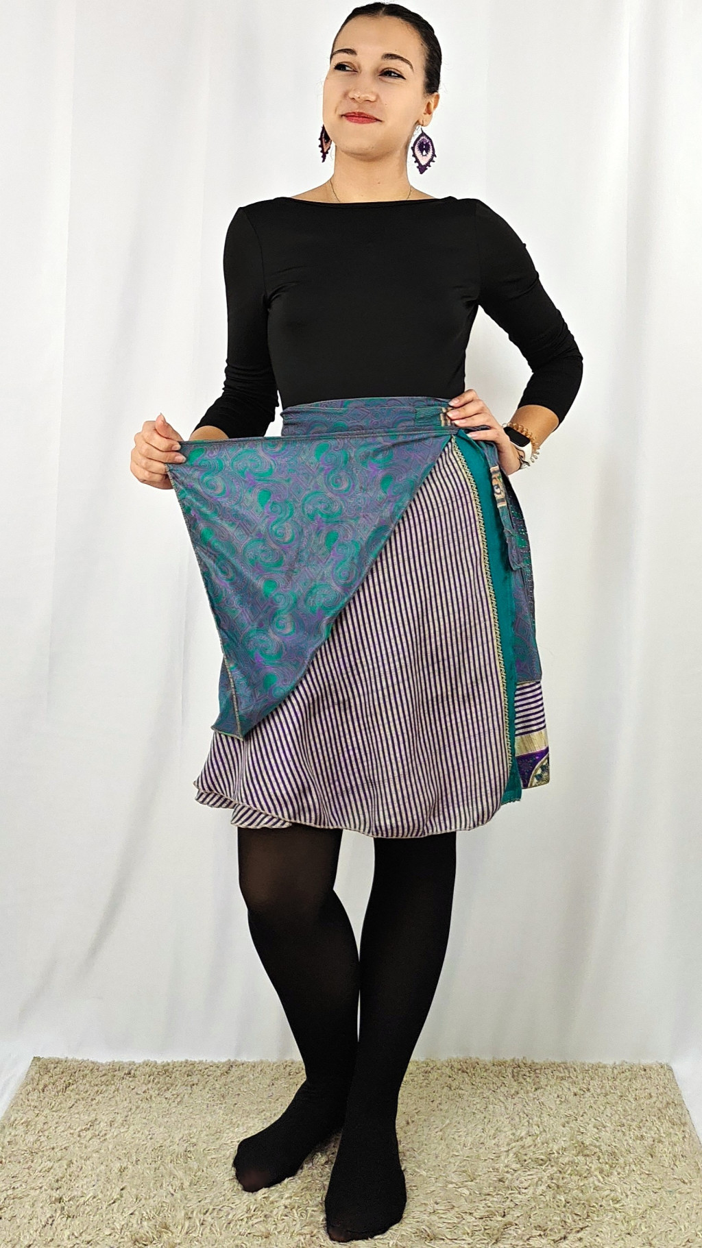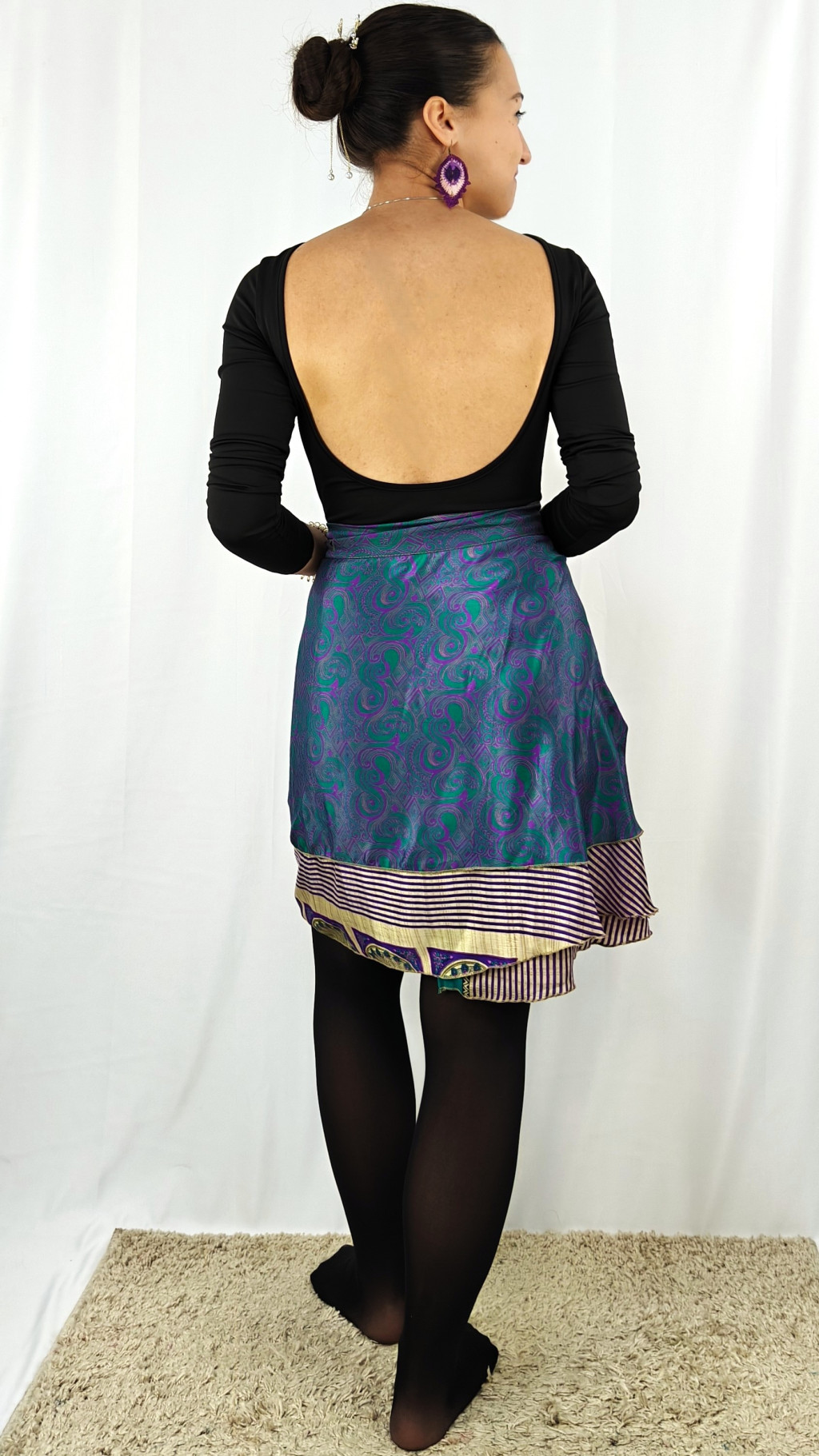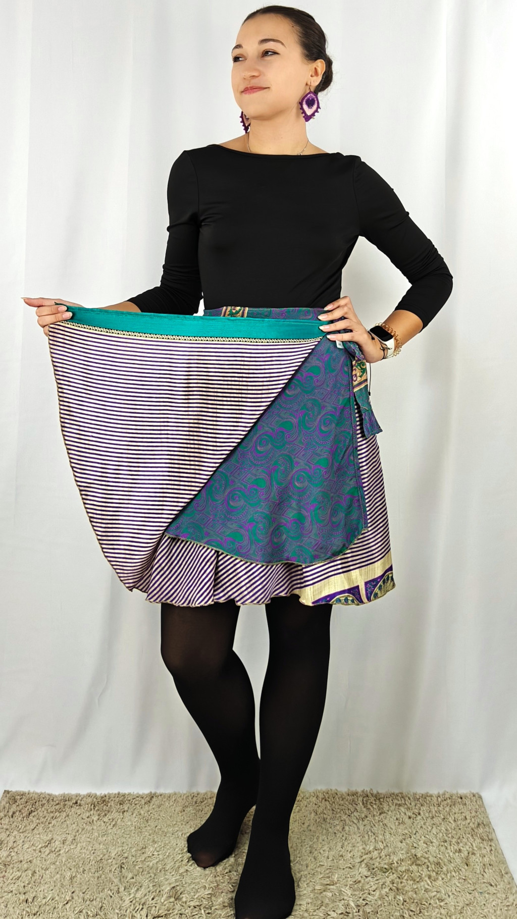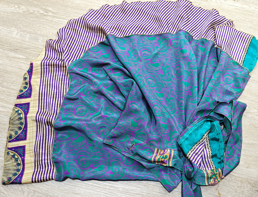 Lapszoknyáink újrahasznosított szárikból készülnek Indiában, egy hosszabb és egy rövidebb anyag derékban összevarrva! Két oldalú, kifordítható, mindkét oldala hordható, sokféleképpen köthető, variálható. Szoknyáinkból nincs két egyforma, mindegyikből csak EGY darab van, ha megtetszik, csapj le rá!