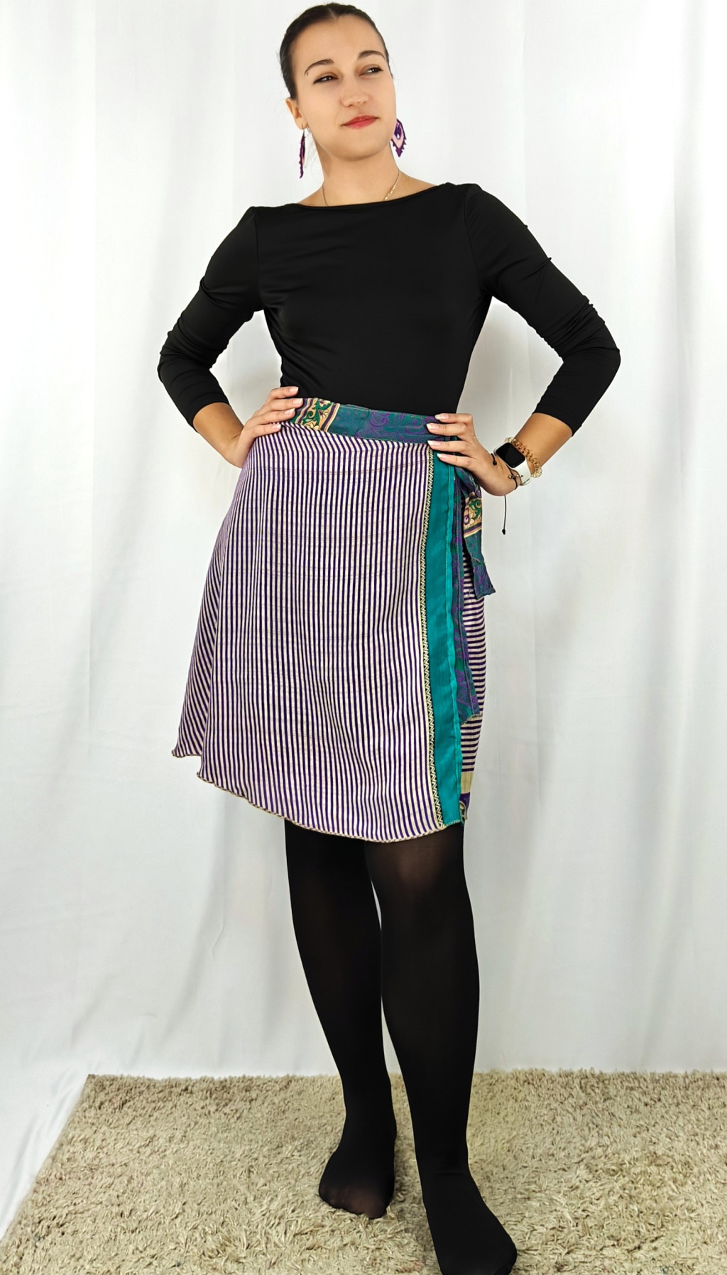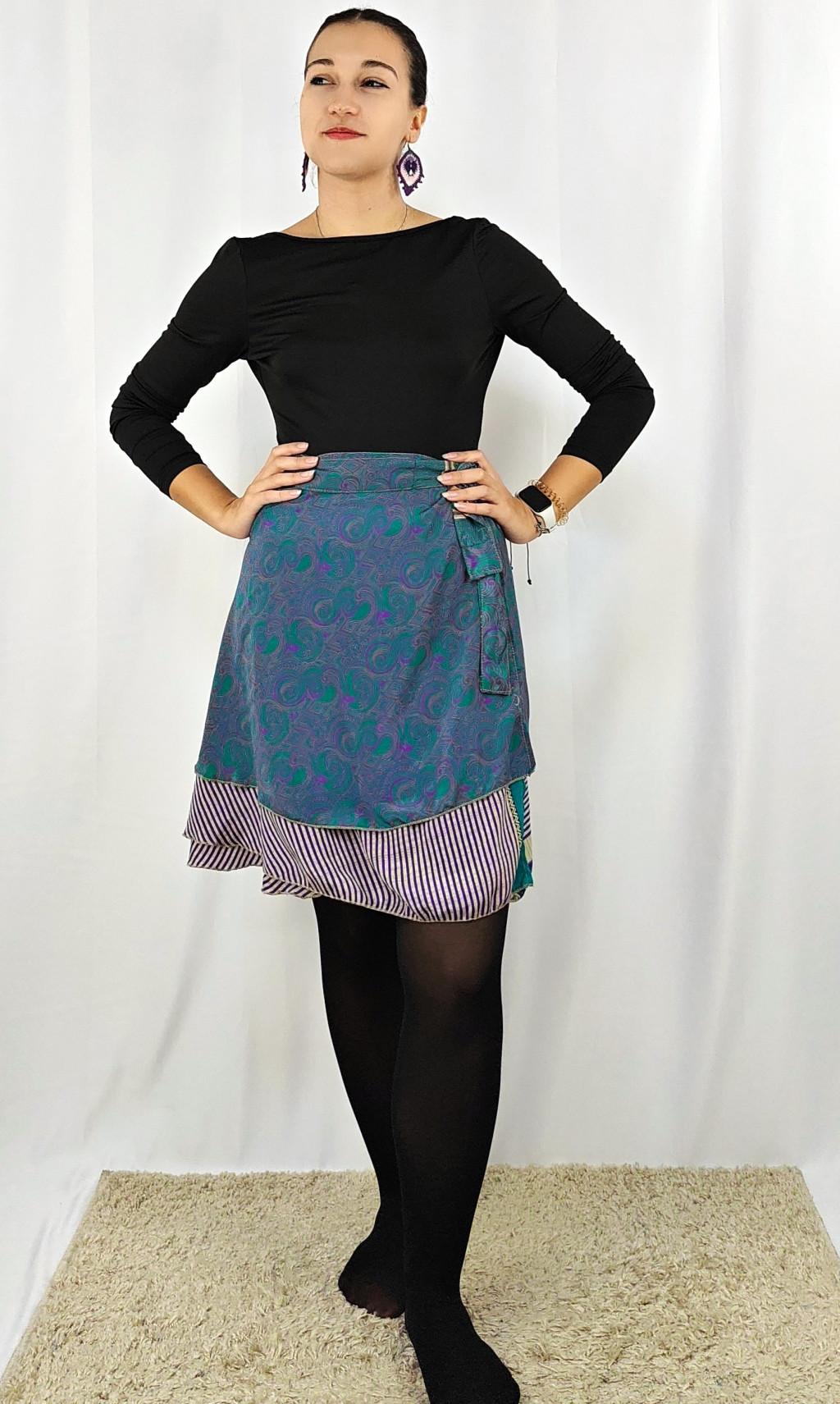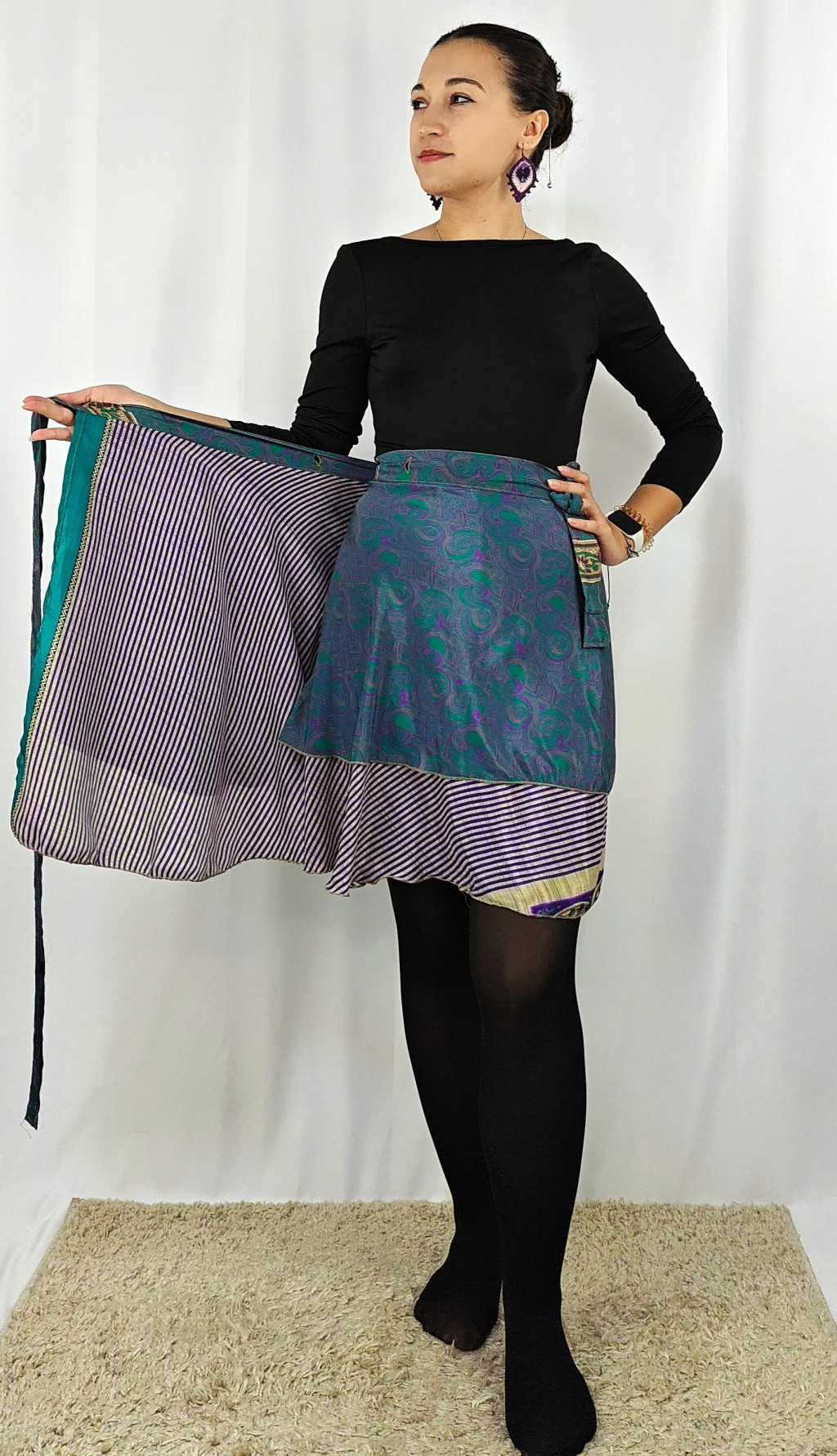Lapszoknyáink újrahasznosított szárikból készülnek Indiában, egy hosszabb és egy rövidebb anyag derékban összevarrva! Két oldalú, kifordítható, mindkét oldala hordható, sokféleképpen köthető, variálható. Szoknyáinkból nincs két egyforma, mindegyikből csak EGY darab van, ha megtetszik, csapj le rá!