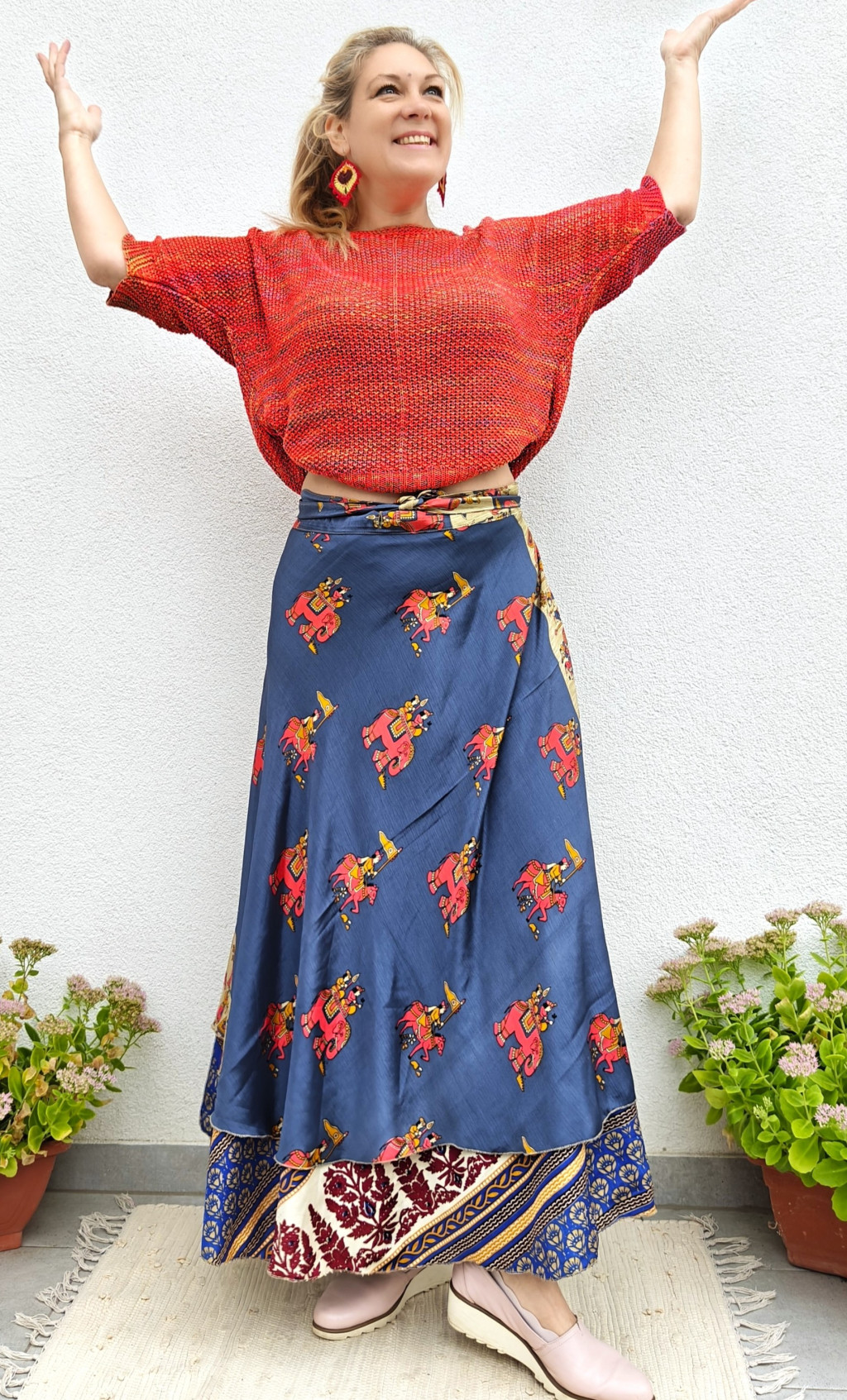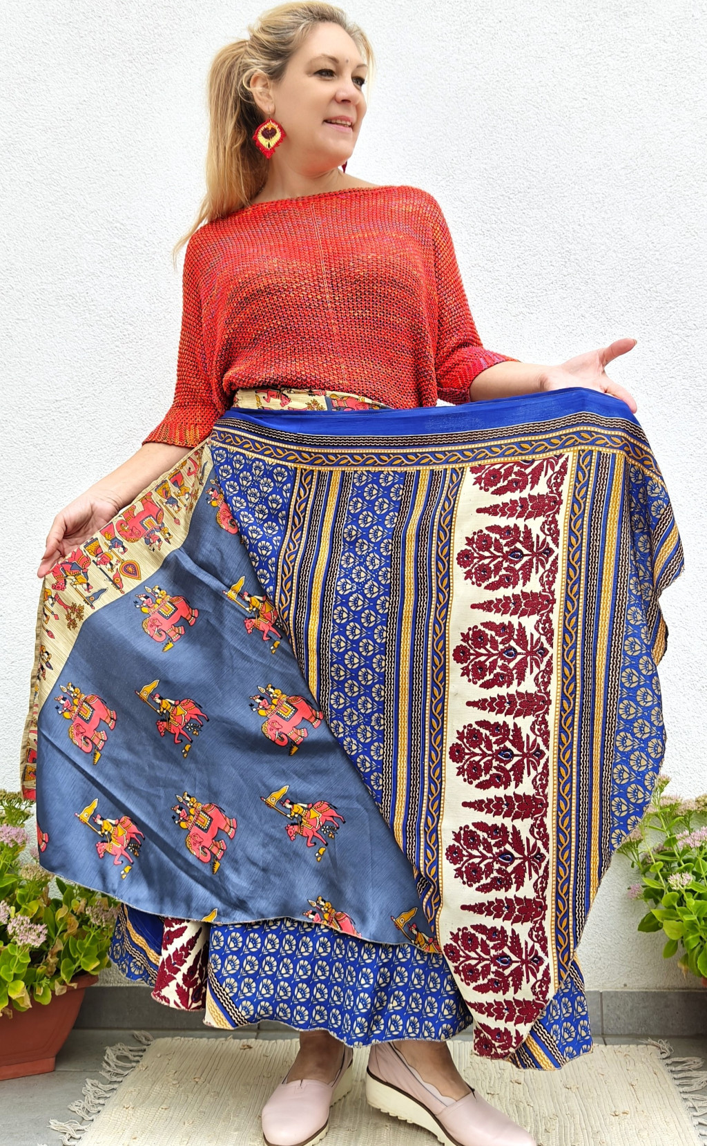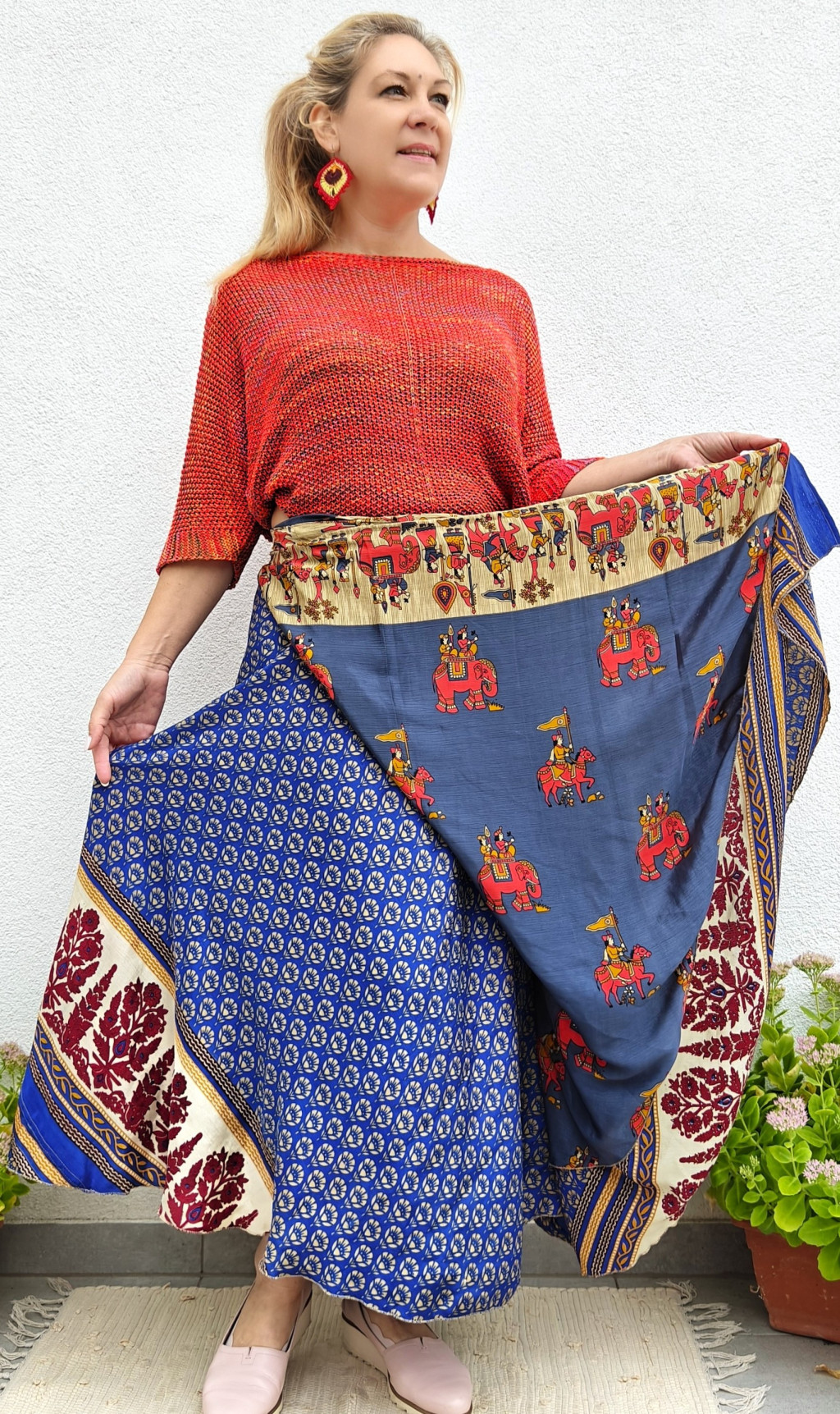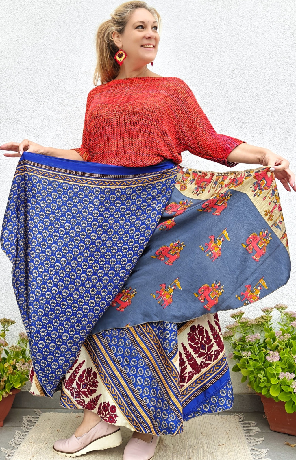 Lapszoknyáink újrahasznosított szárikból készülnek Indiában, egy hosszabb és egy rövidebb anyag derékban összevarrva! Két oldalú, kifordítható, mindkét oldala hordható, sokféleképpen köthető, variálható. Szoknyáinkból nincs két egyforma, mindegyikből csak EGY darab van, ha megtetszik, csapj le rá!