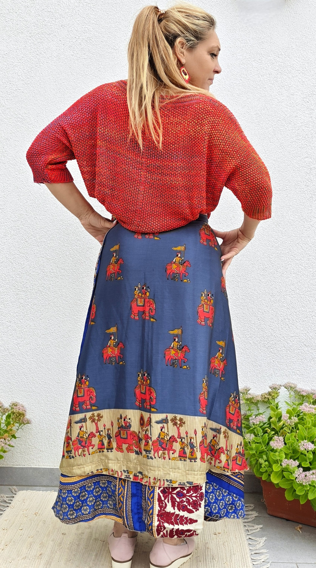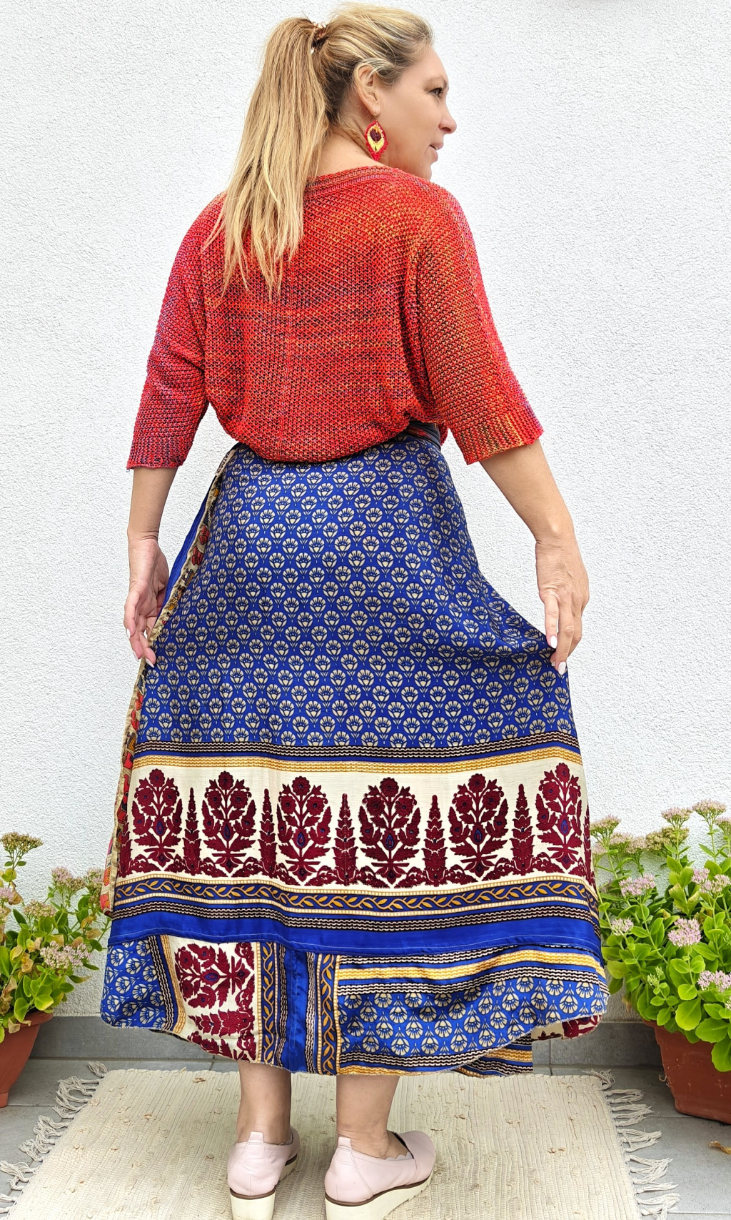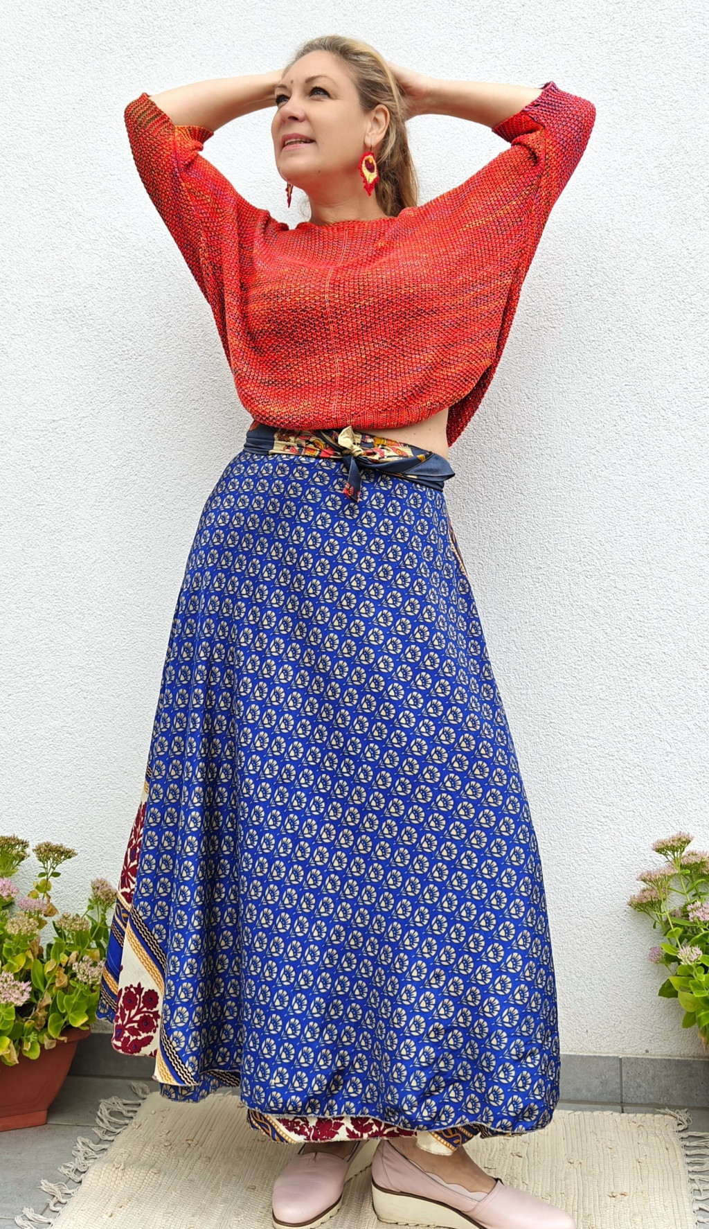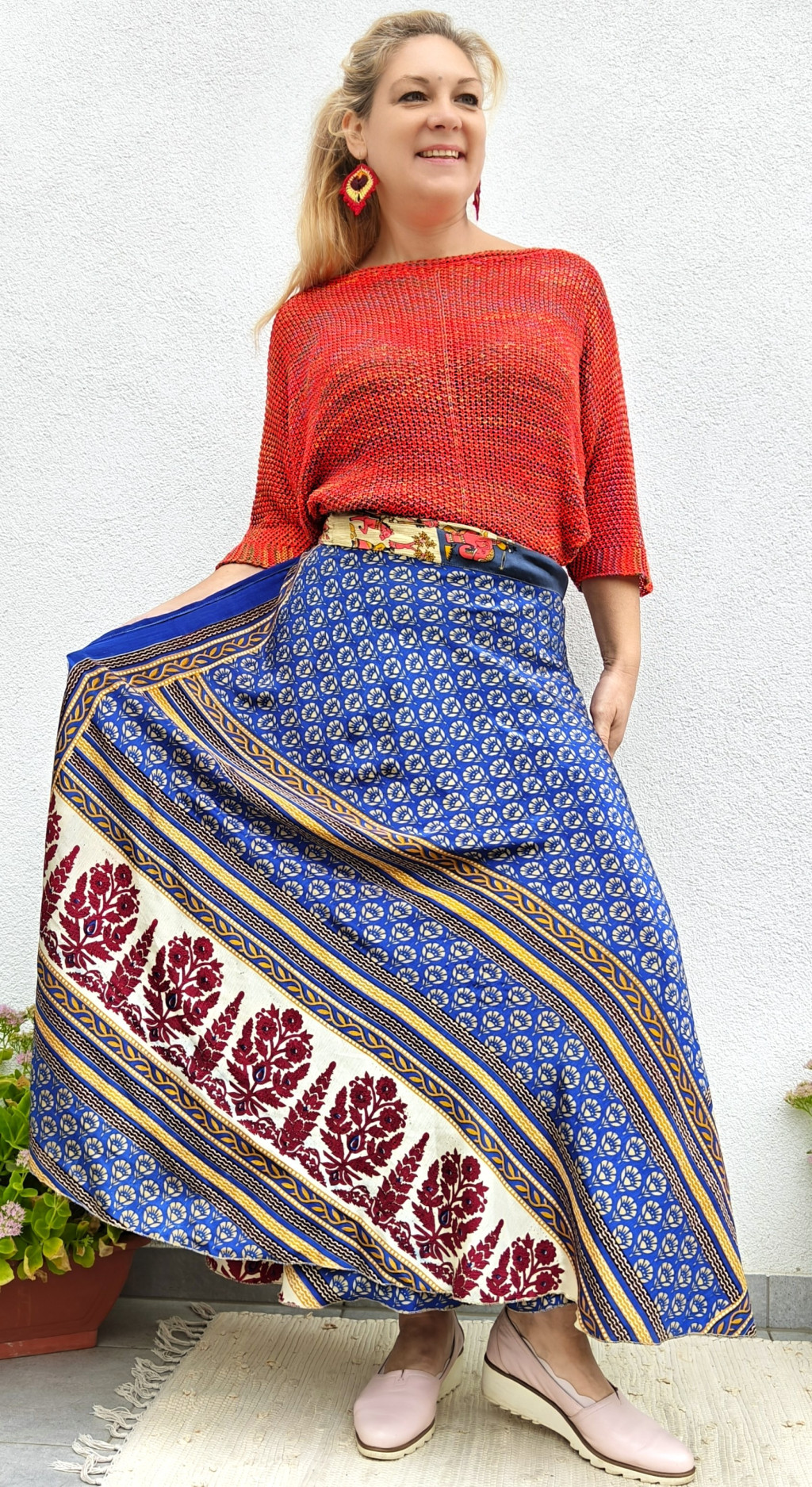 Lapszoknyáink újrahasznosított szárikból készülnek Indiában, egy hosszabb és egy rövidebb anyag derékban összevarrva! Két oldalú, kifordítható, mindkét oldala hordható, sokféleképpen köthető, variálható. Szoknyáinkból nincs két egyforma, mindegyikből csak EGY darab van, ha megtetszik, csapj le rá!