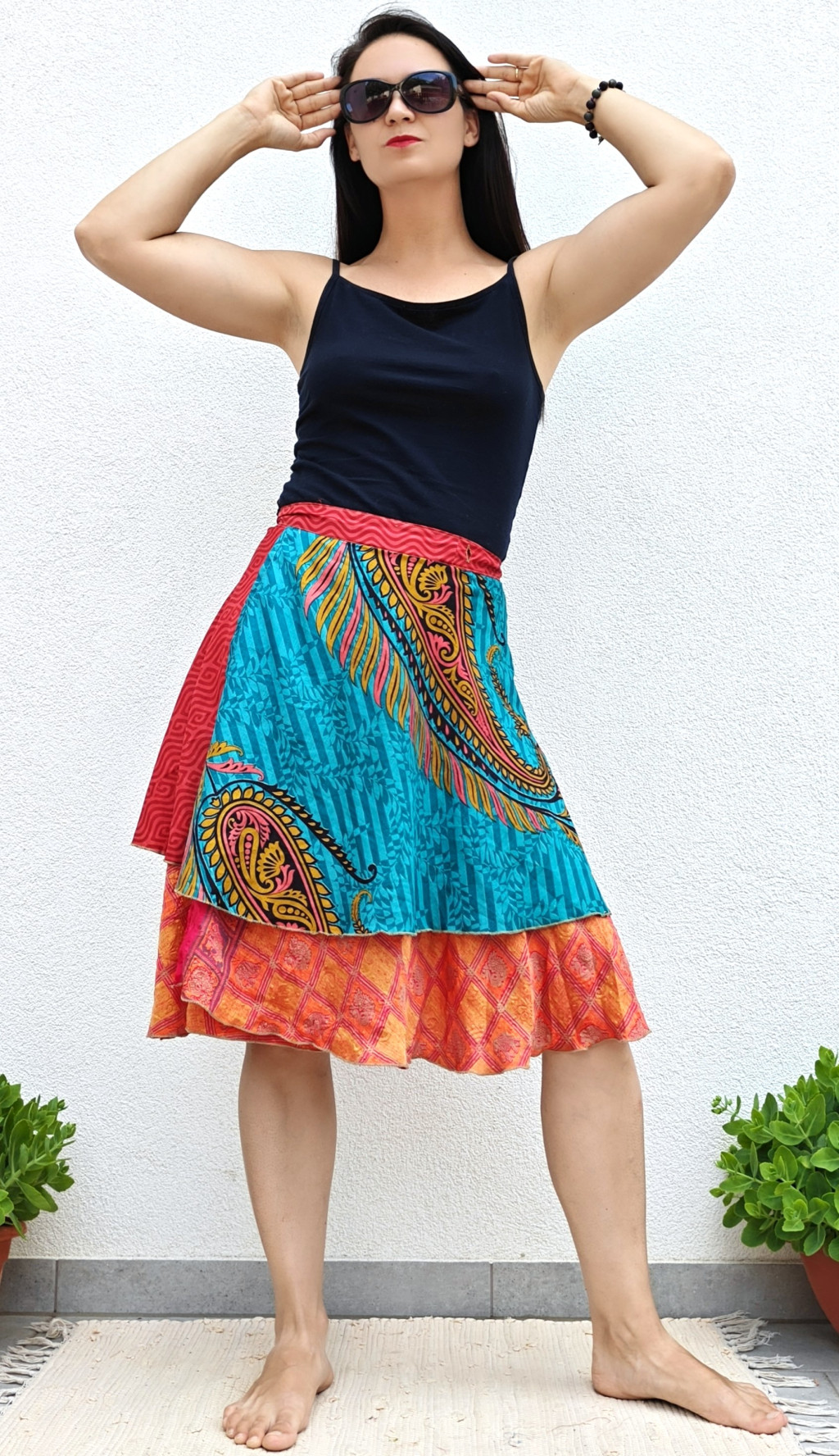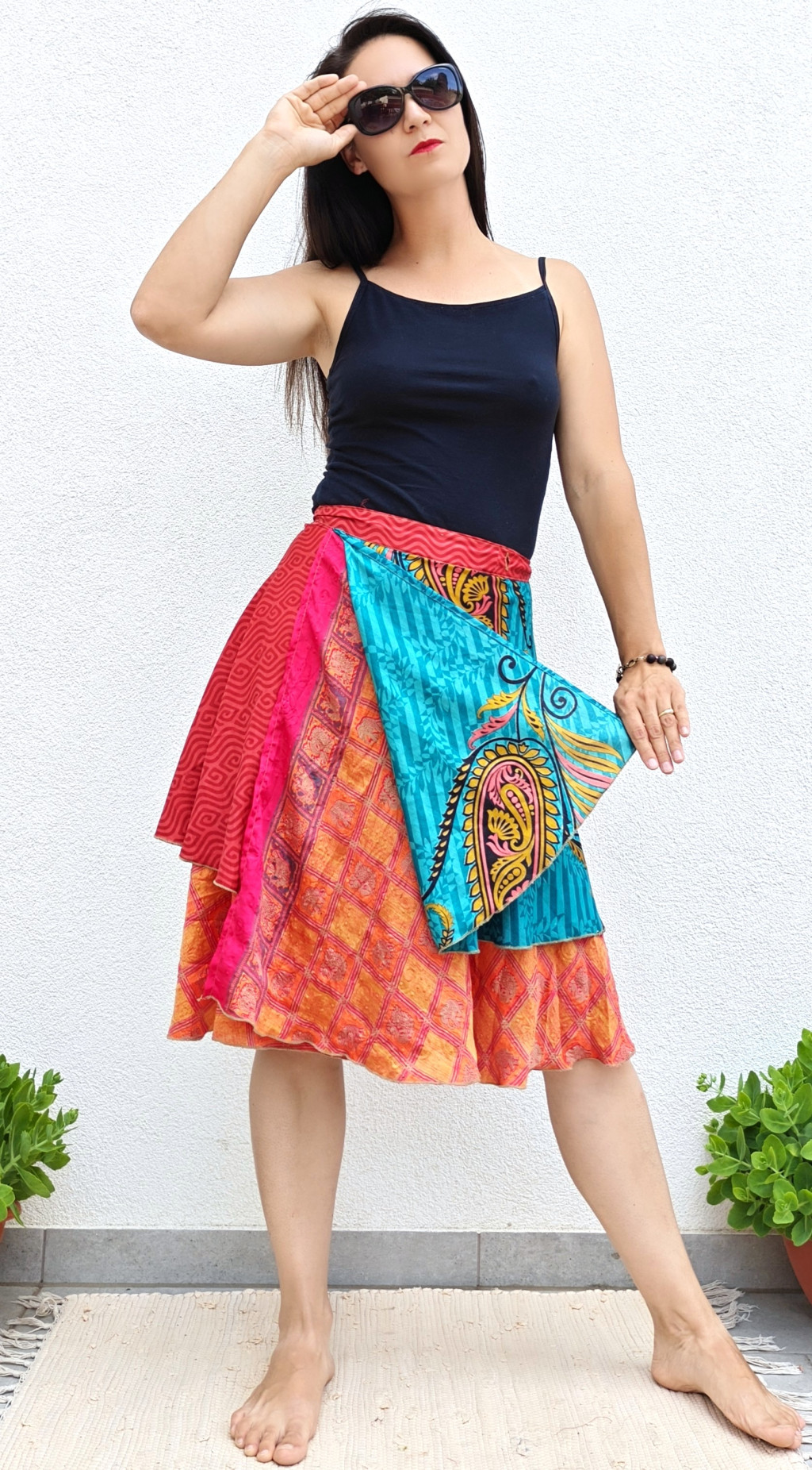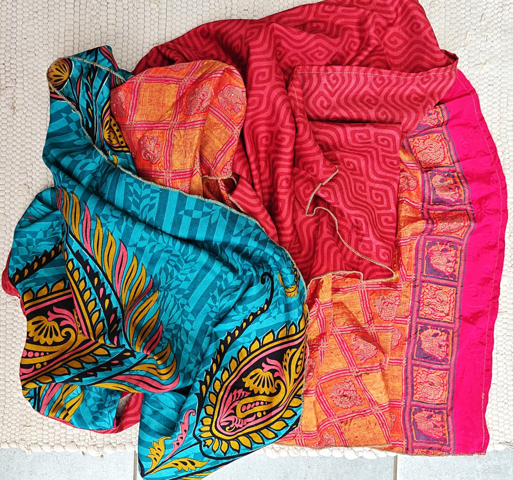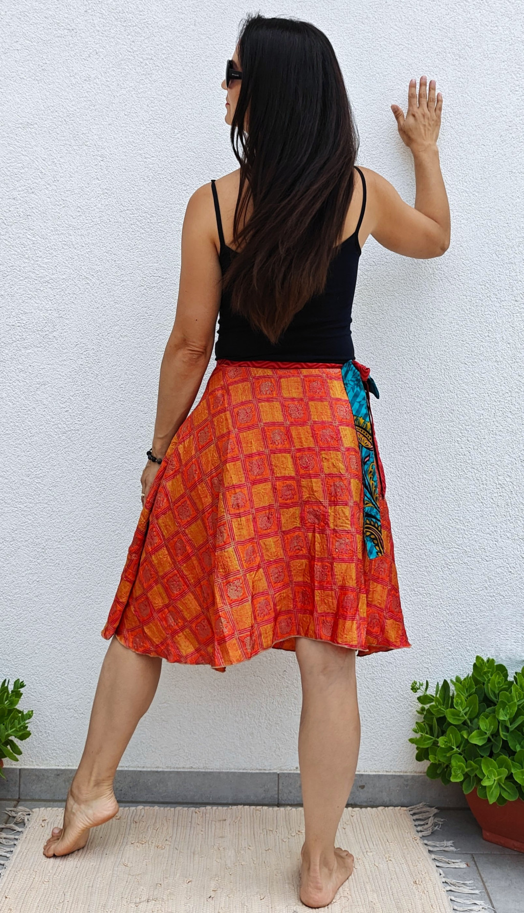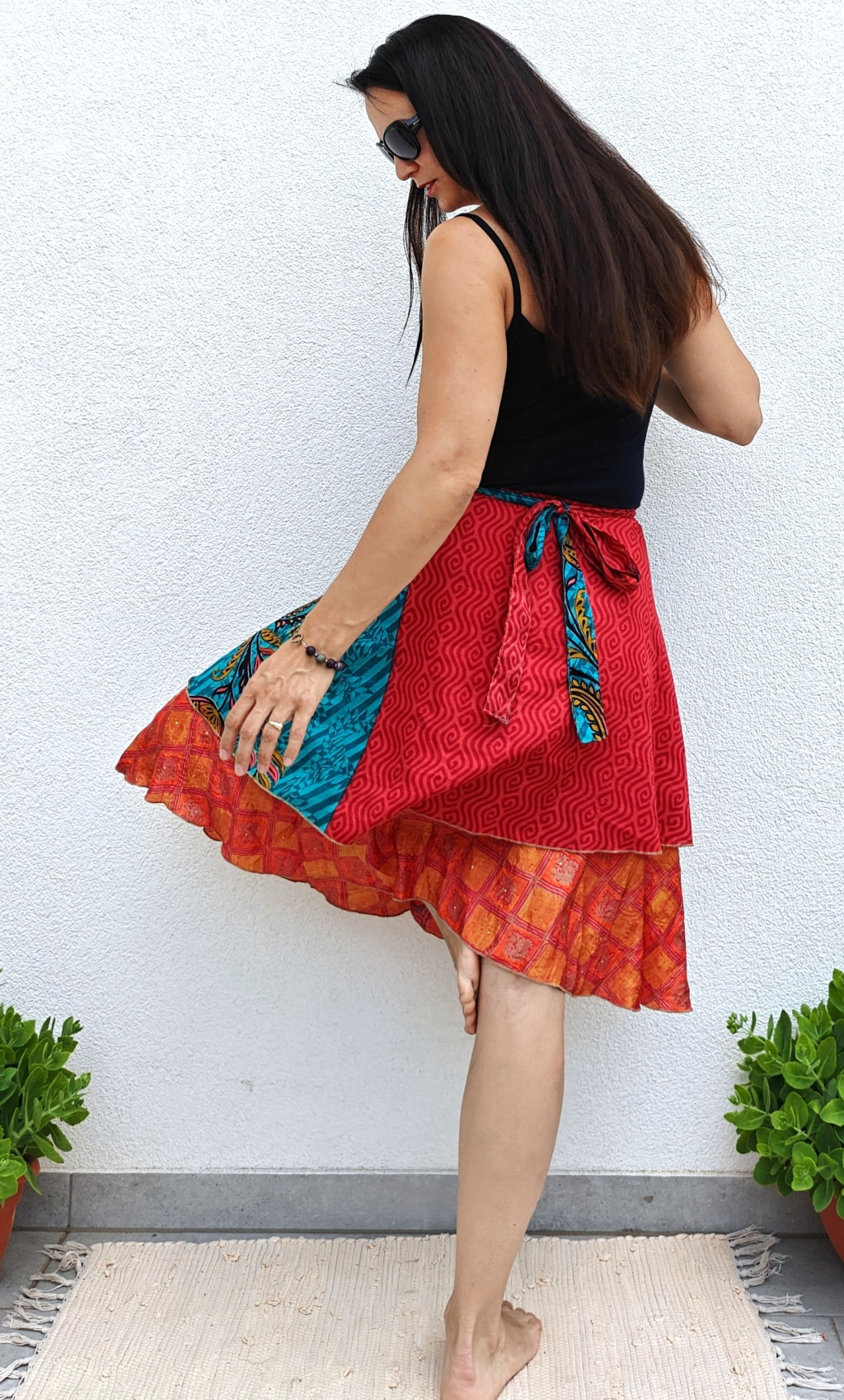 Lapszoknyáink újrahasznosított szárikból készülnek Indiában, egy hosszabb és egy rövidebb anyag derékban összevarrva! Két oldalú, kifordítható, mindkét oldala hordható, sokféleképpen köthető, variálható. Szoknyáinkból nincs két egyforma, mindegyikből csak EGY darab van, ha megtetszik, csapj le rá!