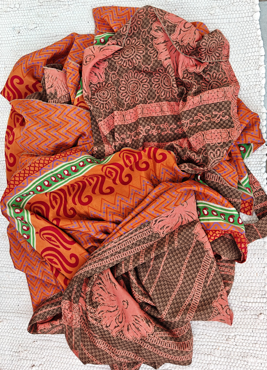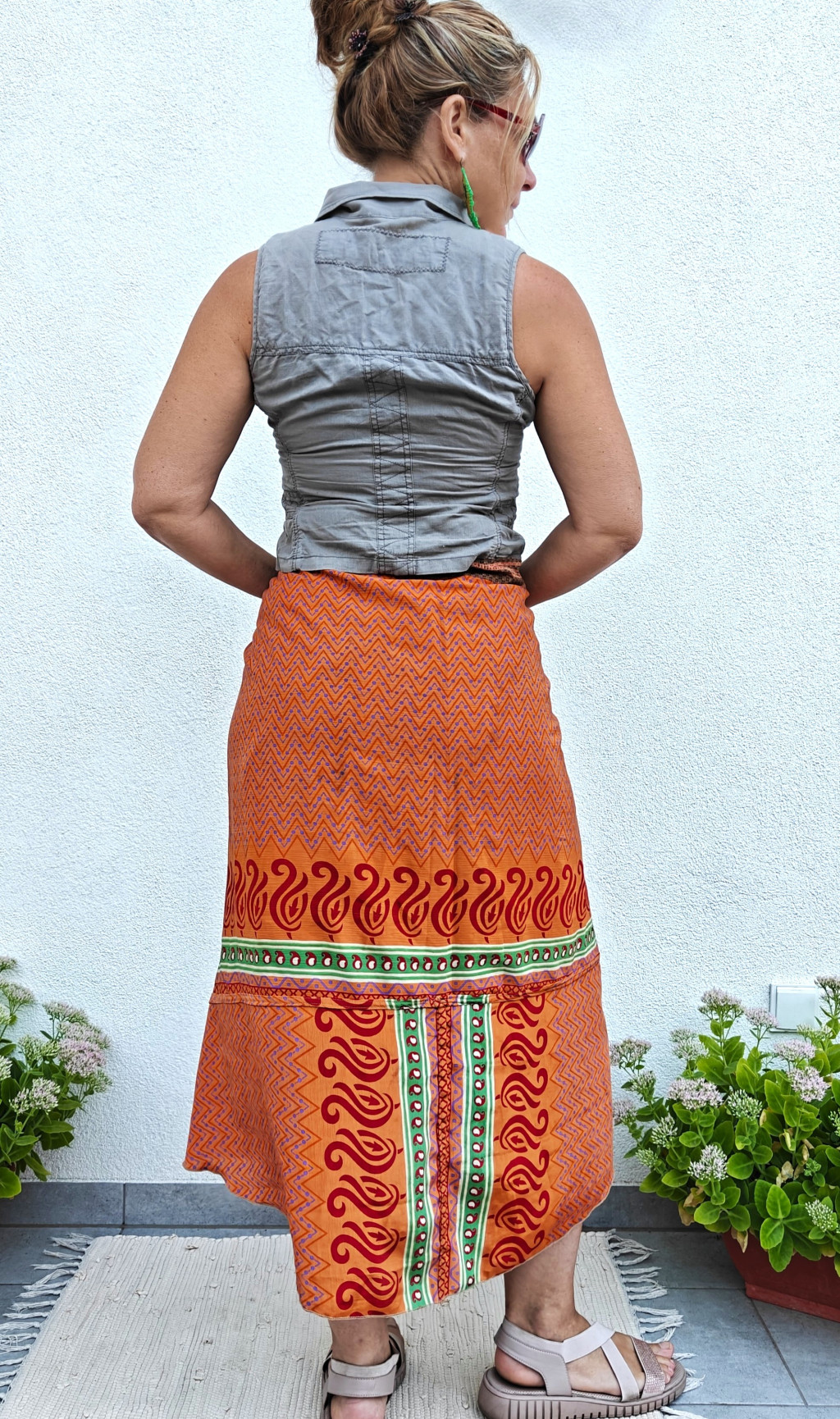 Lapszoknyáink újrahasznosított szárikból készülnek Indiában, egy hosszabb és egy rövidebb anyag derékban összevarrva! Két oldalú, kifordítható, mindkét oldala hordható, sokféleképpen köthető, variálható. Szoknyáinkból nincs két egyforma, mindegyikből csak EGY darab van, ha megtetszik, csapj le rá!