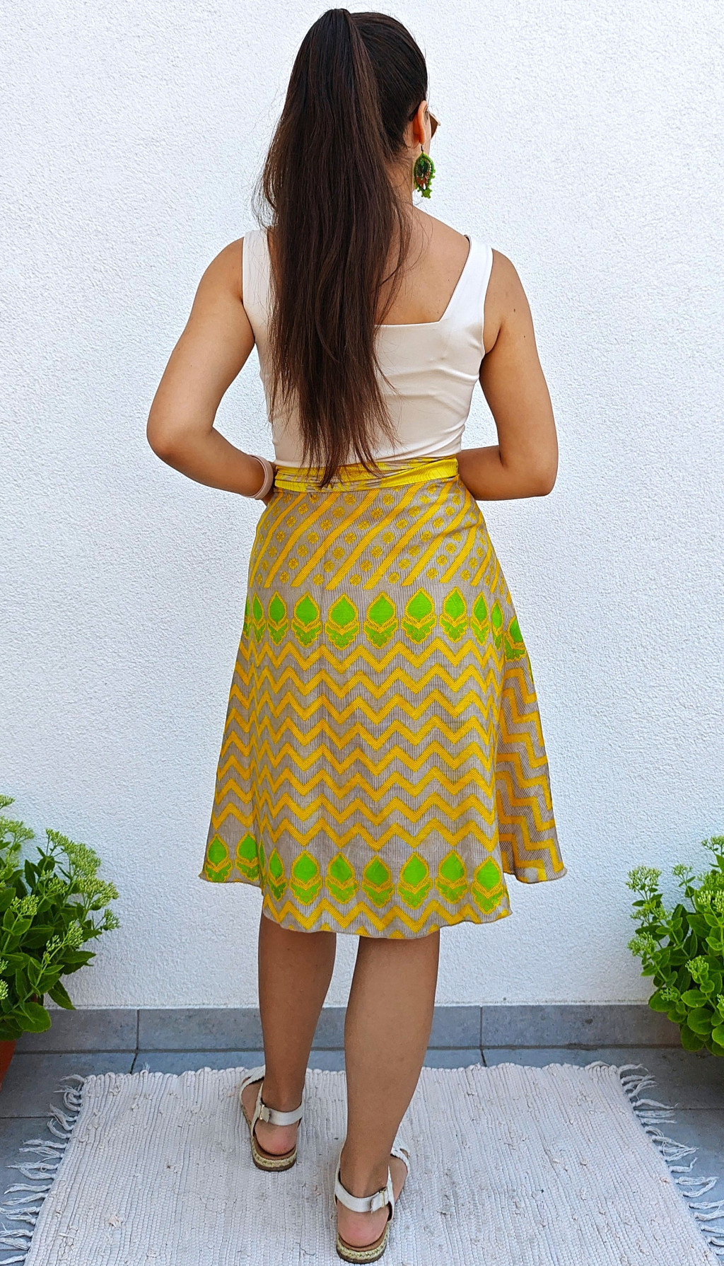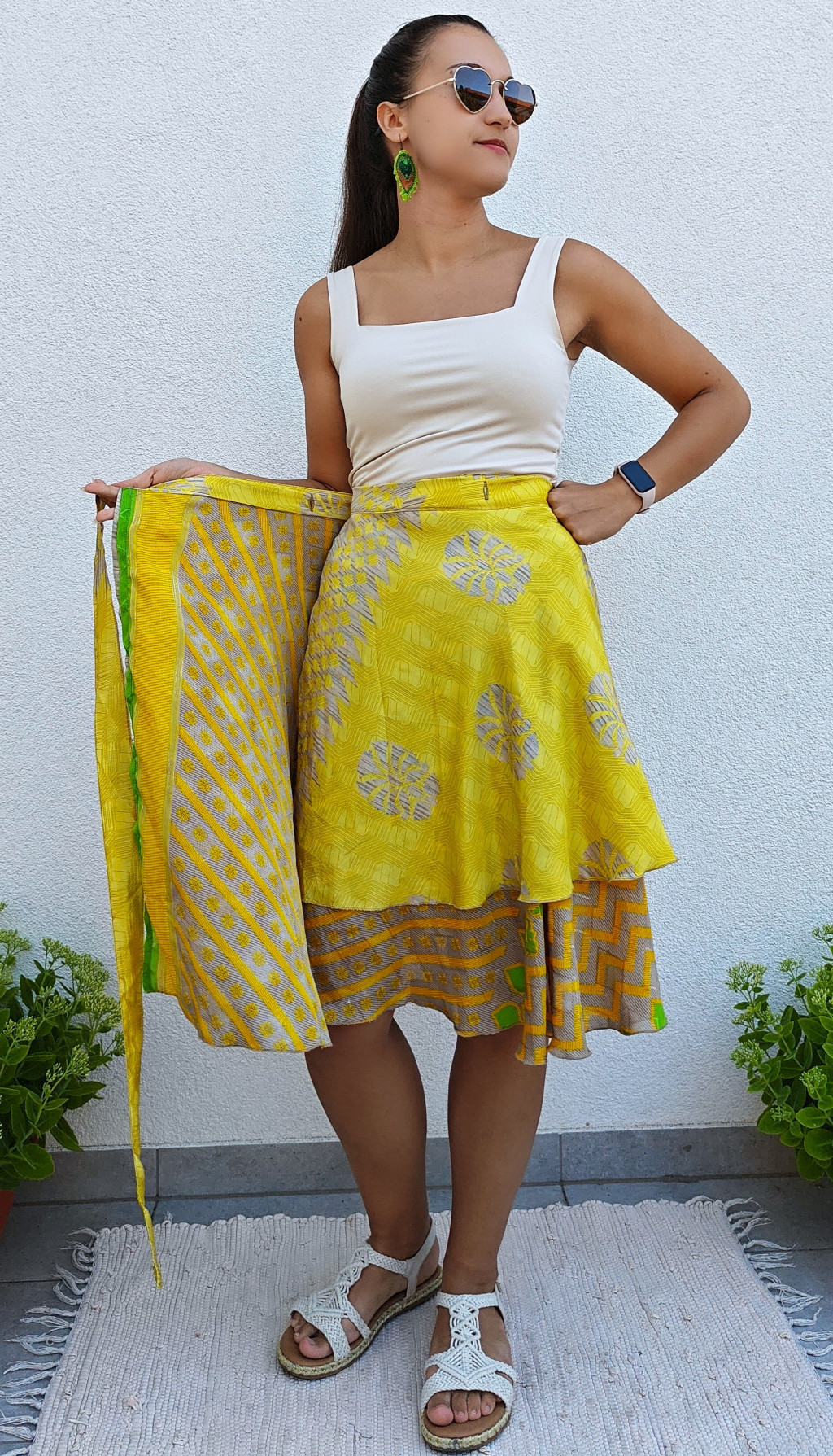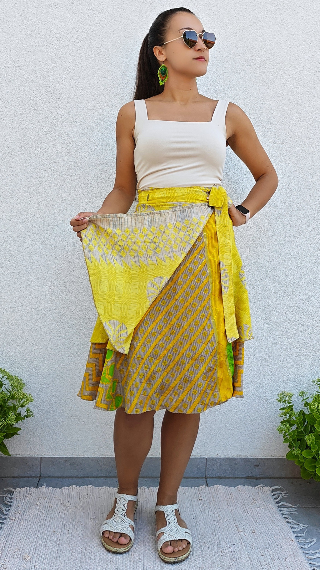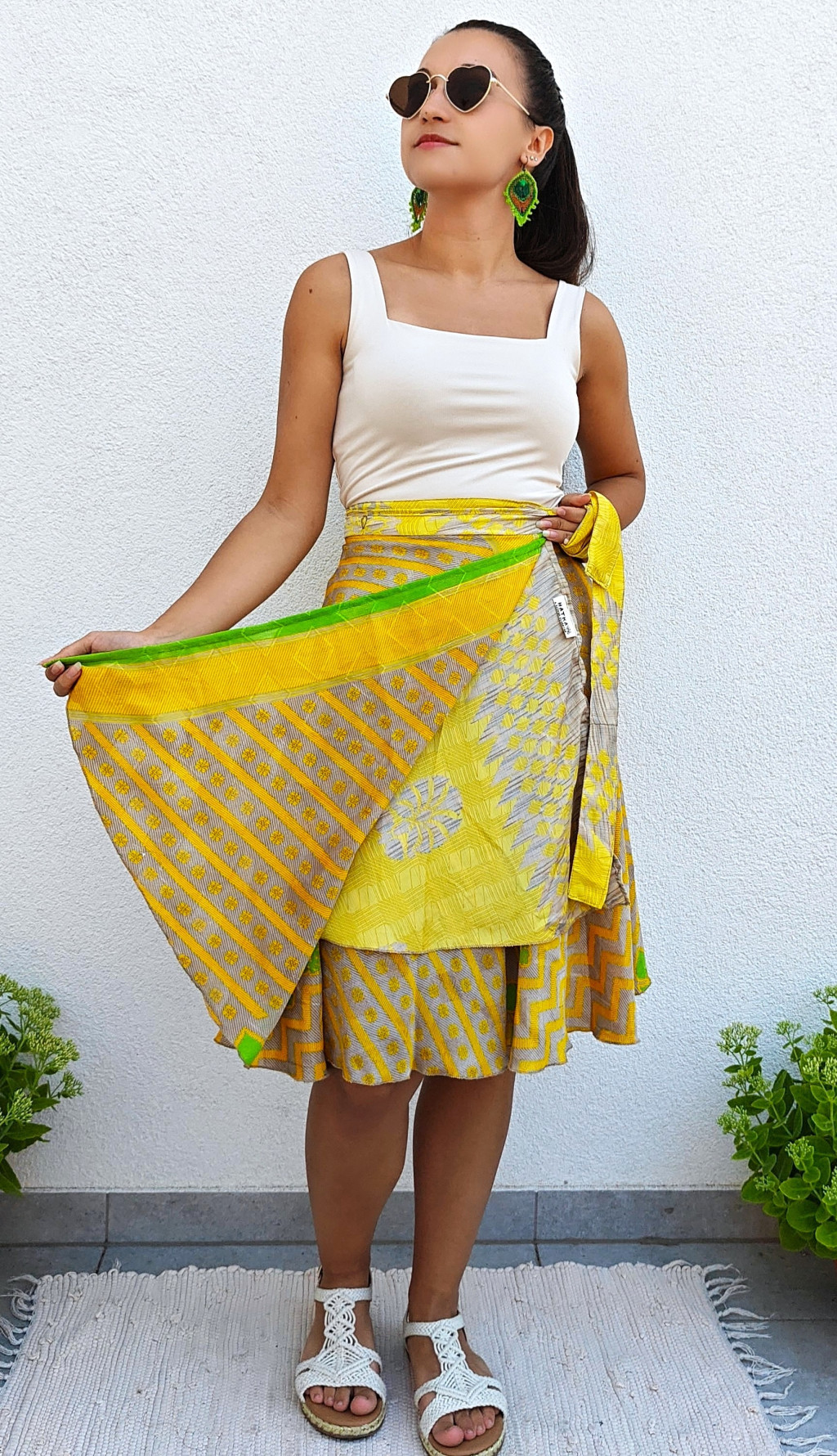 Lapszoknyáink újrahasznosított szárikból készülnek Indiában, egy hosszabb és egy rövidebb anyag derékban összevarrva! Két oldalú, kifordítható, mindkét oldala hordható, sokféleképpen köthető, variálható. Szoknyáinkból nincs két egyforma, mindegyikből csak EGY darab van, ha megtetszik, csapj le rá!