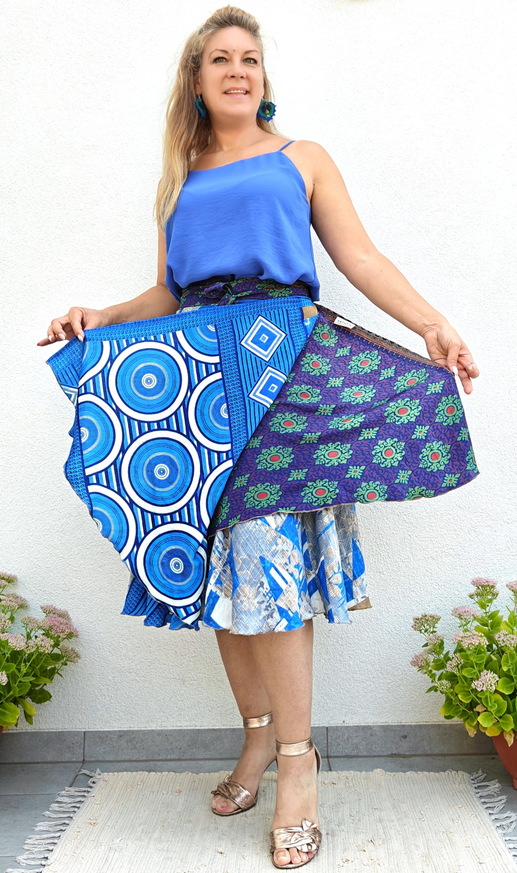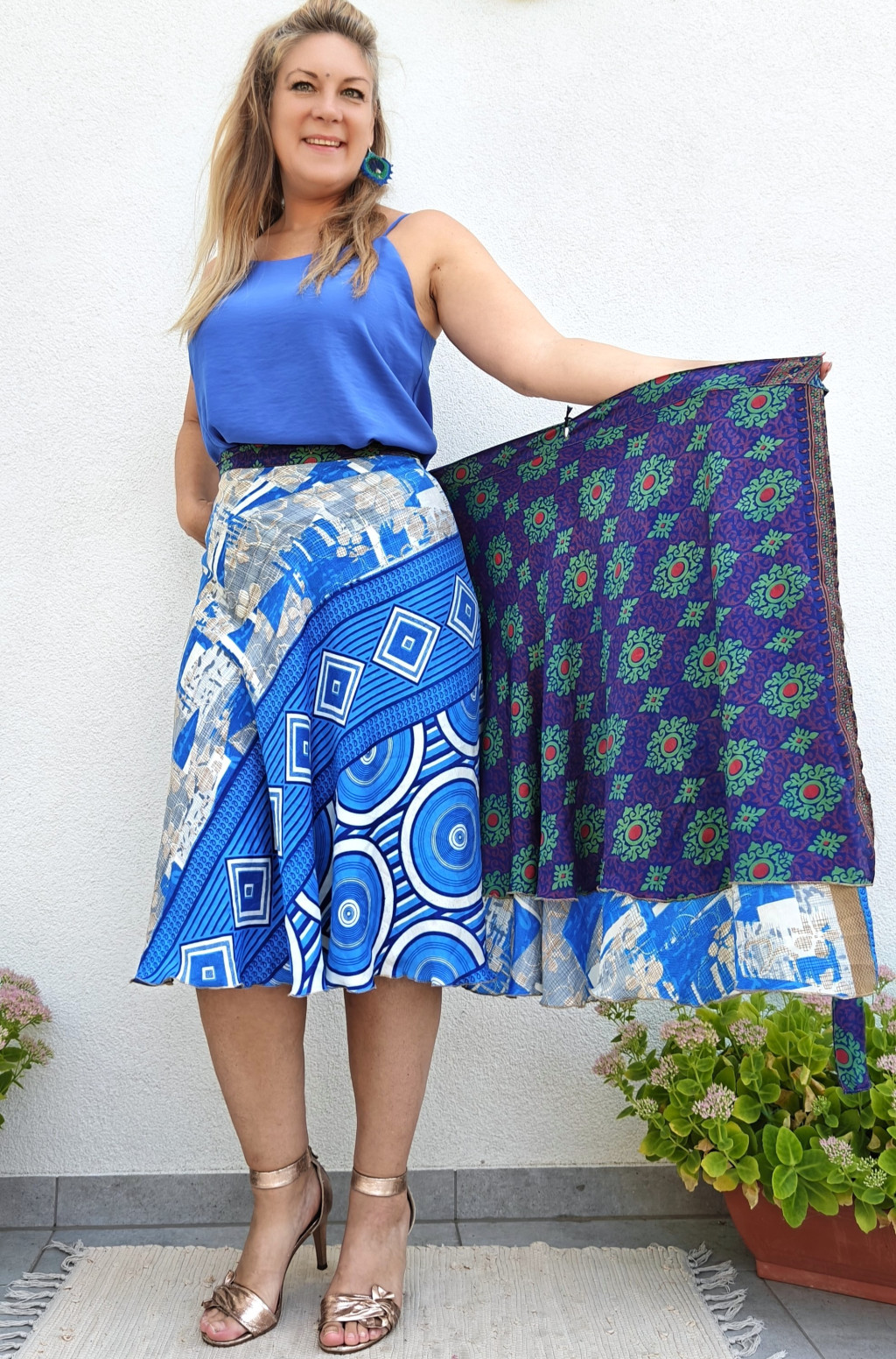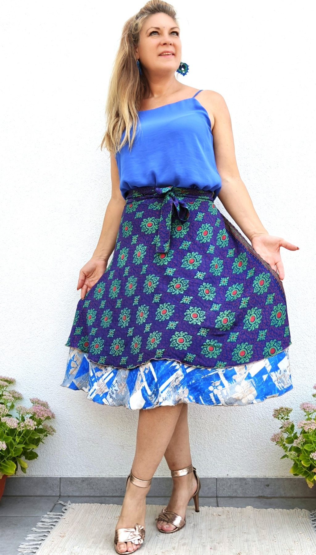 Lapszoknyáink újrahasznosított szárikból készülnek Indiában, egy hosszabb és egy rövidebb anyag derékban összevarrva! Két oldalú, kifordítható, mindkét oldala hordható, sokféleképpen köthető, variálható. Szoknyáinkból nincs két egyforma, mindegyikből csak EGY darab van, ha megtetszik, csapj le rá!