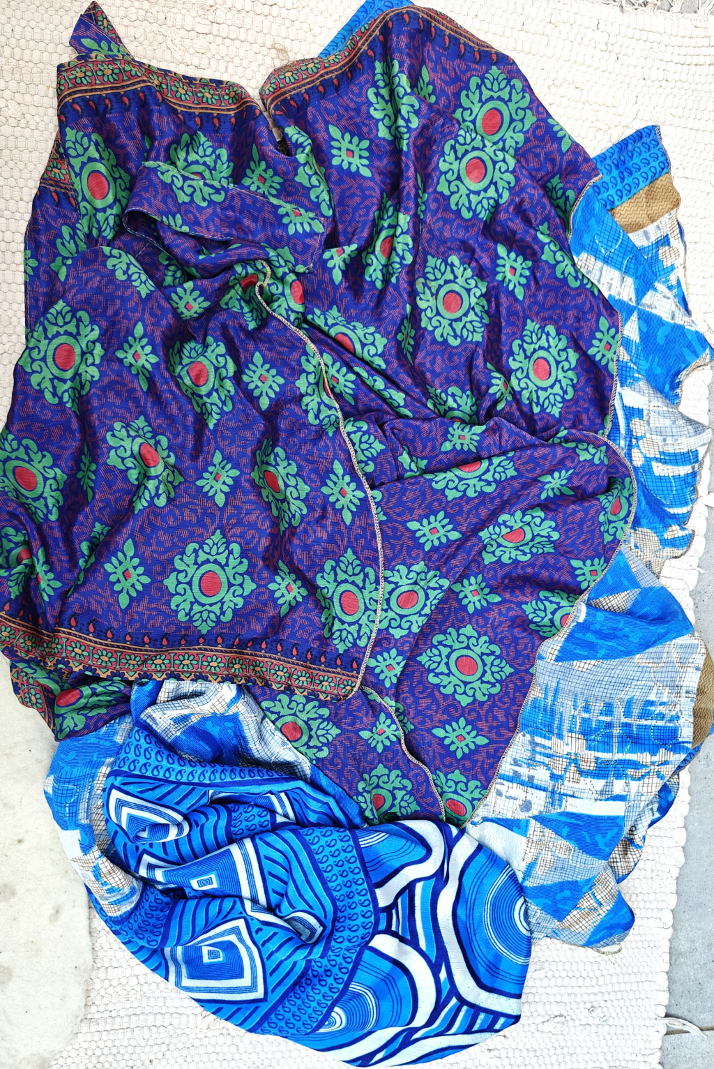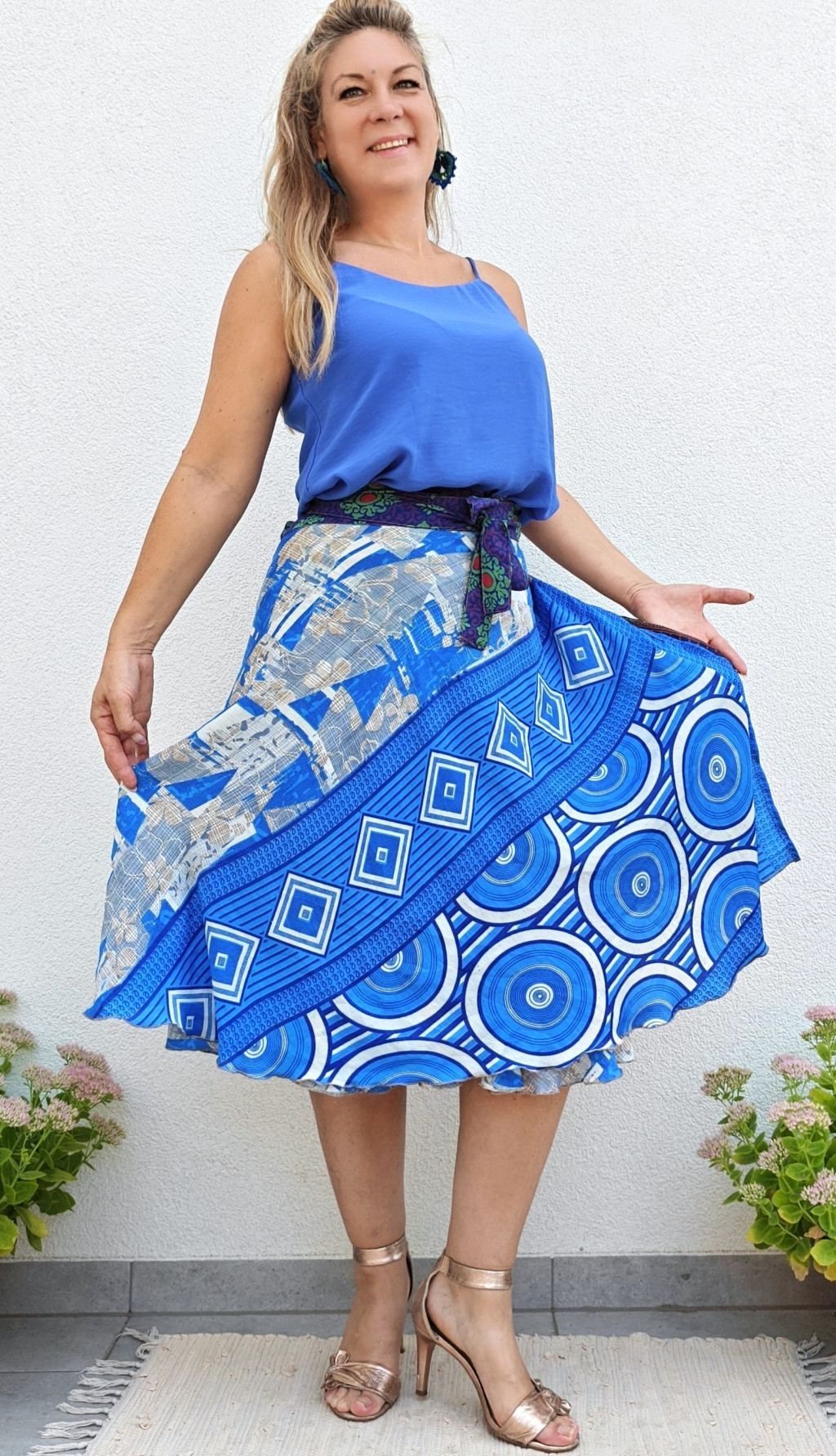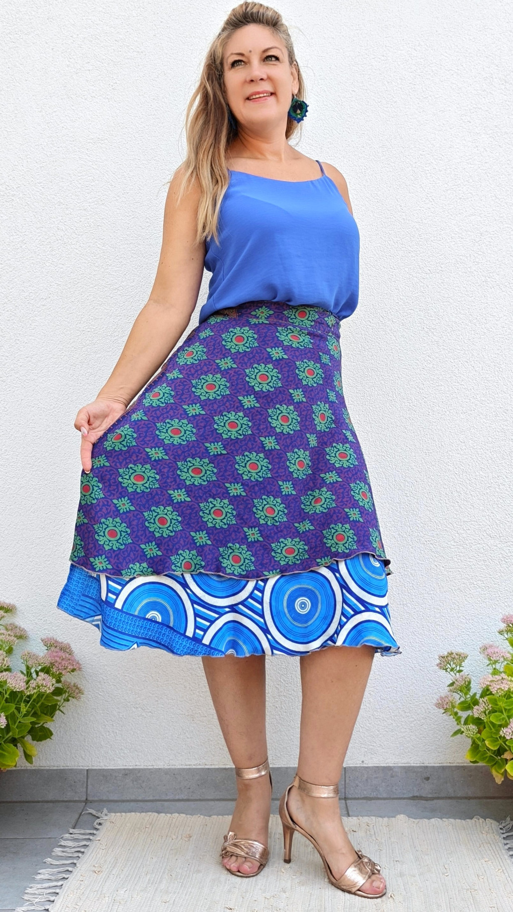 Lapszoknyáink újrahasznosított szárikból készülnek Indiában, egy hosszabb és egy rövidebb anyag derékban összevarrva! Két oldalú, kifordítható, mindkét oldala hordható, sokféleképpen köthető, variálható. Szoknyáinkból nincs két egyforma, mindegyikből csak EGY darab van, ha megtetszik, csapj le rá!