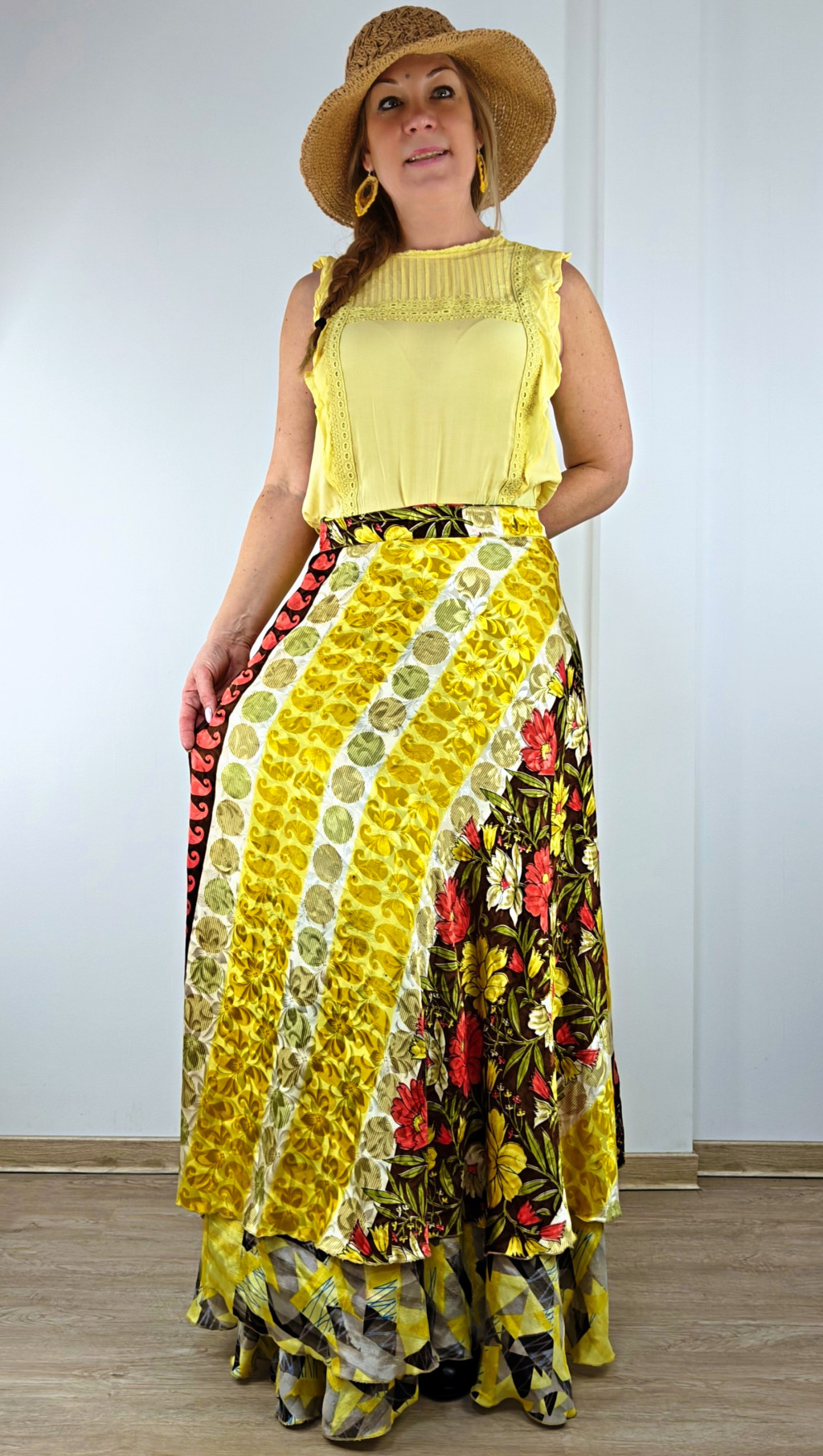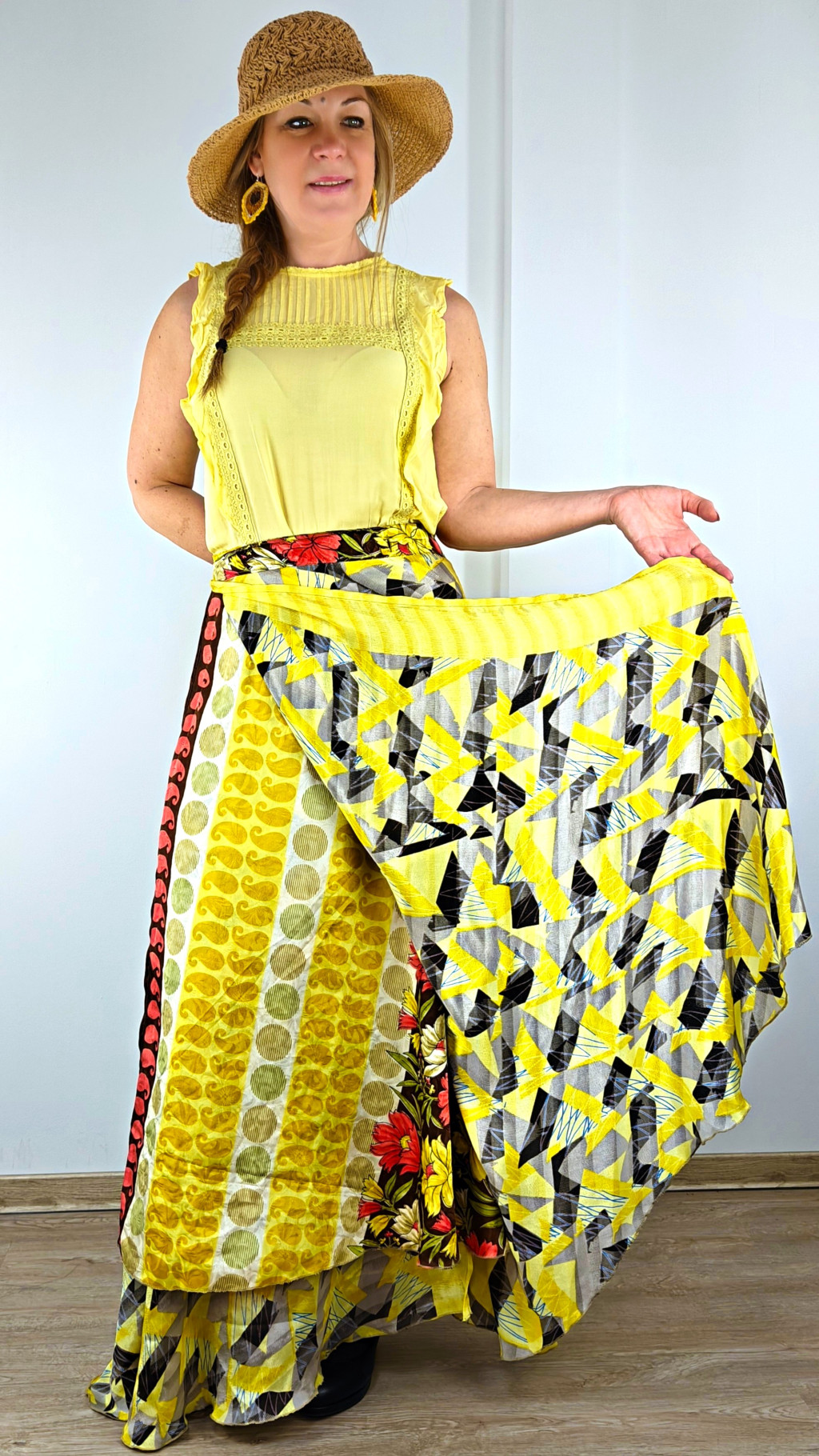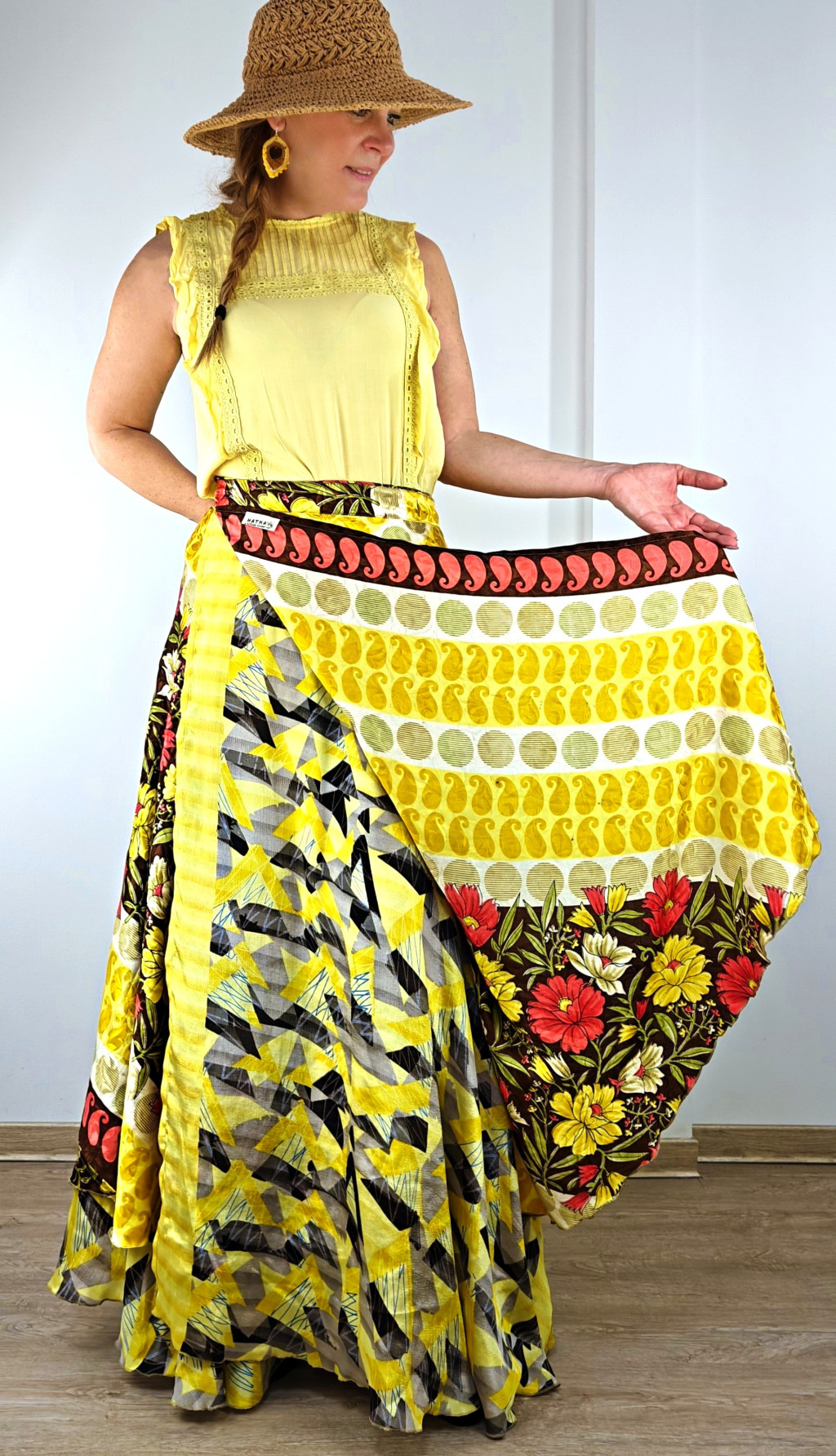 Lapszoknyáink újrahasznosított szárikból készülnek Indiában, egy hosszabb és egy rövidebb anyag derékban összevarrva! Két oldalú, kifordítható, mindkét oldala hordható, sokféleképpen köthető, variálható. Szoknyáinkból nincs két egyforma, mindegyikből csak EGY darab van, ha megtetszik, csapj le rá!