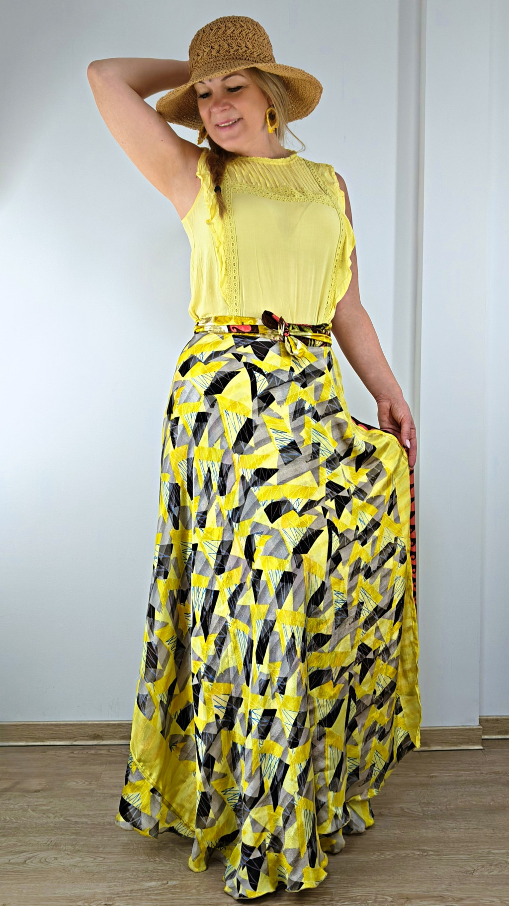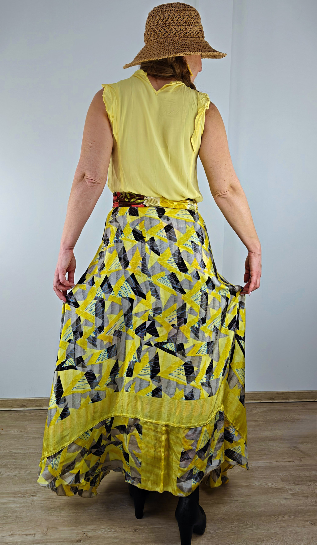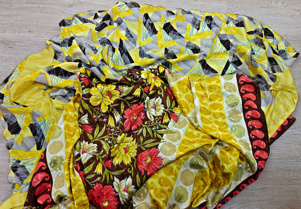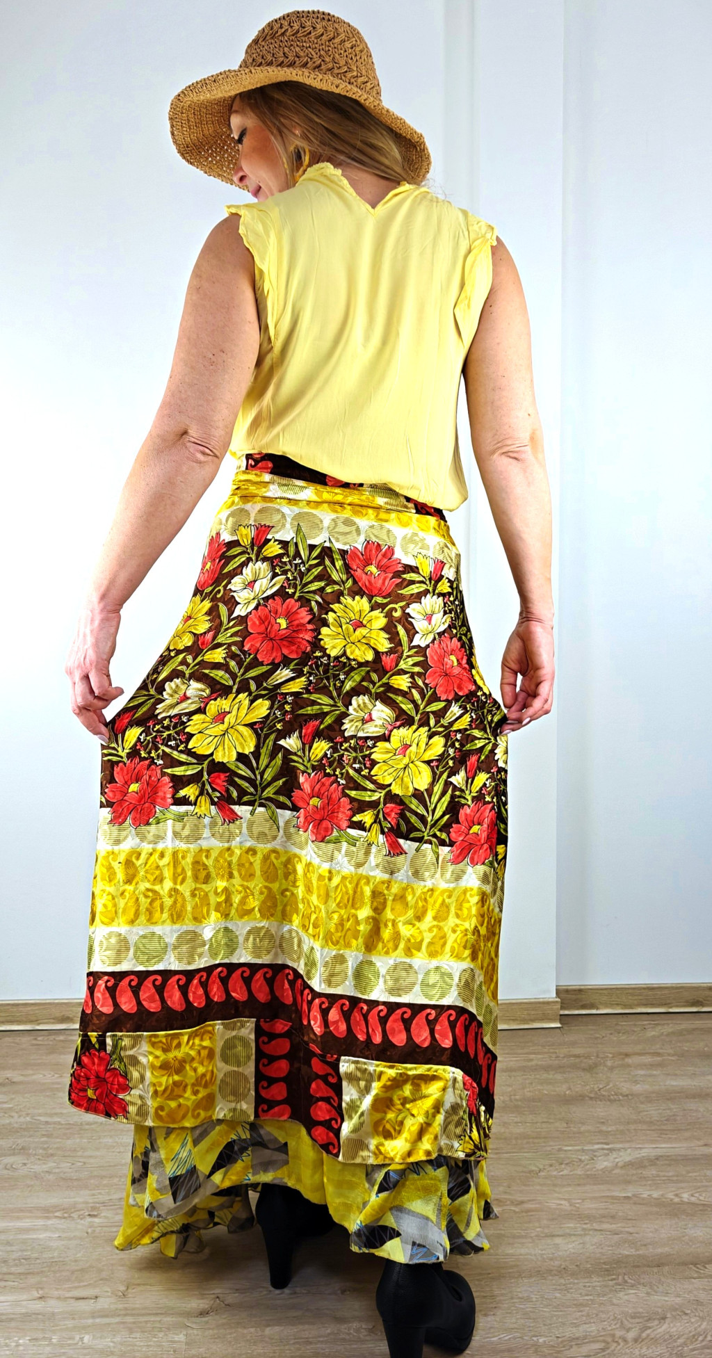 Lapszoknyáink újrahasznosított szárikból készülnek Indiában, egy hosszabb és egy rövidebb anyag derékban összevarrva! Két oldalú, kifordítható, mindkét oldala hordható, sokféleképpen köthető, variálható. Szoknyáinkból nincs két egyforma, mindegyikből csak EGY darab van, ha megtetszik, csapj le rá!
