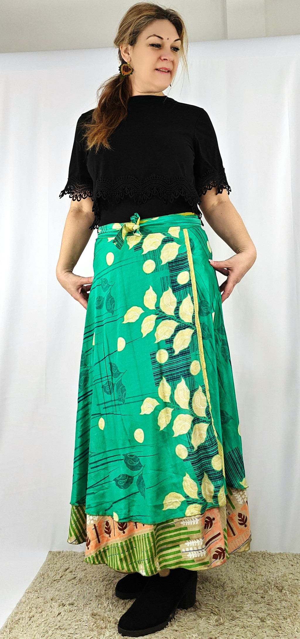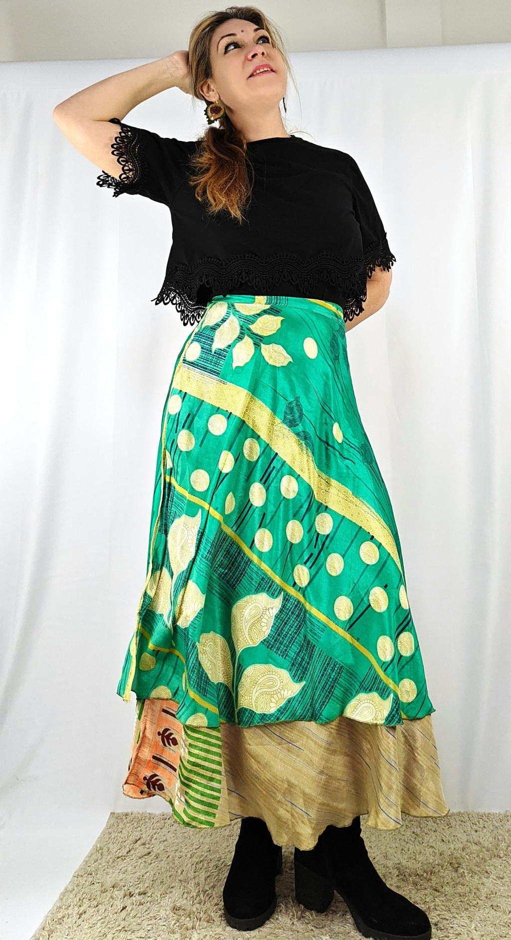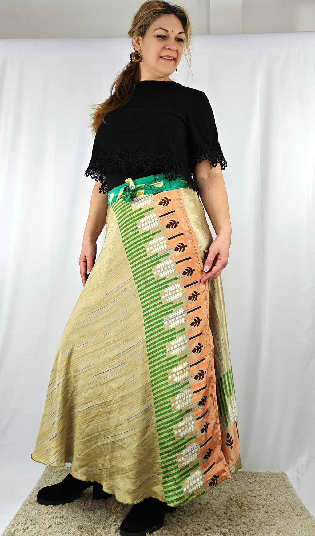 Lapszoknyáink újrahasznosított szárikból készülnek Indiában, egy hosszabb és egy rövidebb anyag derékban összevarrva! Két oldalú, kifordítható, mindkét oldala hordható, sokféleképpen köthető, variálható. Szoknyáinkból nincs két egyforma, mindegyikből csak EGY darab van, ha megtetszik, csapj le rá!