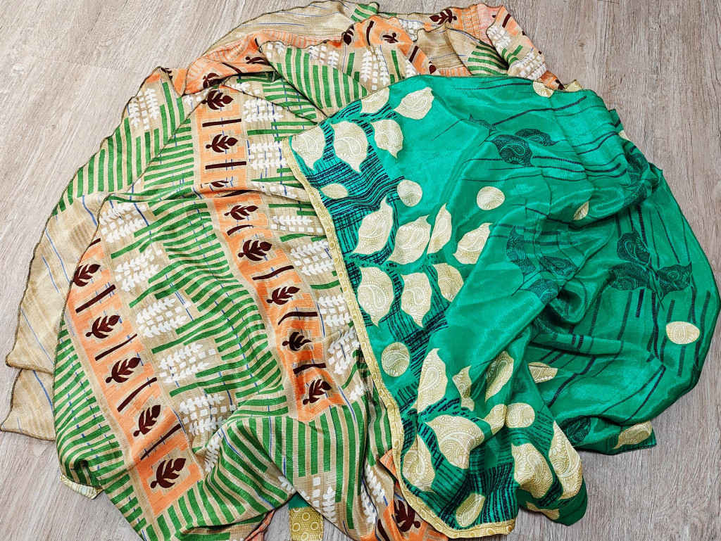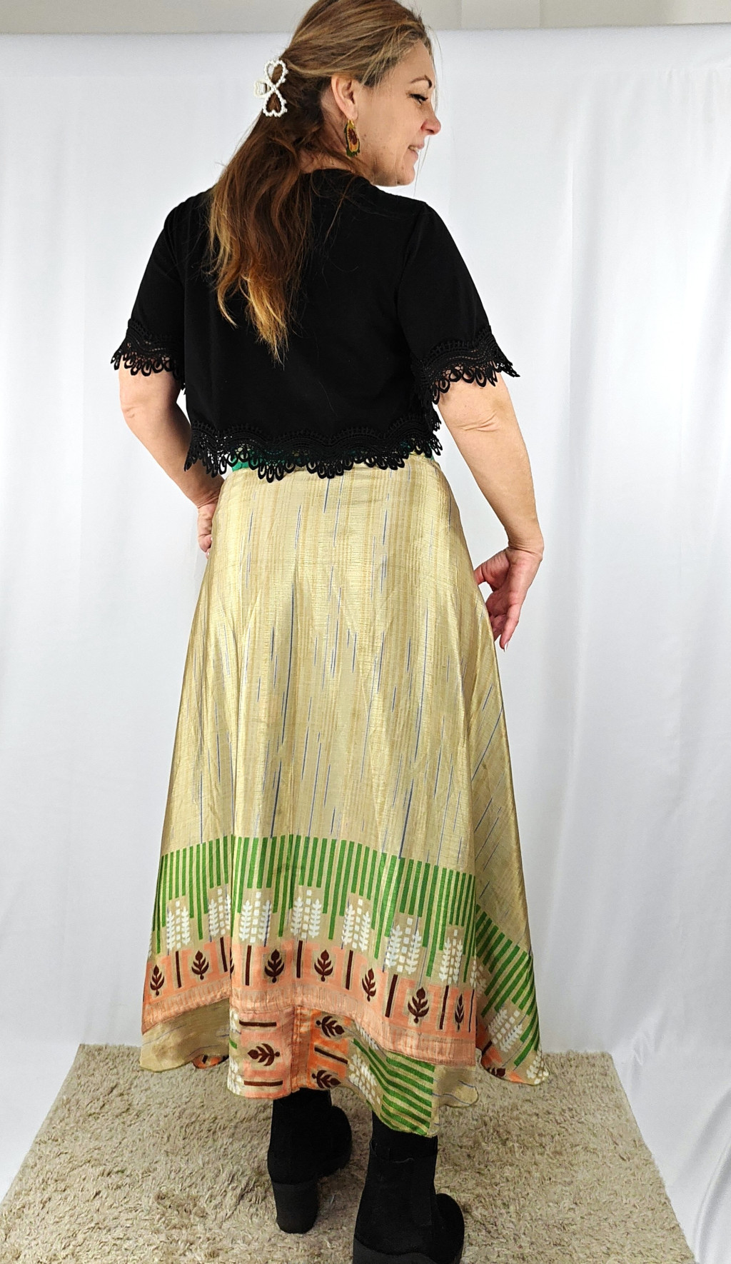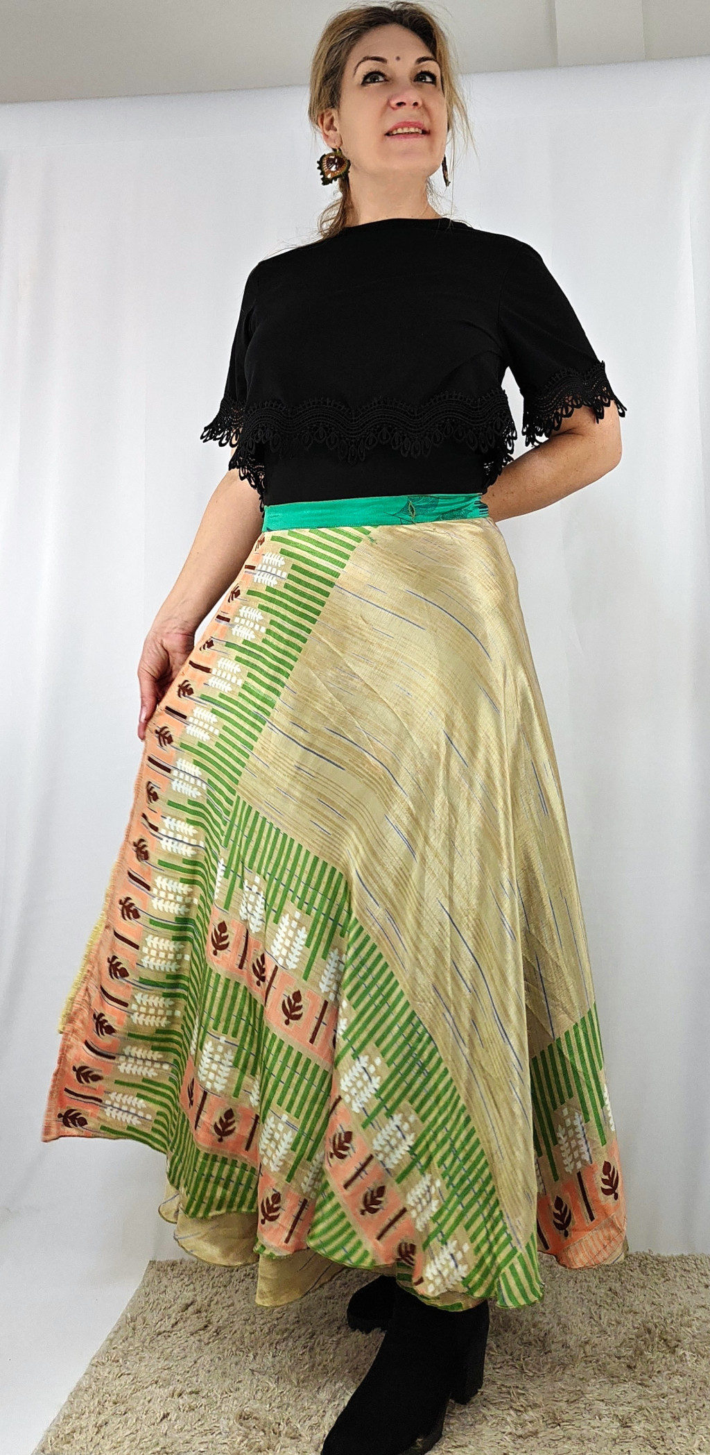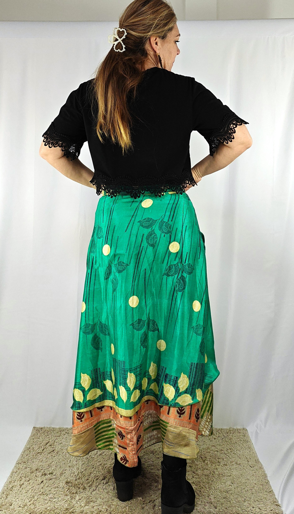Lapszoknyáink újrahasznosított szárikból készülnek Indiában, egy hosszabb és egy rövidebb anyag derékban összevarrva! Két oldalú, kifordítható, mindkét oldala hordható, sokféleképpen köthető, variálható. Szoknyáinkból nincs két egyforma, mindegyikből csak EGY darab van, ha megtetszik, csapj le rá!