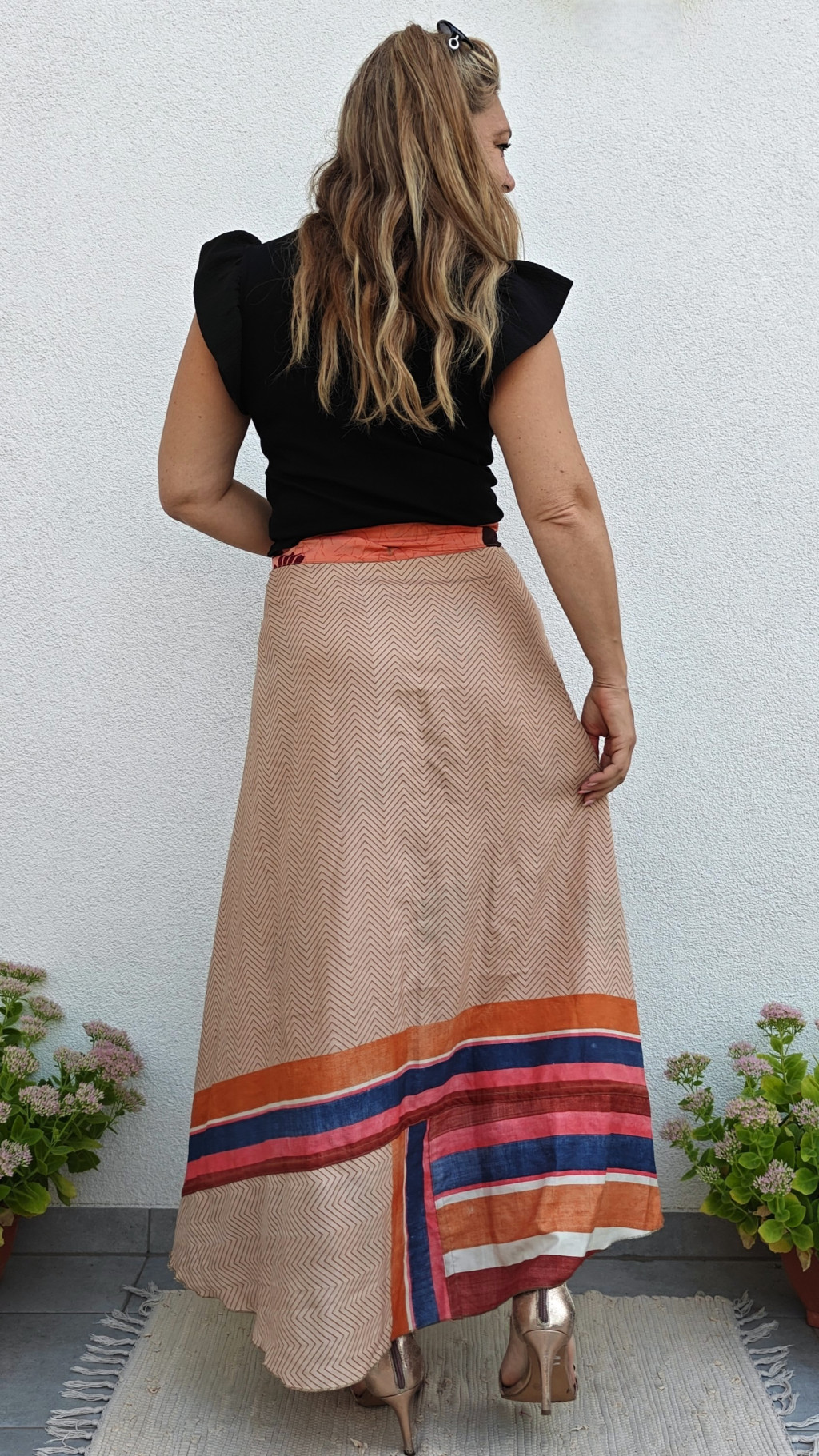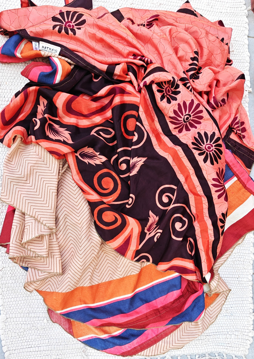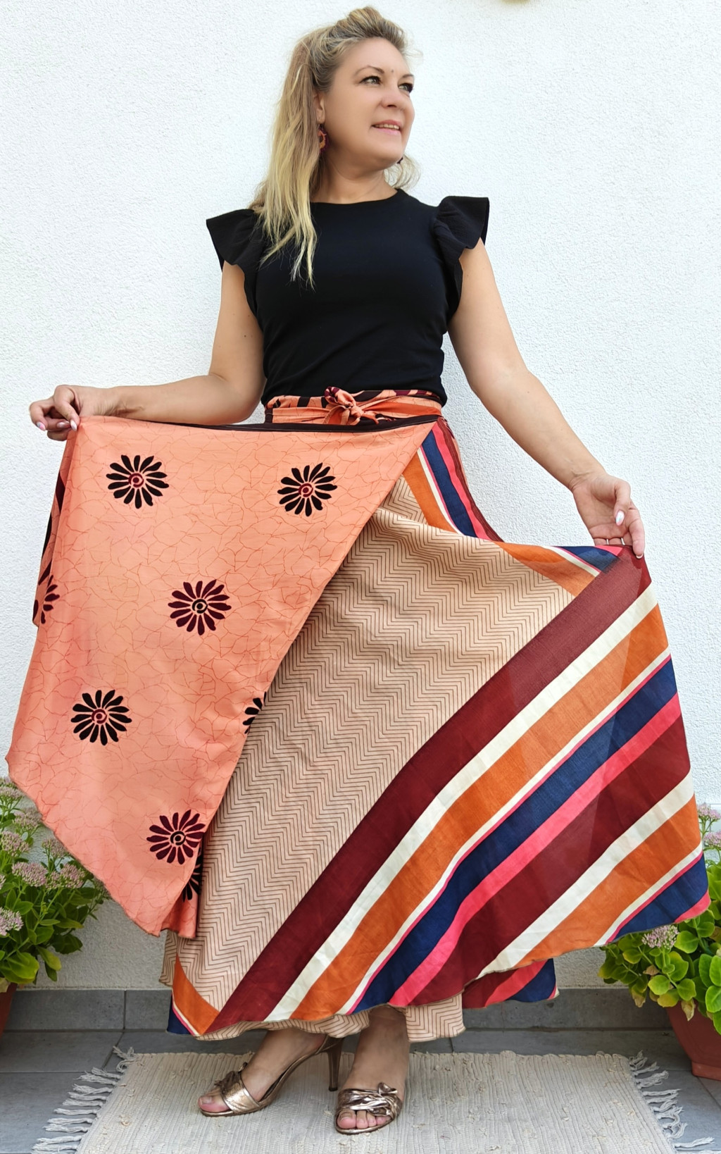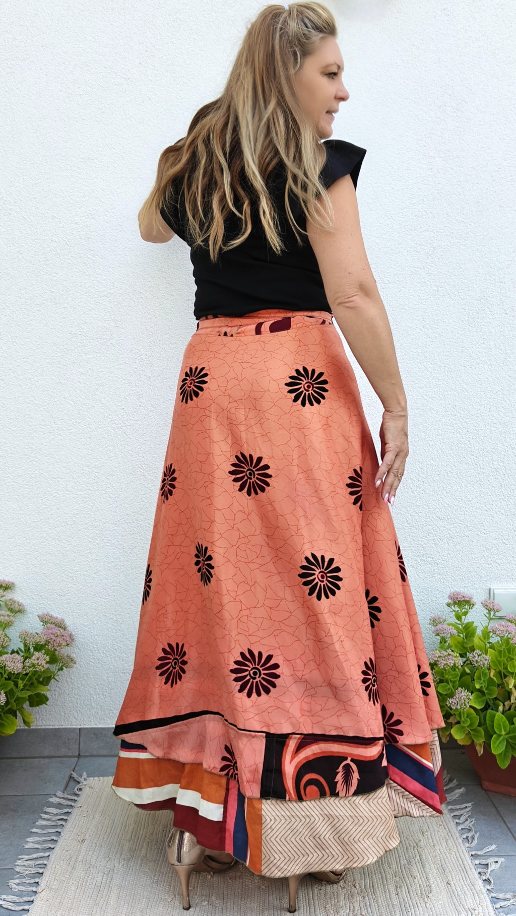 Lapszoknyáink újrahasznosított szárikból készülnek Indiában, egy hosszabb és egy rövidebb anyag derékban összevarrva! Két oldalú, kifordítható, mindkét oldala hordható, sokféleképpen köthető, variálható. Szoknyáinkból nincs két egyforma, mindegyikből csak EGY darab van, ha megtetszik, csapj le rá!