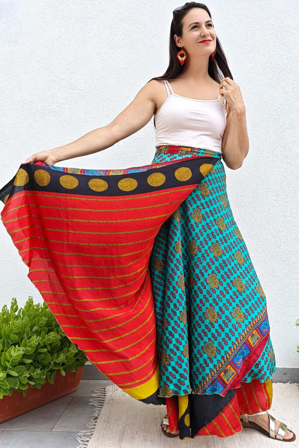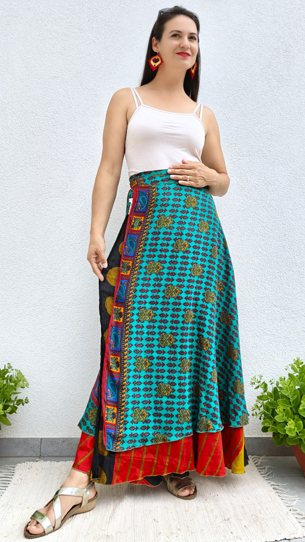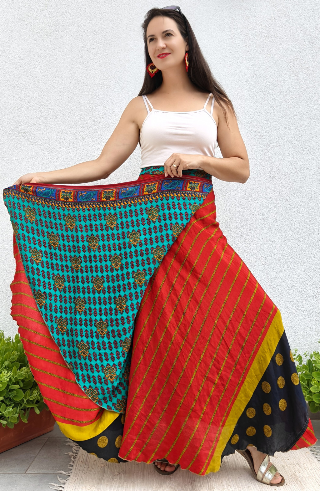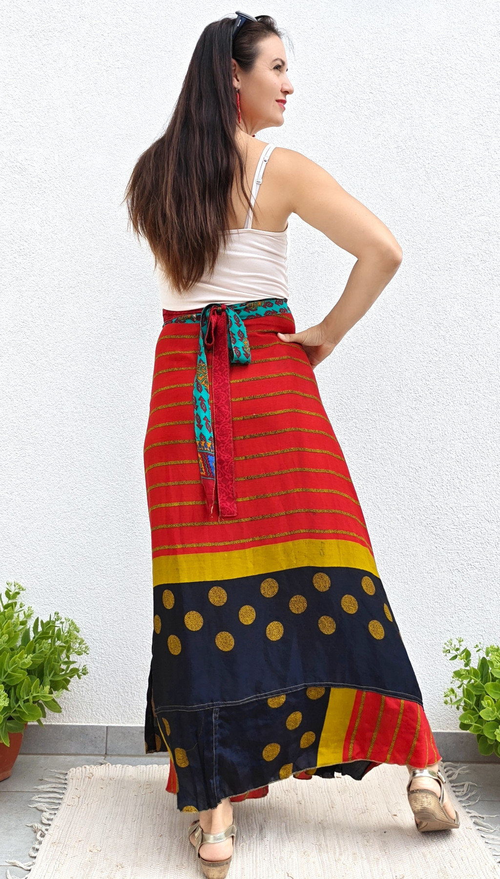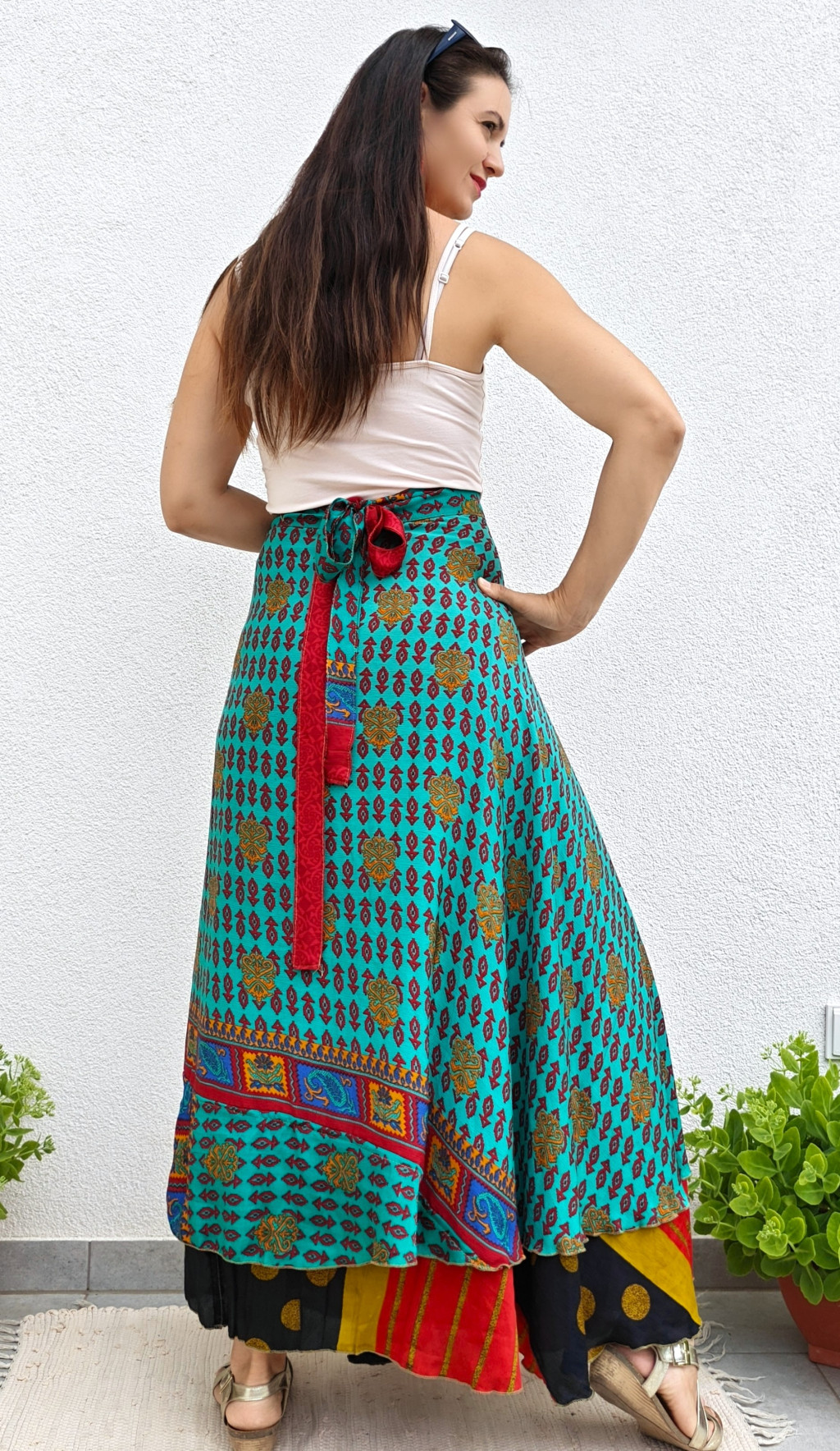 Lapszoknyáink újrahasznosított szárikból készülnek Indiában, egy hosszabb és egy rövidebb anyag derékban összevarrva! Kifordítható, mindkét oldala hordható, sokféleképpen köthető, variálható. Szoknyáinkból nincs két egyforma, mindegyikből csak EGY darab van, ha megtetszik, csapj le rá!