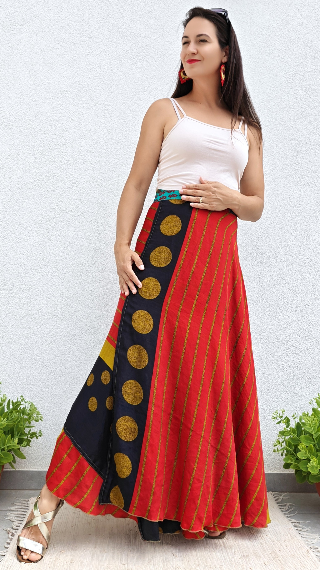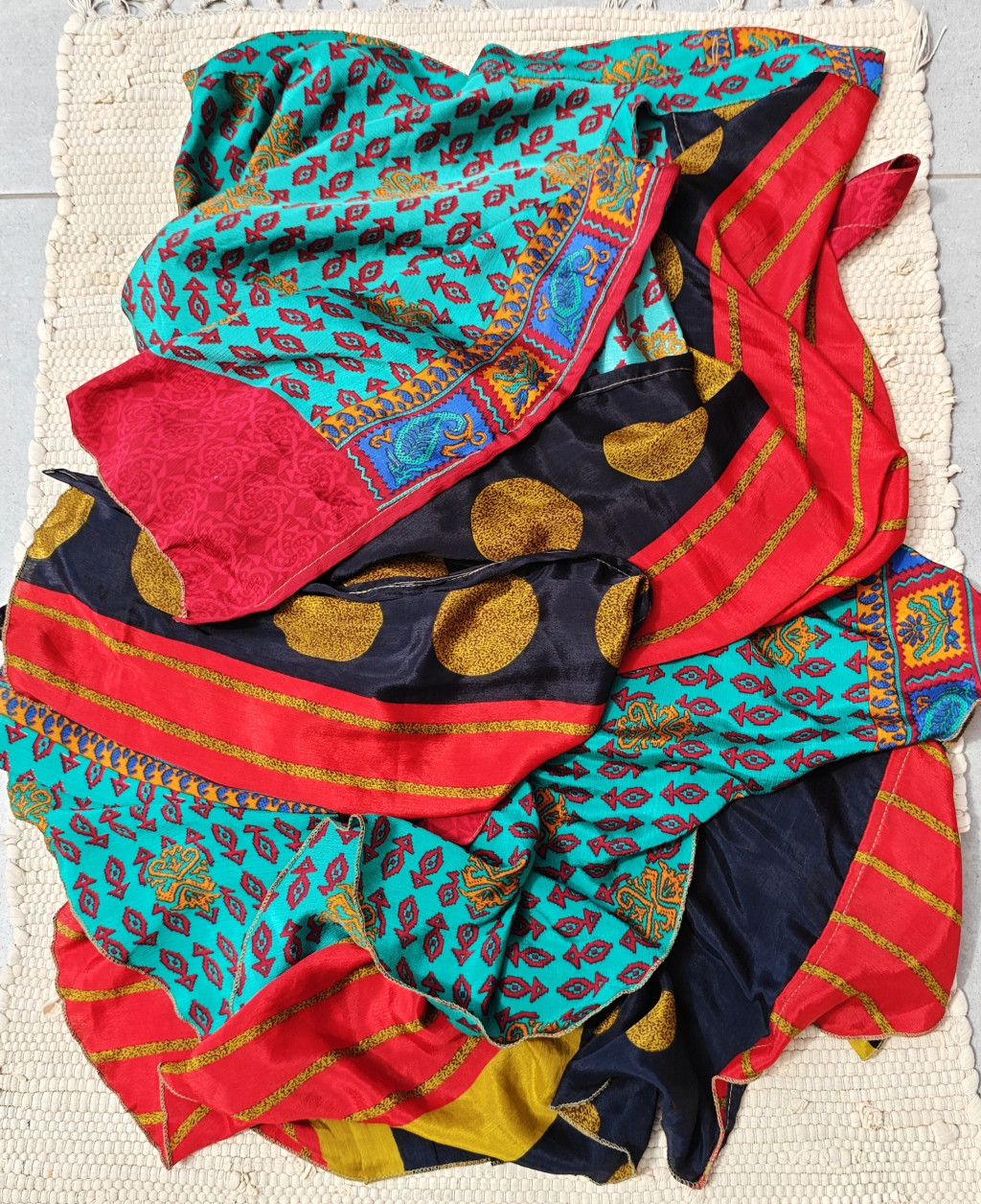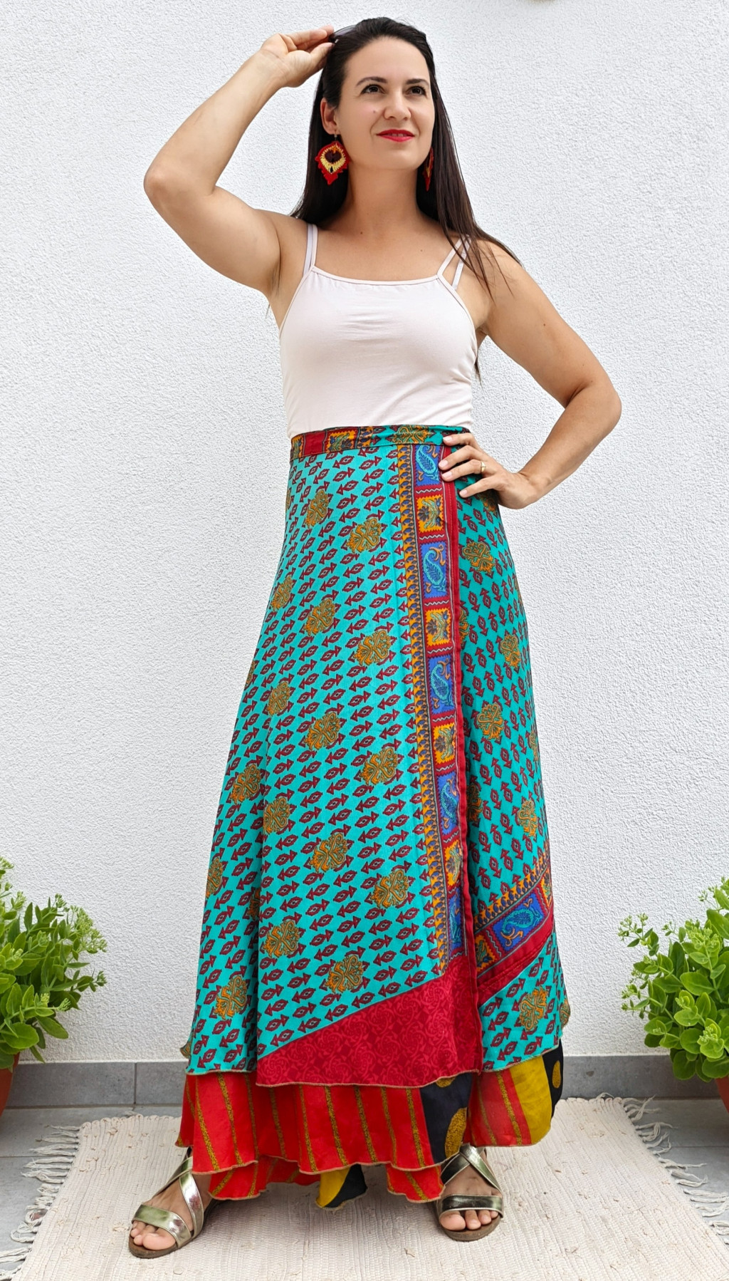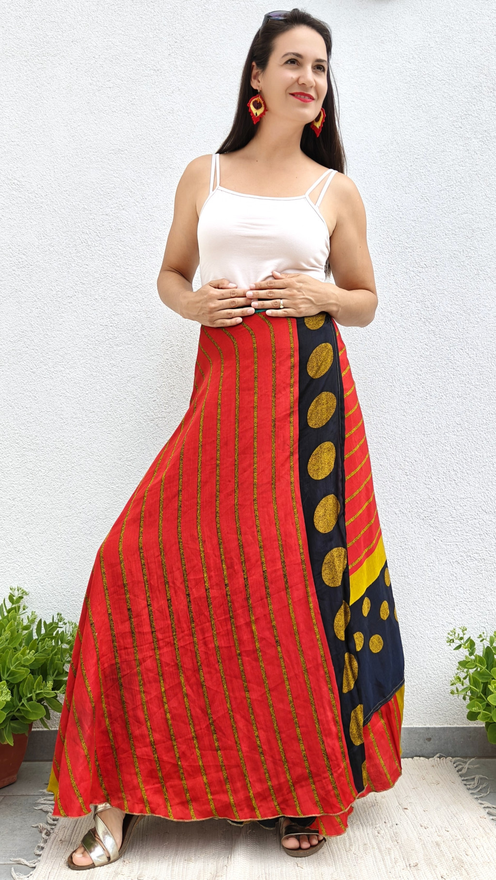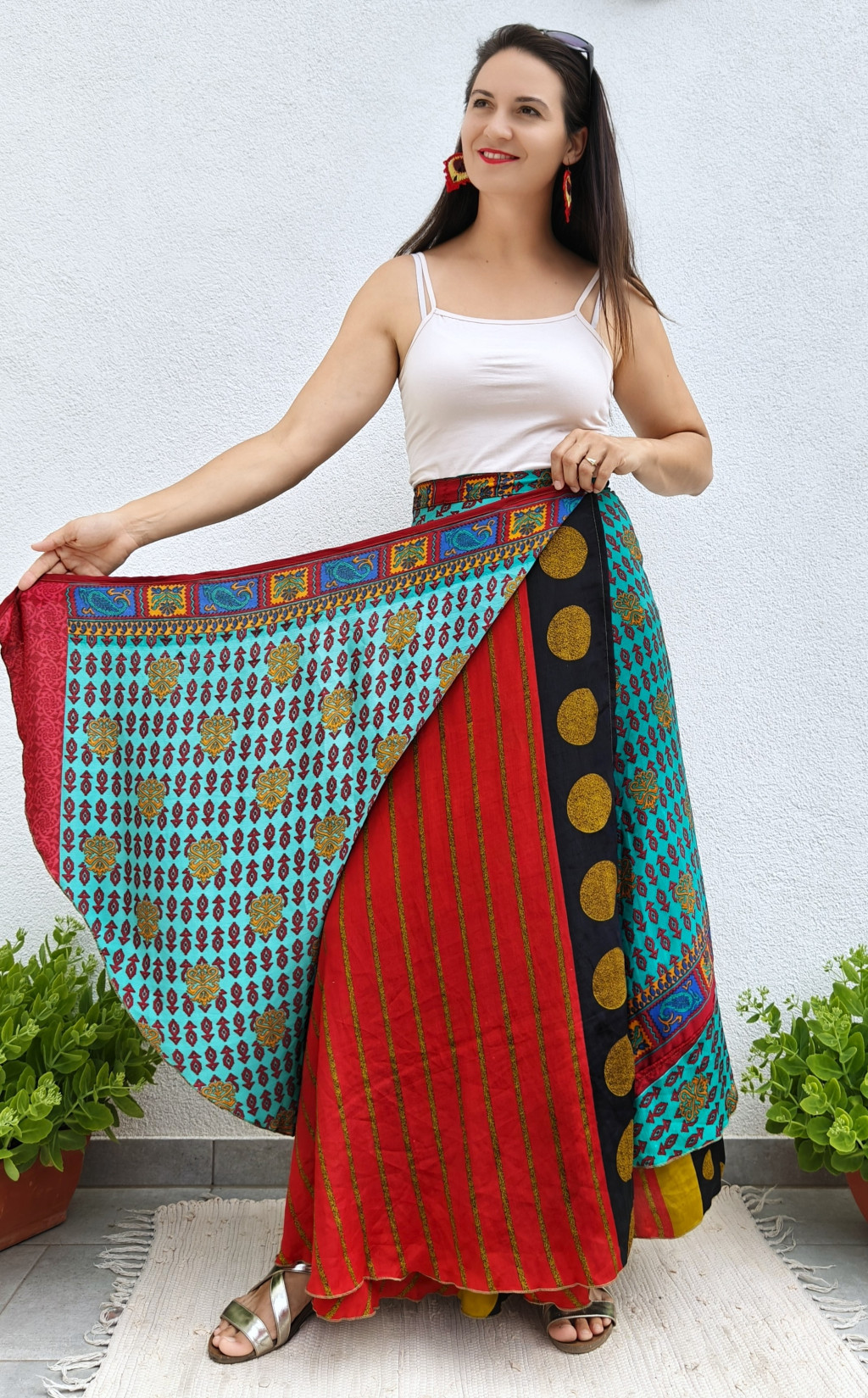 Lapszoknyáink újrahasznosított szárikból készülnek Indiában, egy hosszabb és egy rövidebb anyag derékban összevarrva! Kifordítható, mindkét oldala hordható, sokféleképpen köthető, variálható. Szoknyáinkból nincs két egyforma, mindegyikből csak EGY darab van, ha megtetszik, csapj le rá!