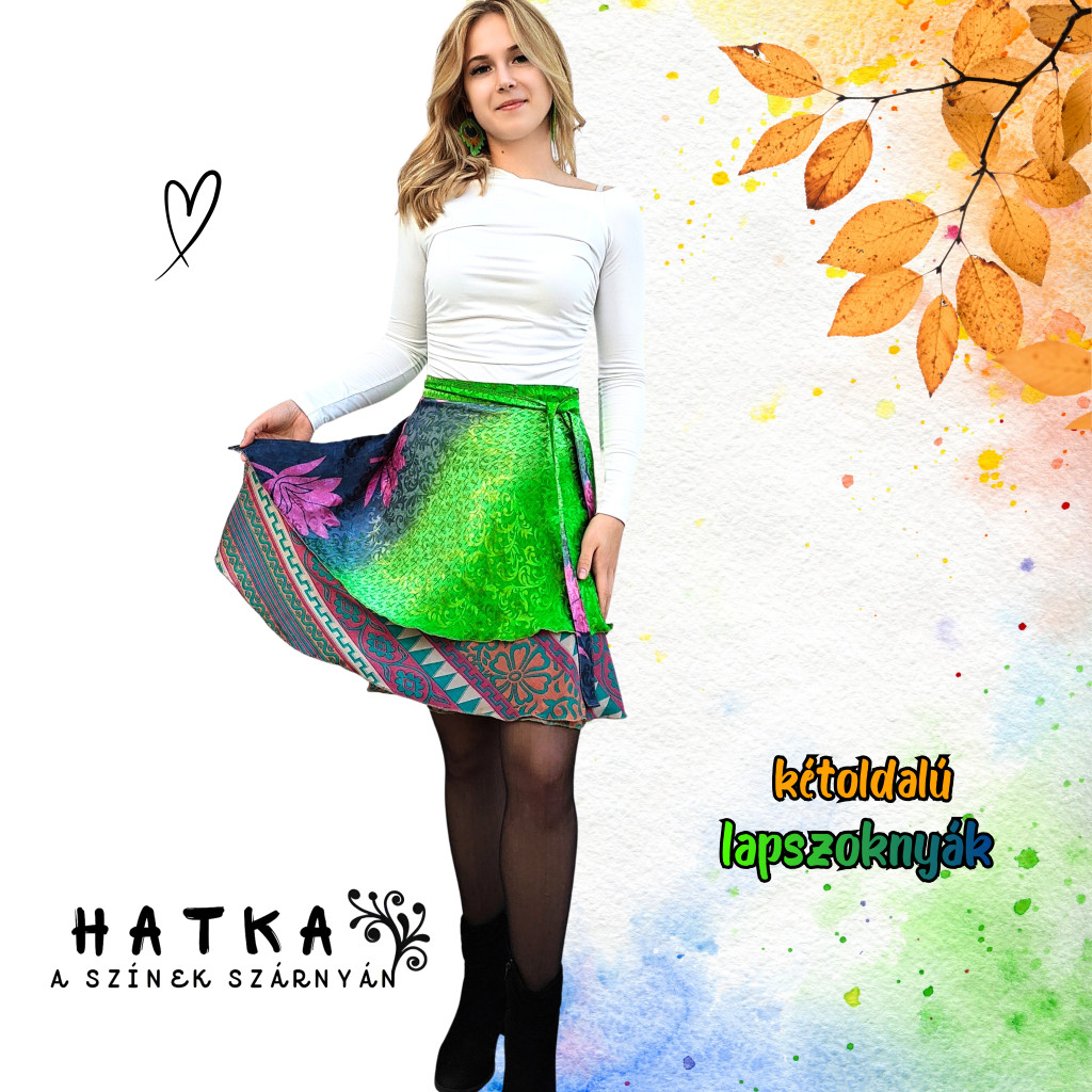 Lapszoknyáink újrahasznosított szárikból készülnek Indiában, egy hosszabb és egy rövidebb anyag derékban összevarrva! Két oldalú, kifordítható, mindkét oldala hordható, sokféleképpen köthető, variálható. Szoknyáinkból nincs két egyforma, mindegyikből csak EGY darab van, ha megtetszik, csapj le rá!