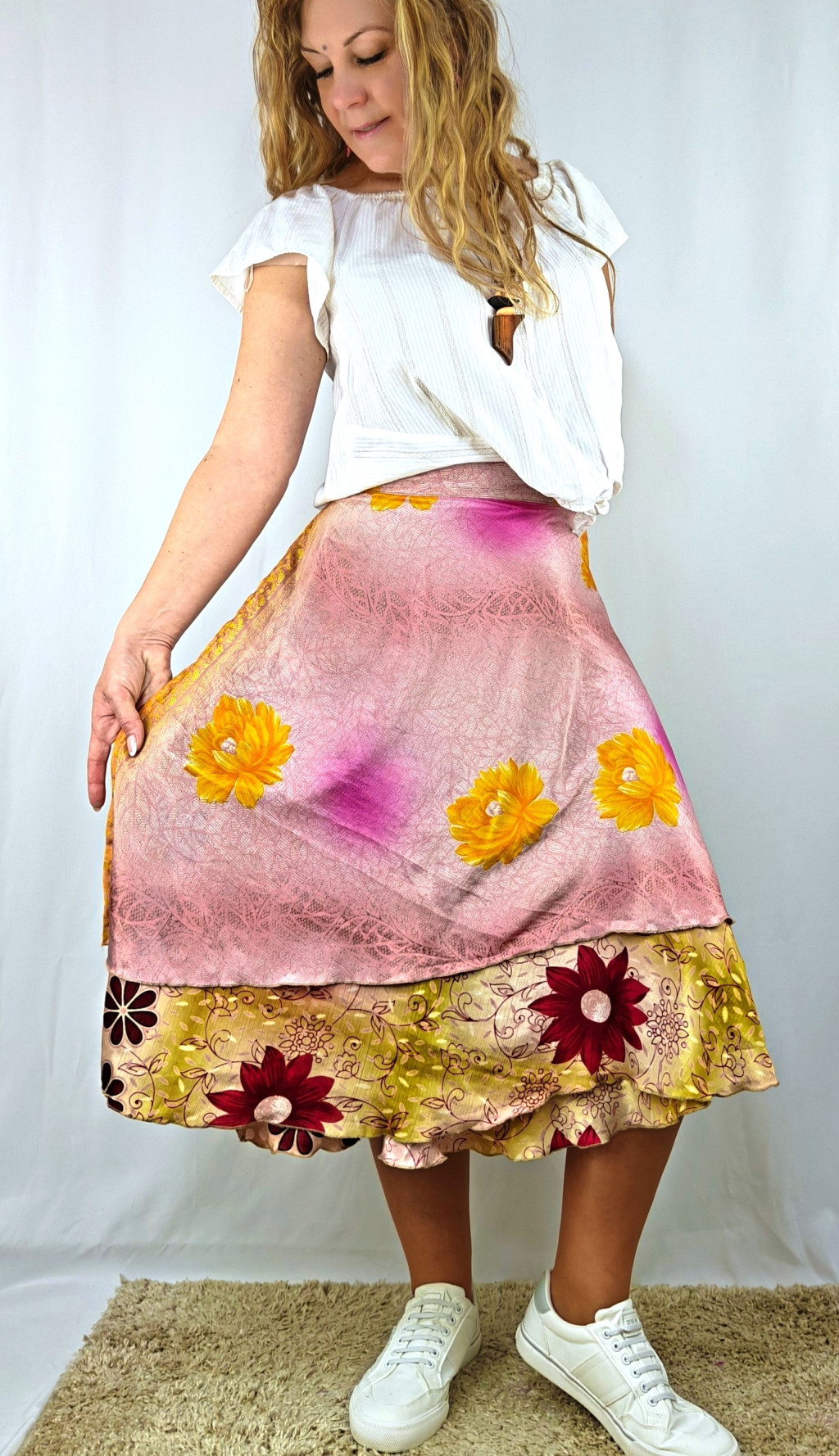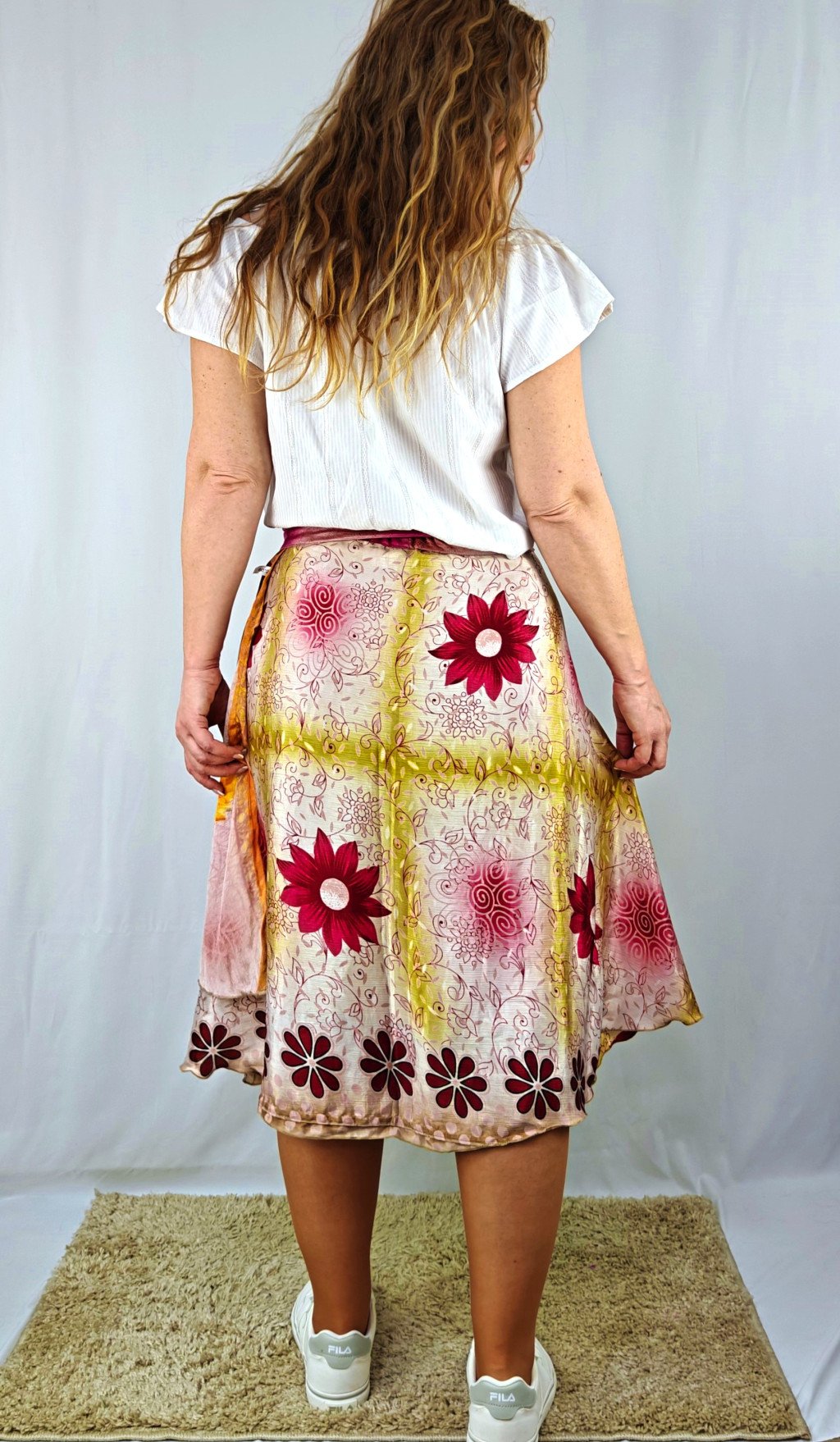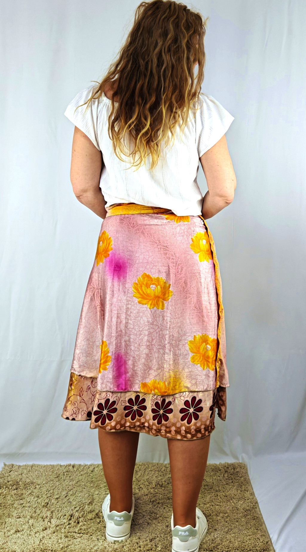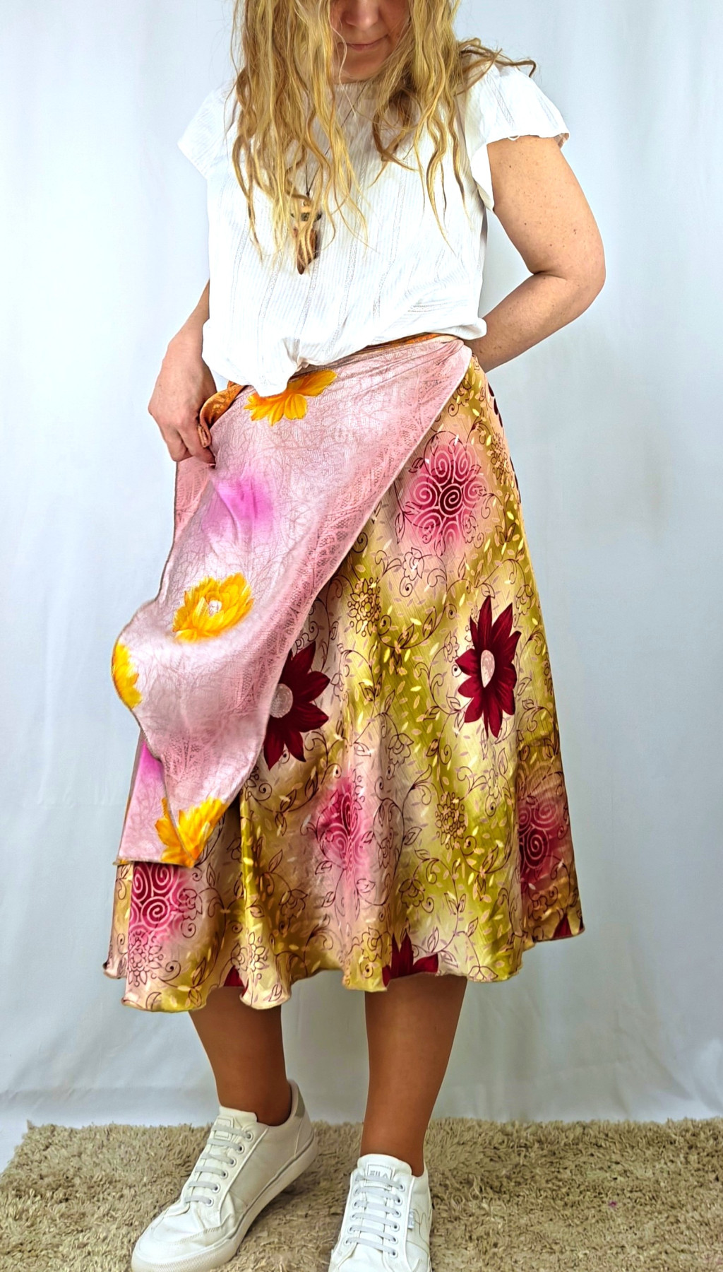 Lapszoknyáink újrahasznosított szárikból készülnek Indiában, egy hosszabb és egy rövidebb anyag derékban összevarrva! Két oldalú, kifordítható, mindkét oldala hordható, sokféleképpen köthető, variálható. Szoknyáinkból nincs két egyforma, mindegyikből csak EGY darab van, ha megtetszik, csapj le rá!