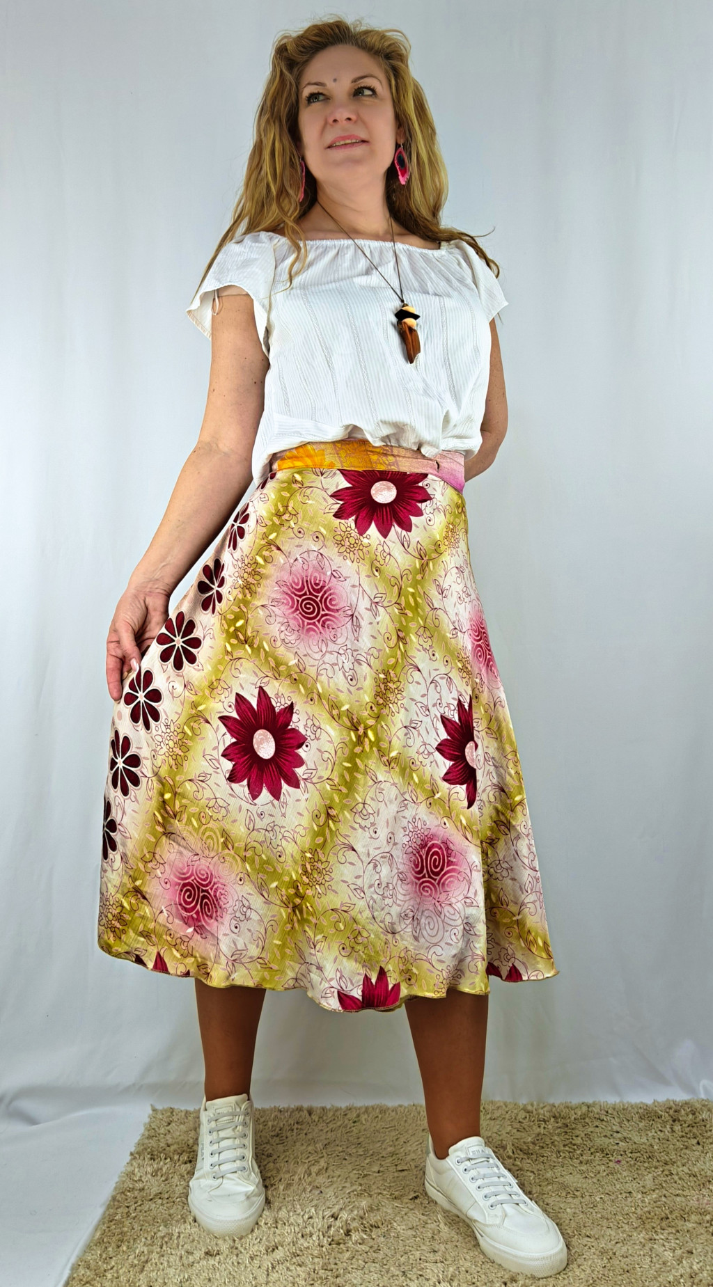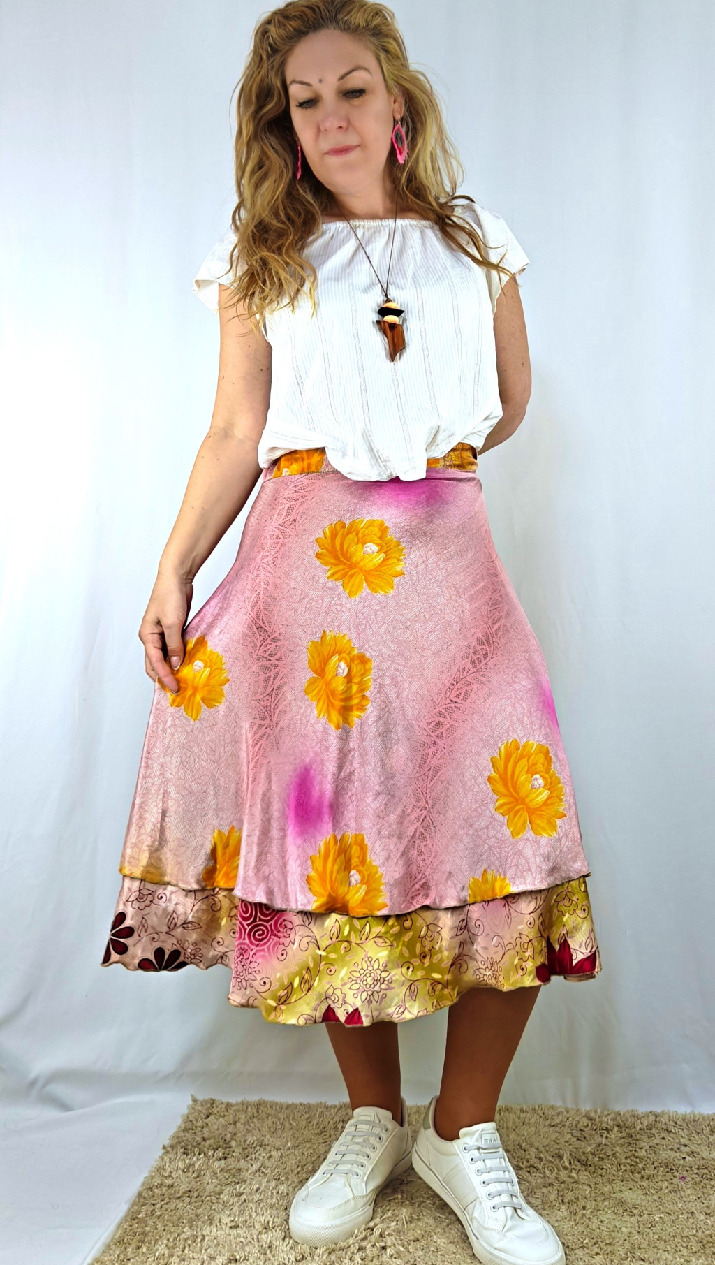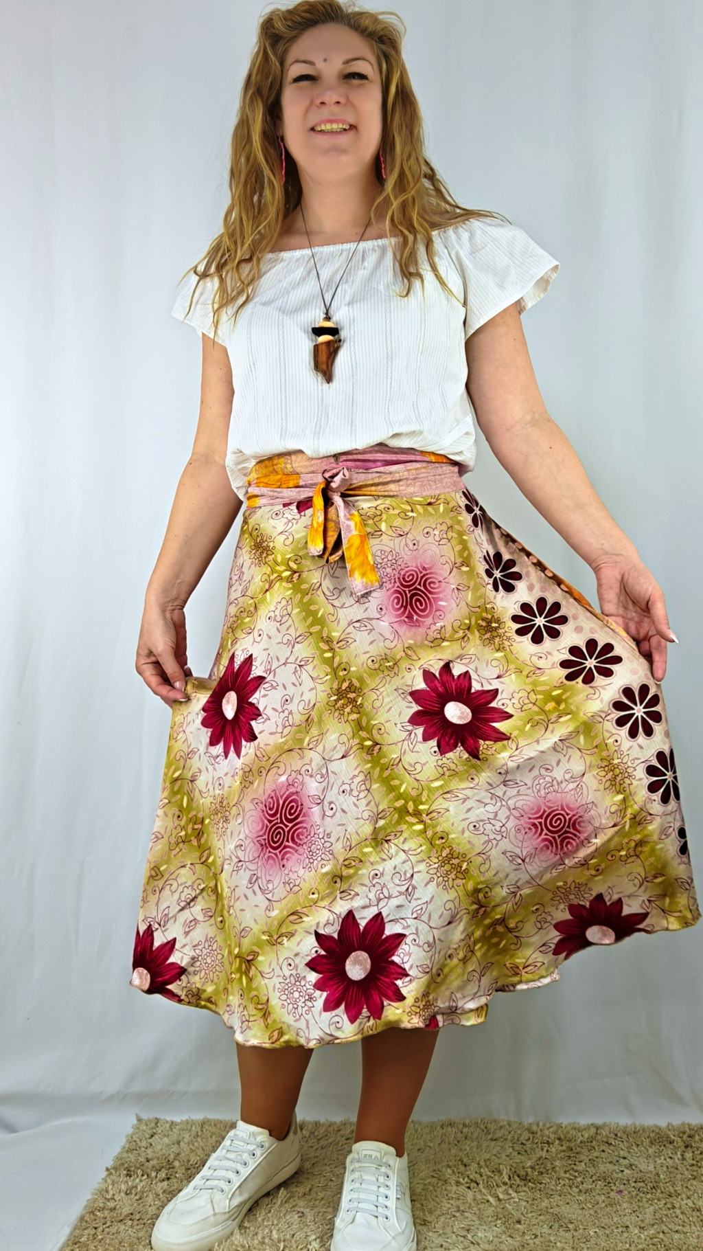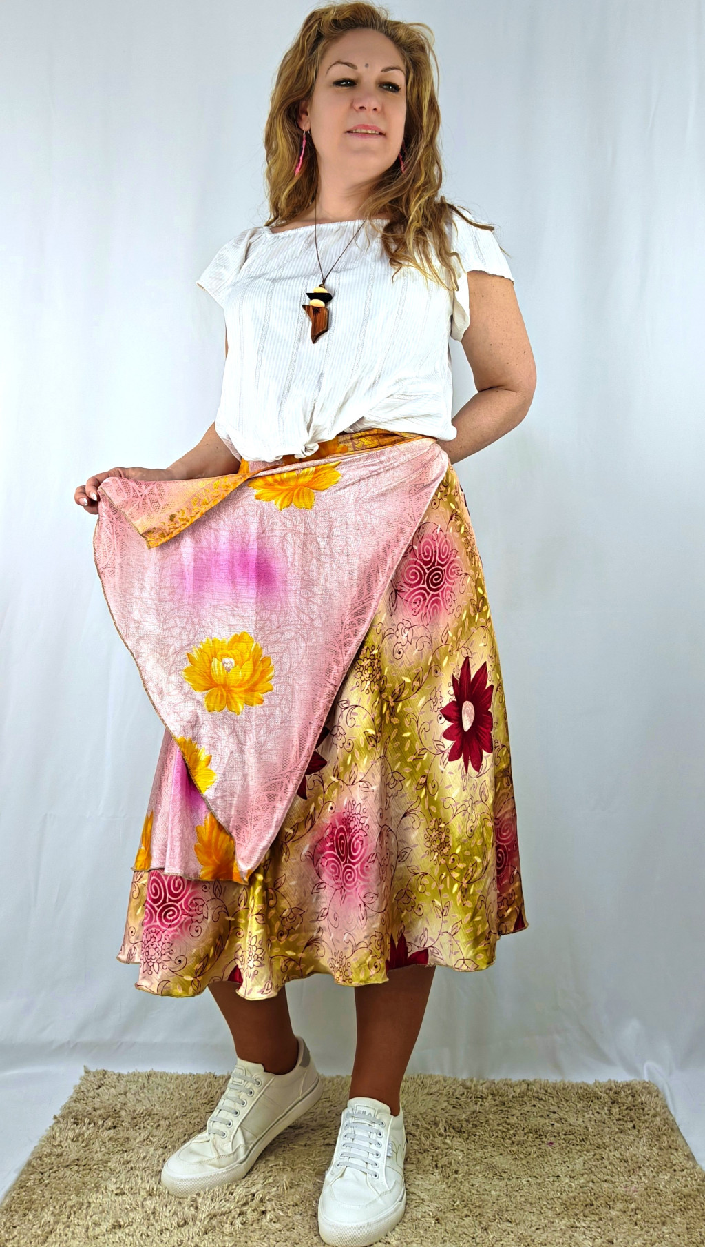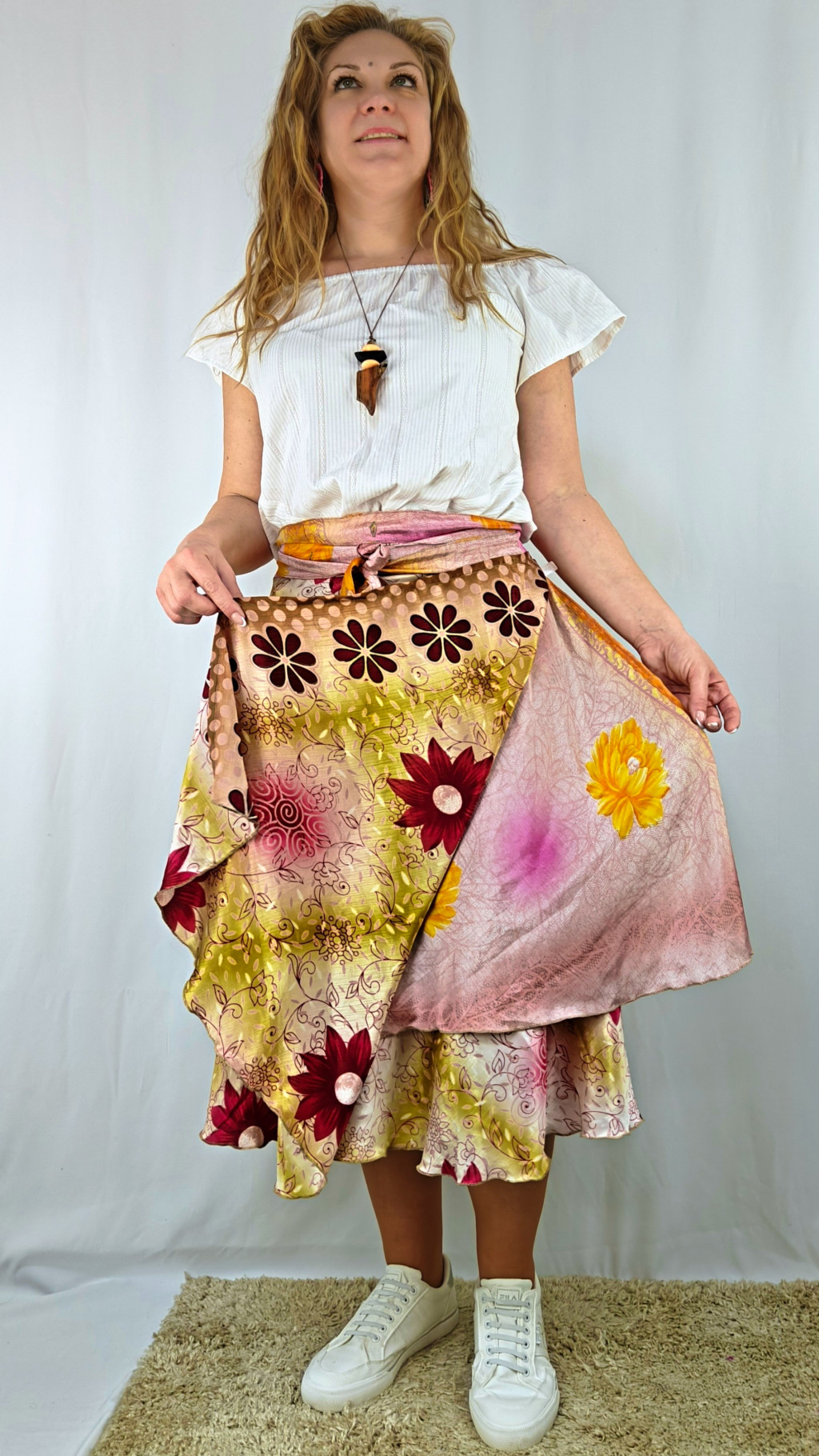Lapszoknyáink újrahasznosított szárikból készülnek Indiában, egy hosszabb és egy rövidebb anyag derékban összevarrva! Két oldalú, kifordítható, mindkét oldala hordható, sokféleképpen köthető, variálható. Szoknyáinkból nincs két egyforma, mindegyikből csak EGY darab van, ha megtetszik, csapj le rá!
