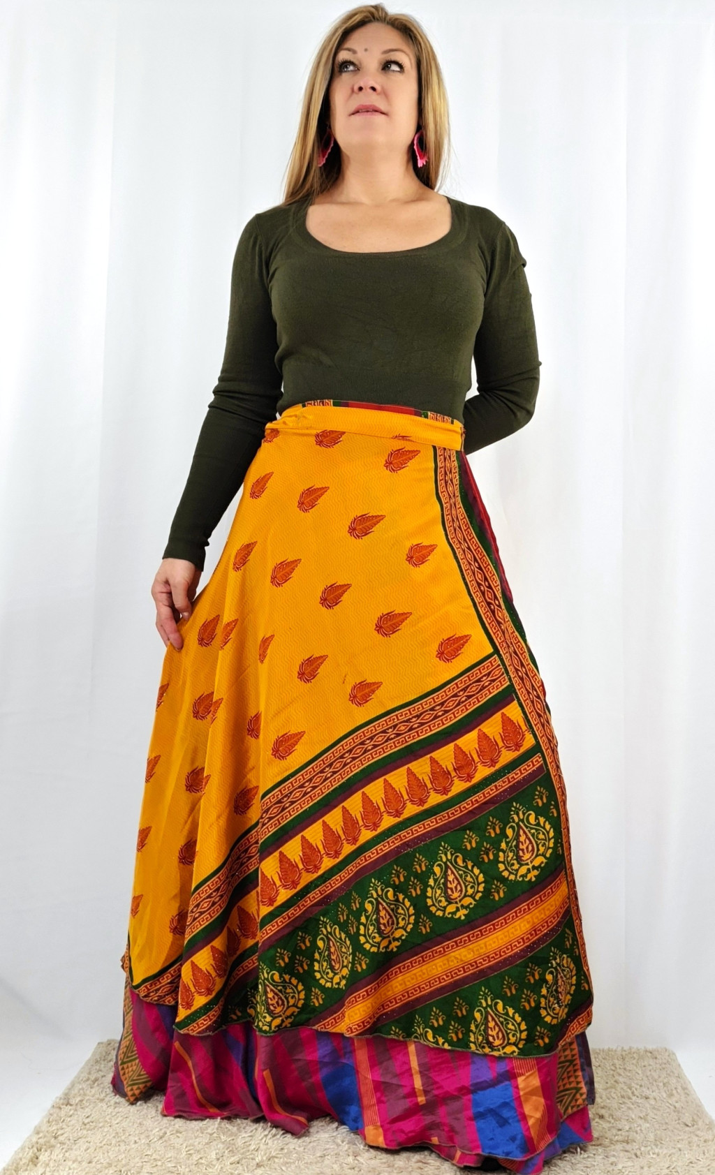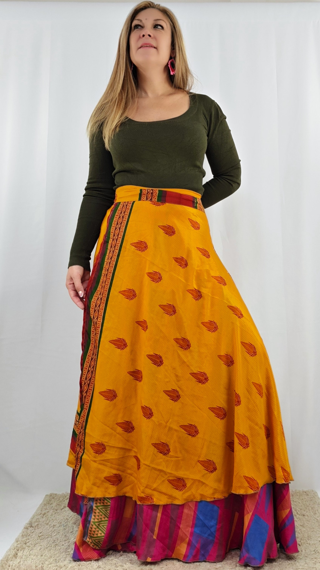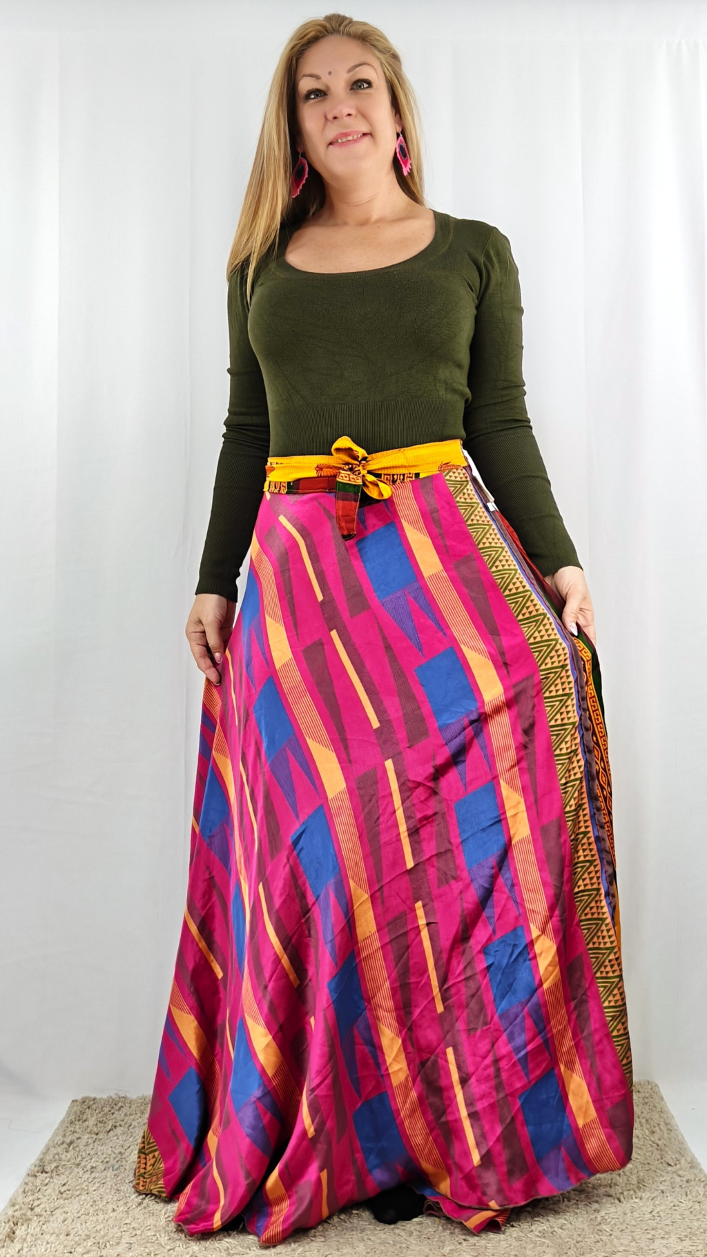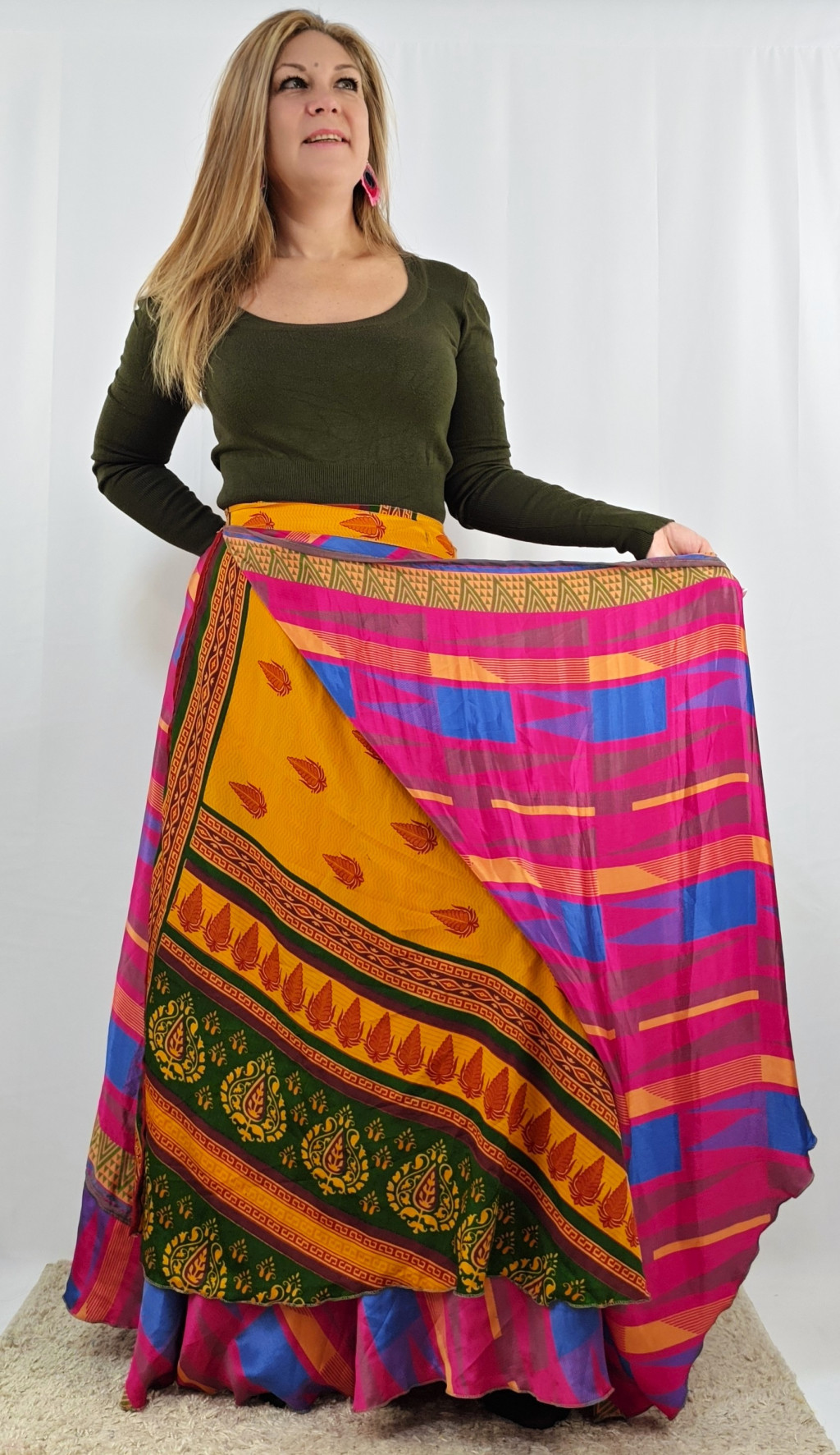 Lapszoknyáink újrahasznosított szárikból készülnek Indiában, egy hosszabb és egy rövidebb anyag derékban összevarrva! Két oldalú, kifordítható, mindkét oldala hordható, sokféleképpen köthető, variálható. Szoknyáinkból nincs két egyforma, mindegyikből csak EGY darab van, ha megtetszik, csapj le rá!
