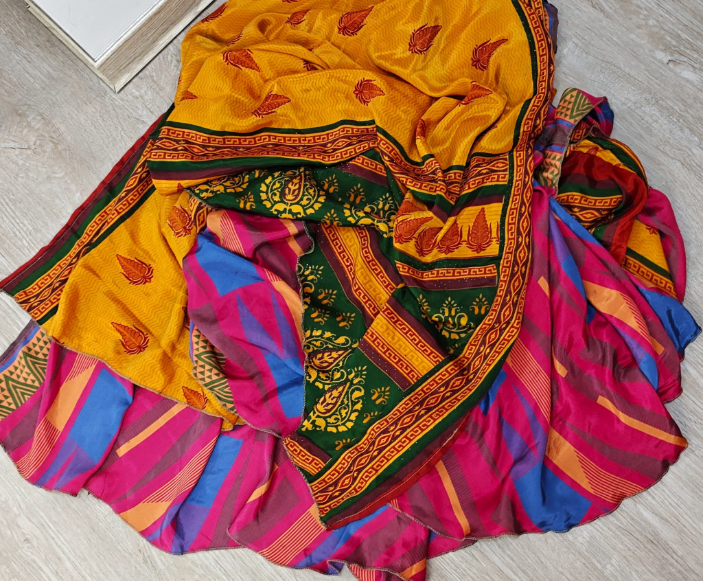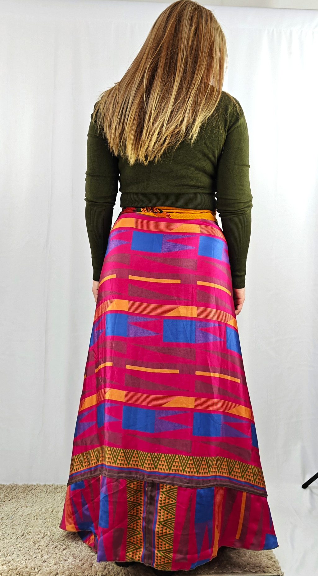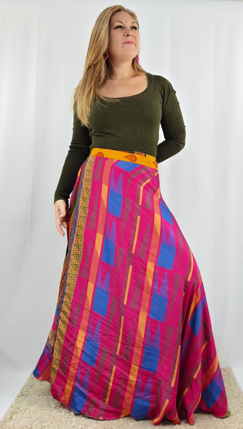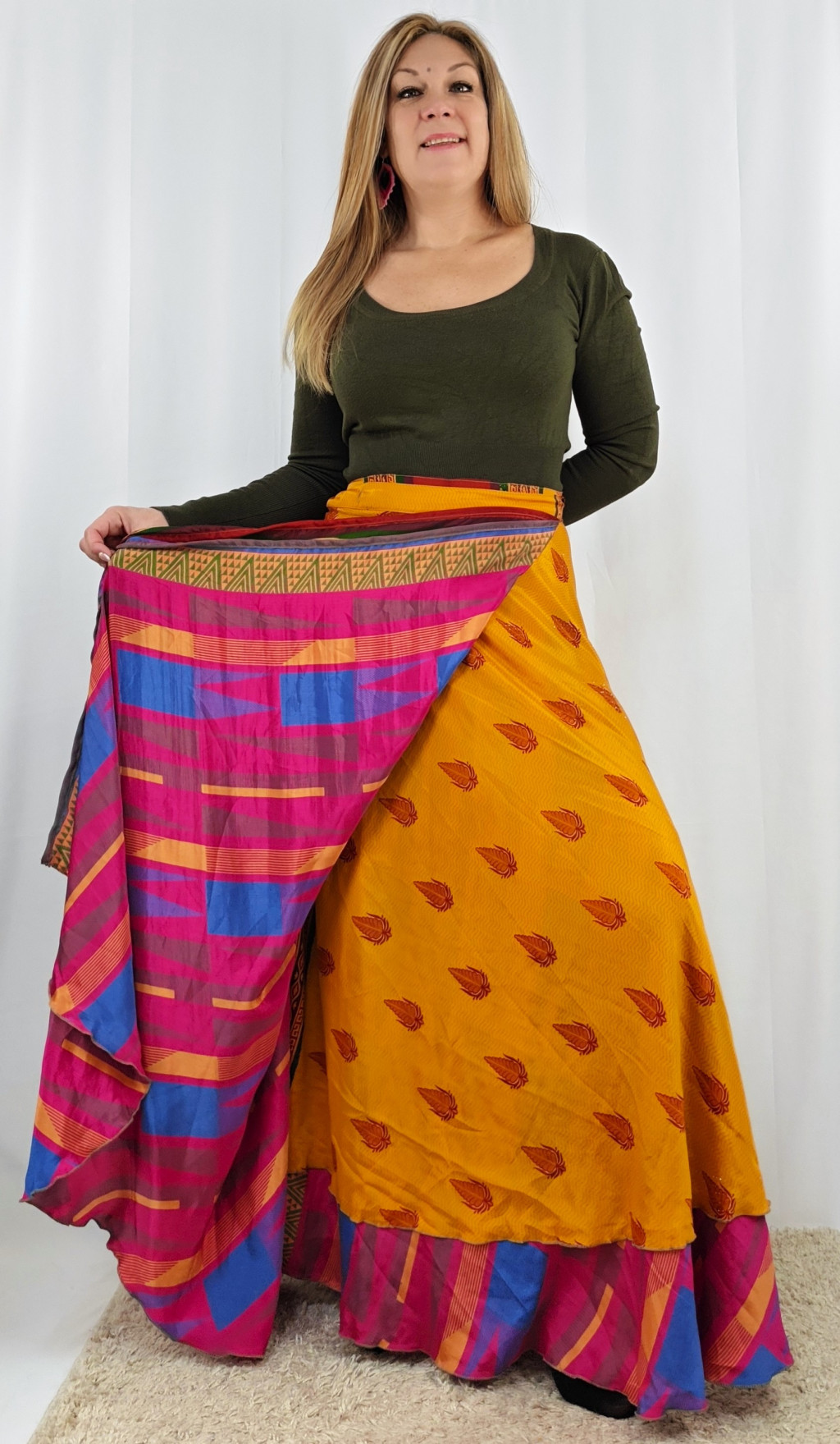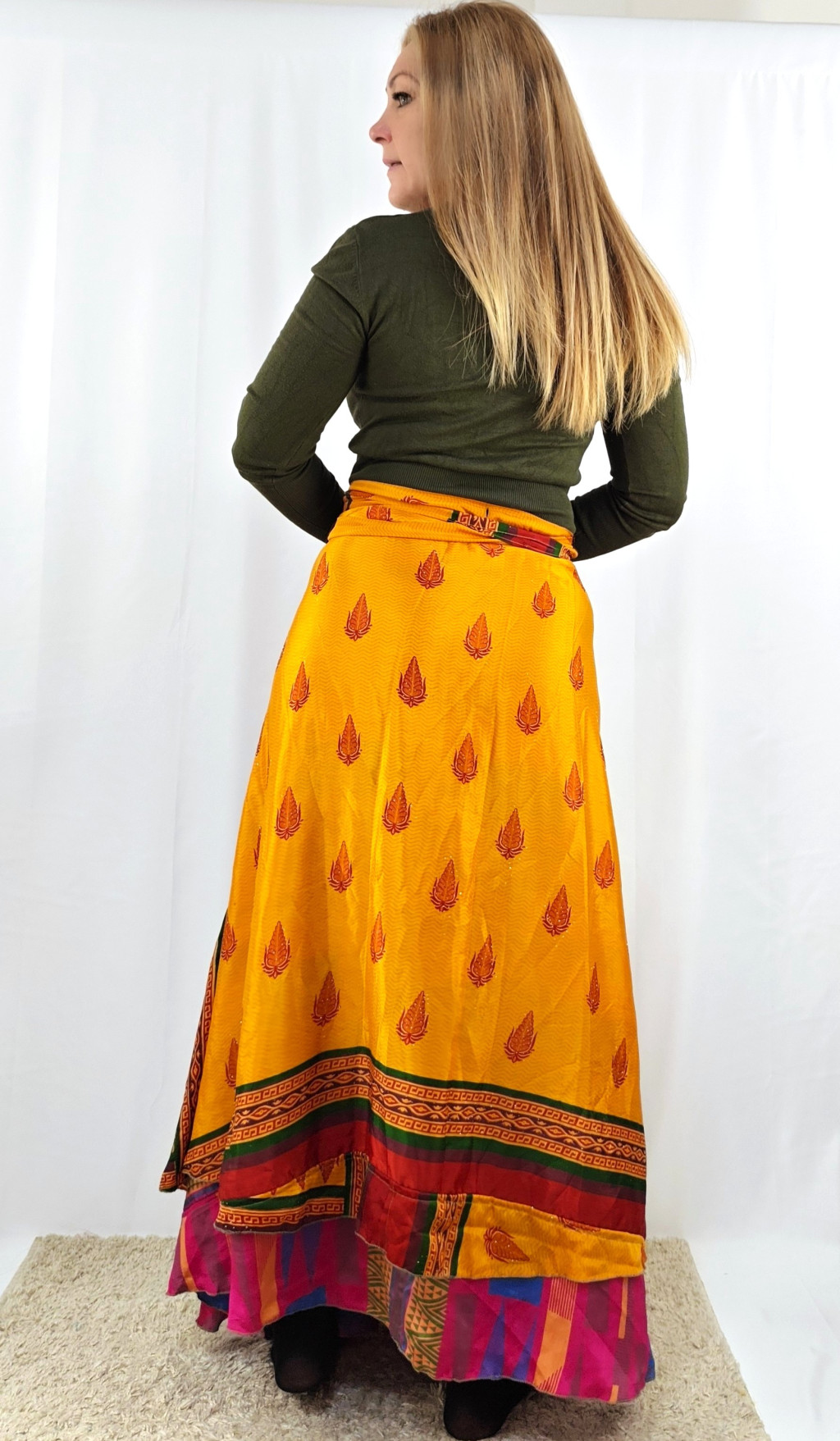 Lapszoknyáink újrahasznosított szárikból készülnek Indiában, egy hosszabb és egy rövidebb anyag derékban összevarrva! Két oldalú, kifordítható, mindkét oldala hordható, sokféleképpen köthető, variálható. Szoknyáinkból nincs két egyforma, mindegyikből csak EGY darab van, ha megtetszik, csapj le rá!