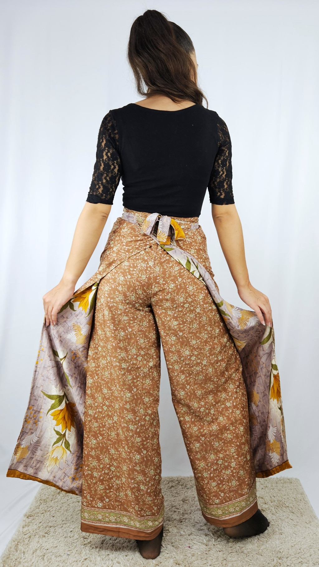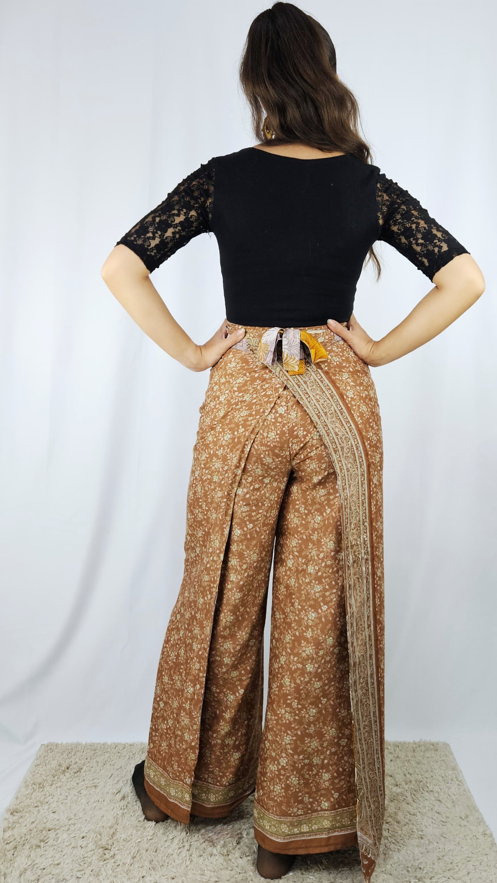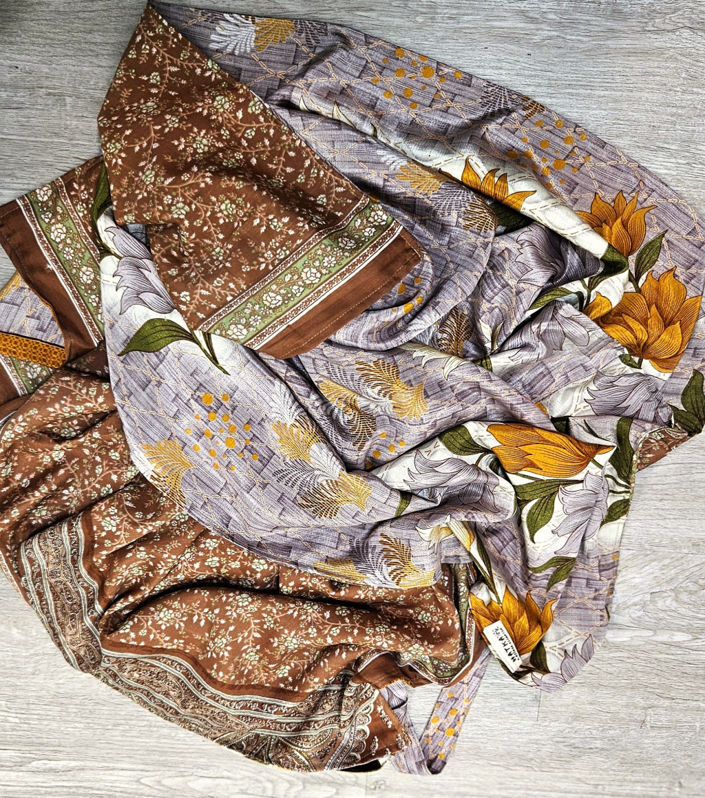 Lapnadrágjaink újrahasznosított szárikból készülnek Indiában. Két különböző csodás anyagot varrnak össze, így a külső és belső fele is hordható!