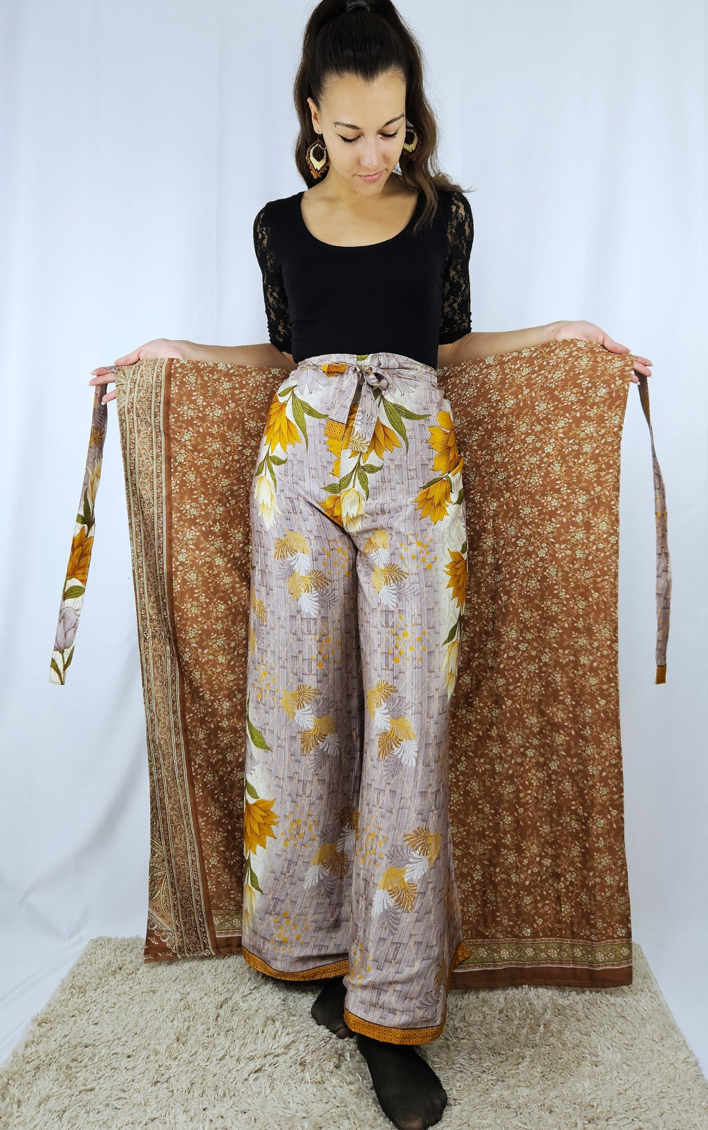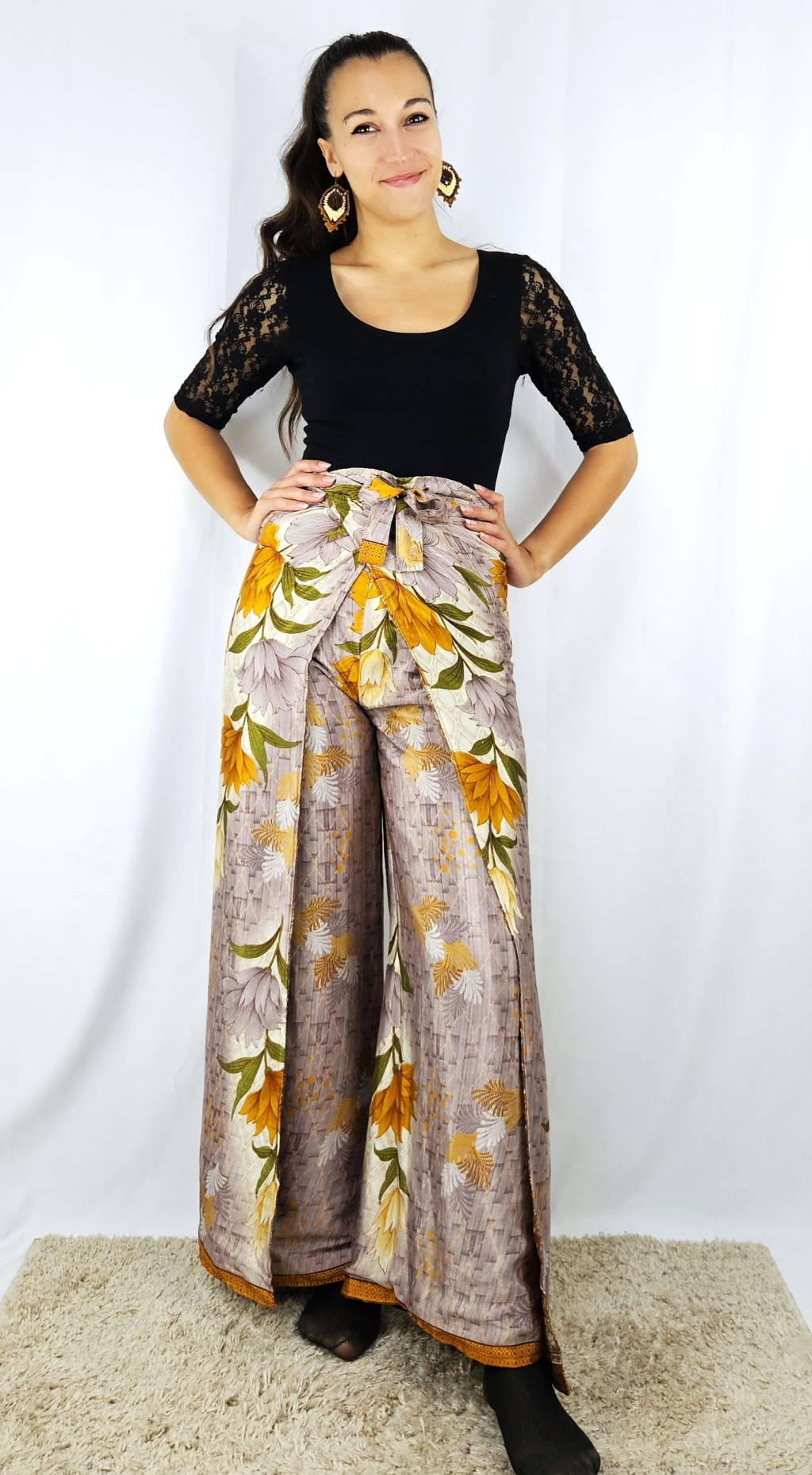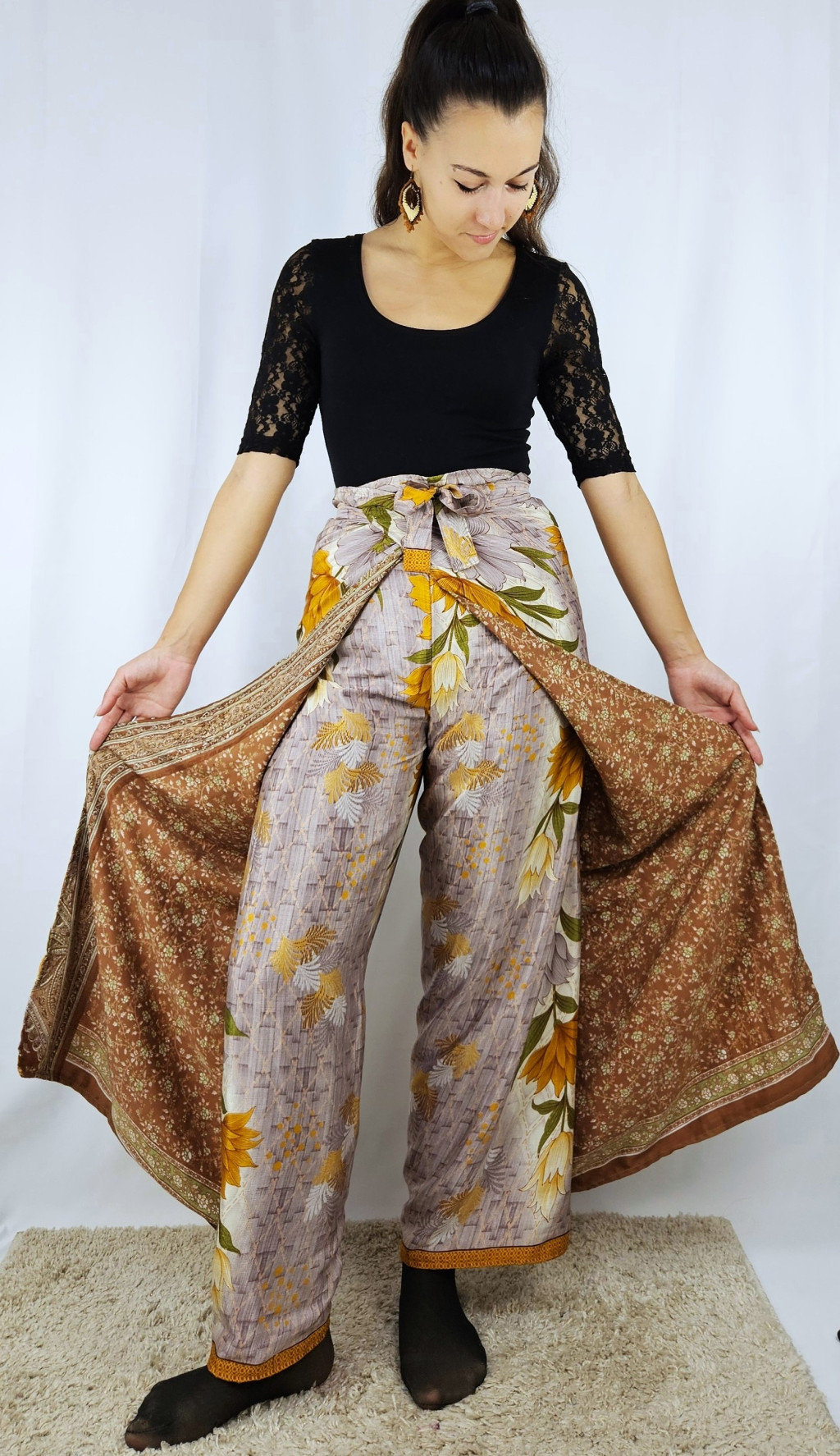 Lapnadrágjaink újrahasznosított szárikból készülnek Indiában. Két különböző csodás anyagot varrnak össze, így a külső és belső fele is hordható!