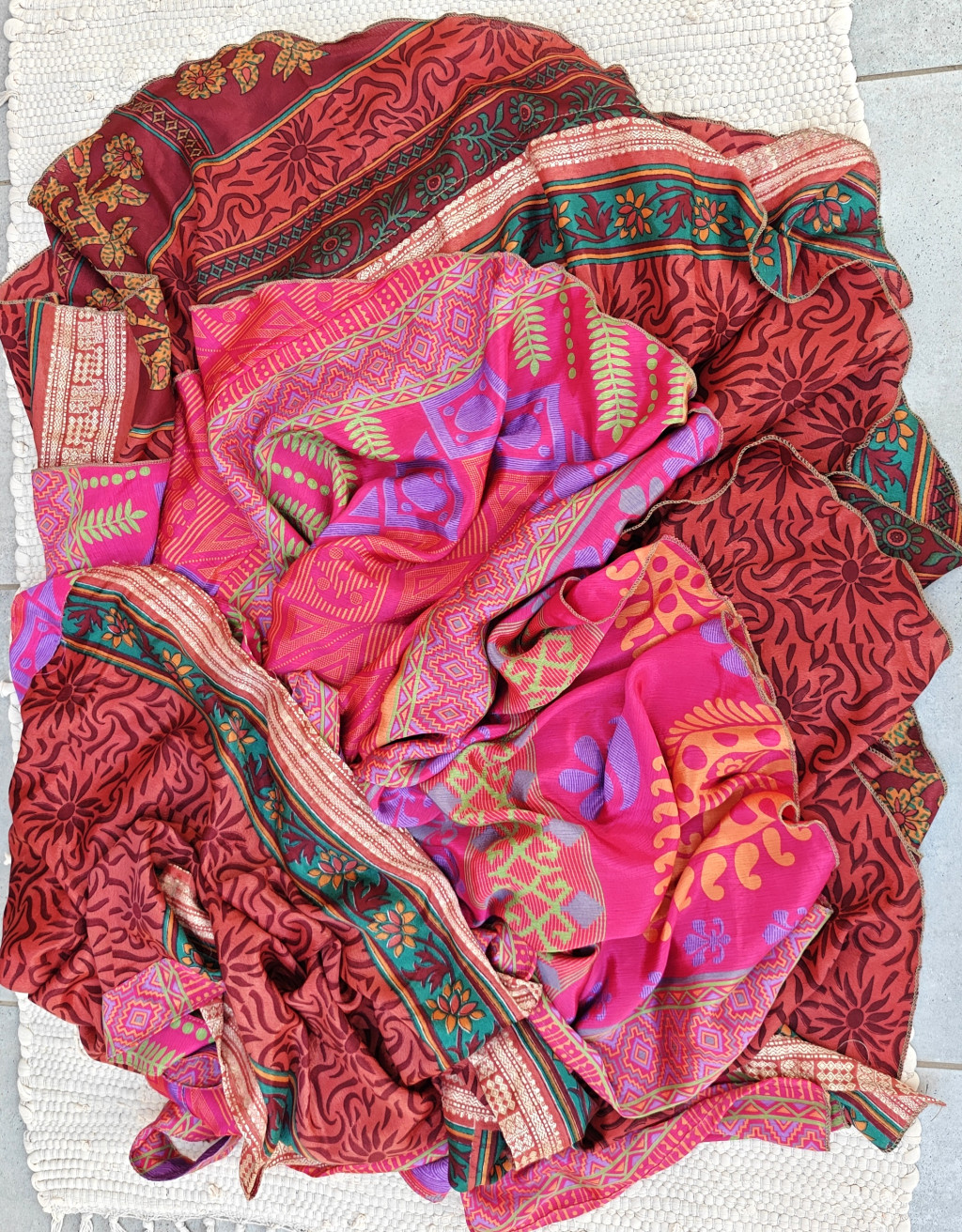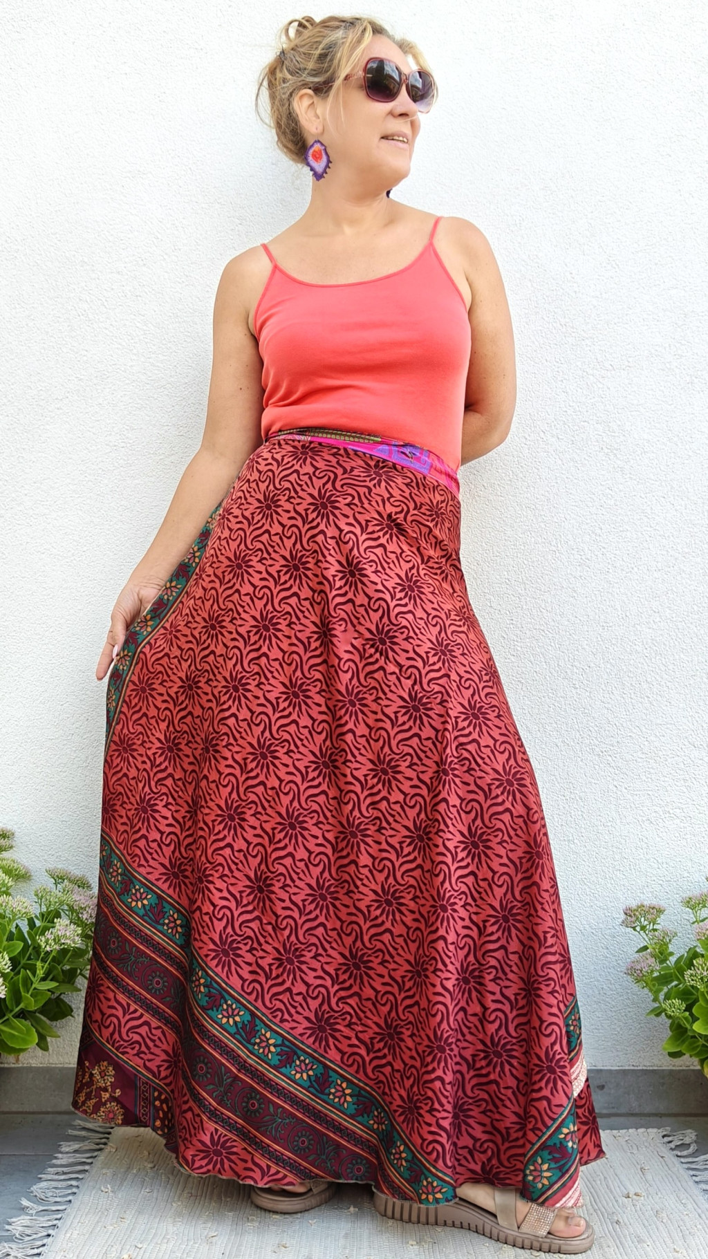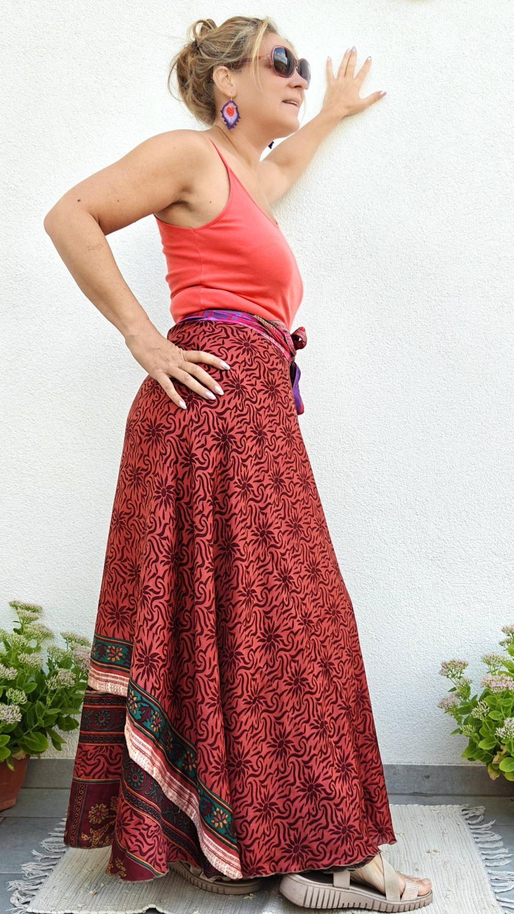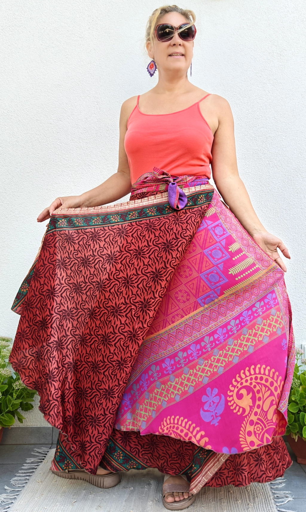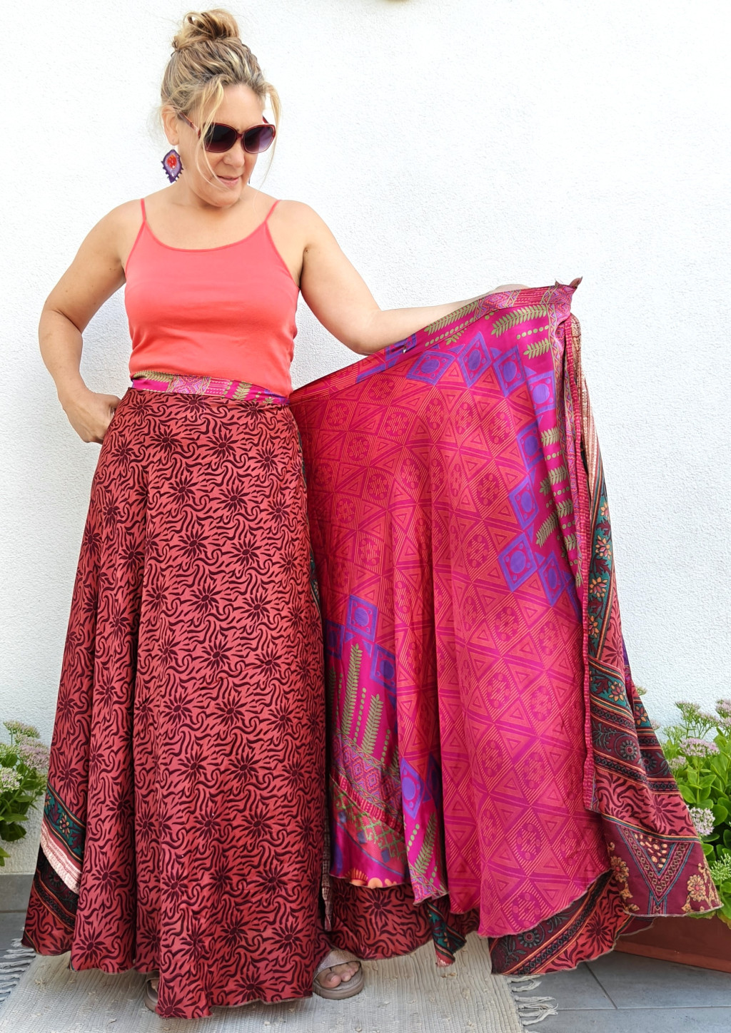 Lapszoknyáink újrahasznosított szárikból készülnek Indiában, egy hosszabb és egy rövidebb anyag derékban összevarrva! Két oldalú, kifordítható, mindkét oldala hordható, sokféleképpen köthető, variálható. Szoknyáinkból nincs két egyforma, mindegyikből csak EGY darab van, ha megtetszik, csapj le rá!