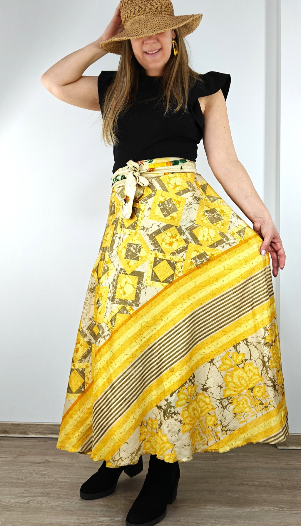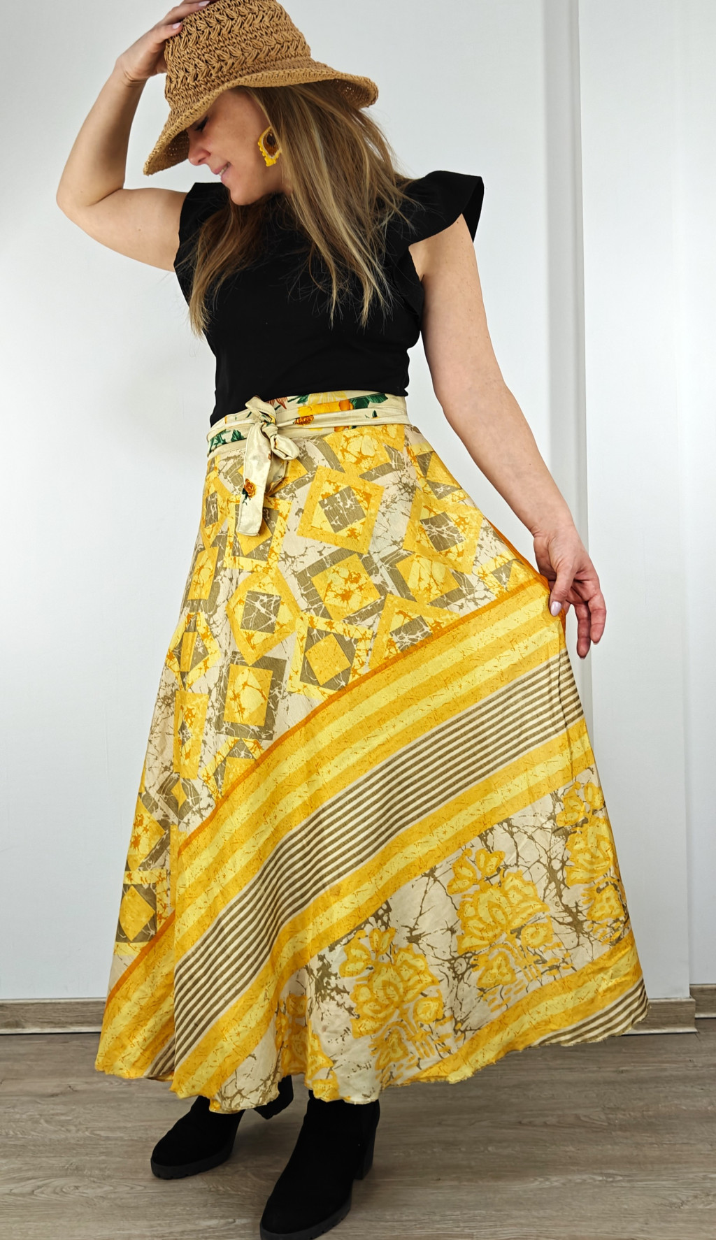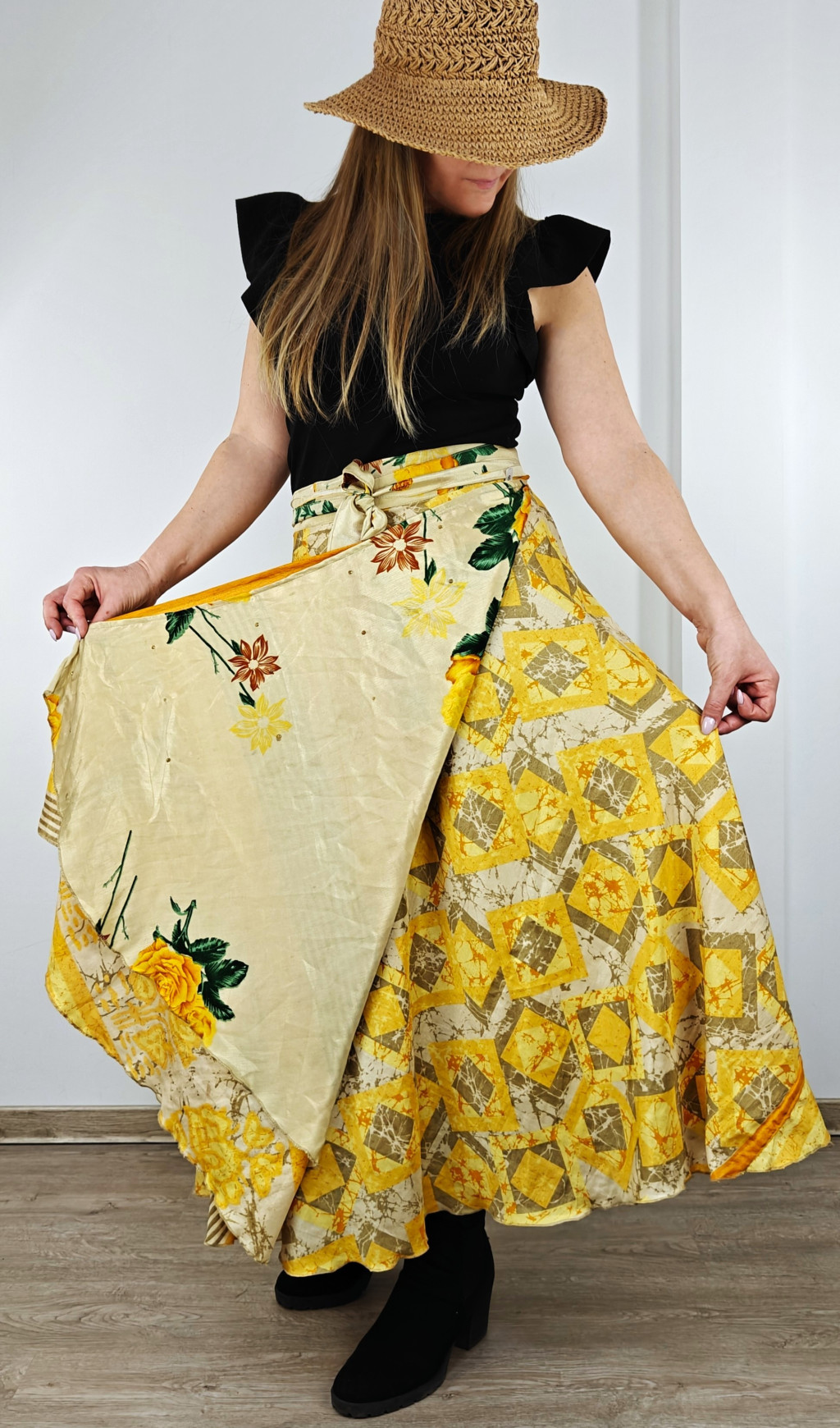 Lapszoknyáink újrahasznosított szárikból készülnek Indiában, egy hosszabb és egy rövidebb anyag derékban összevarrva! Két oldalú, kifordítható, mindkét oldala hordható, sokféleképpen köthető, variálható. Szoknyáinkból nincs két egyforma, mindegyikből csak EGY darab van, ha megtetszik, csapj le rá!