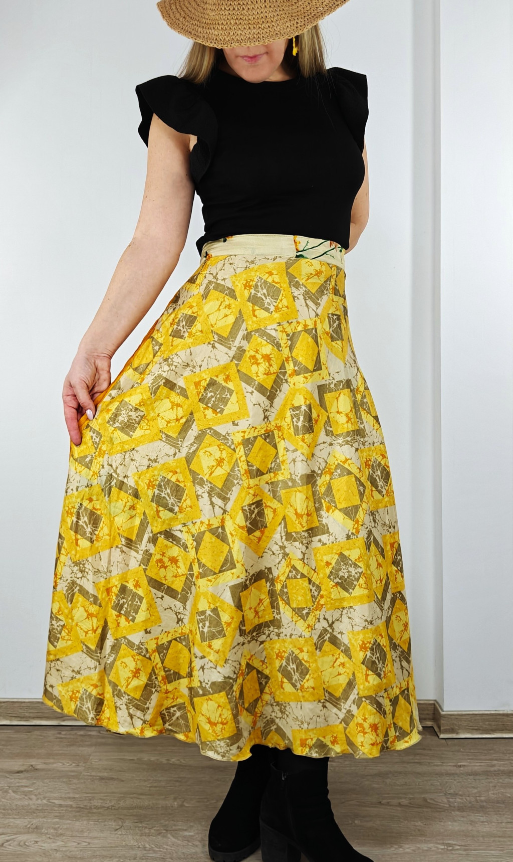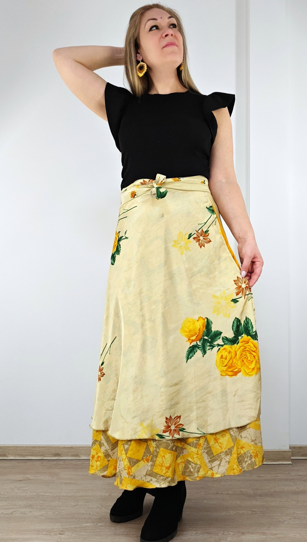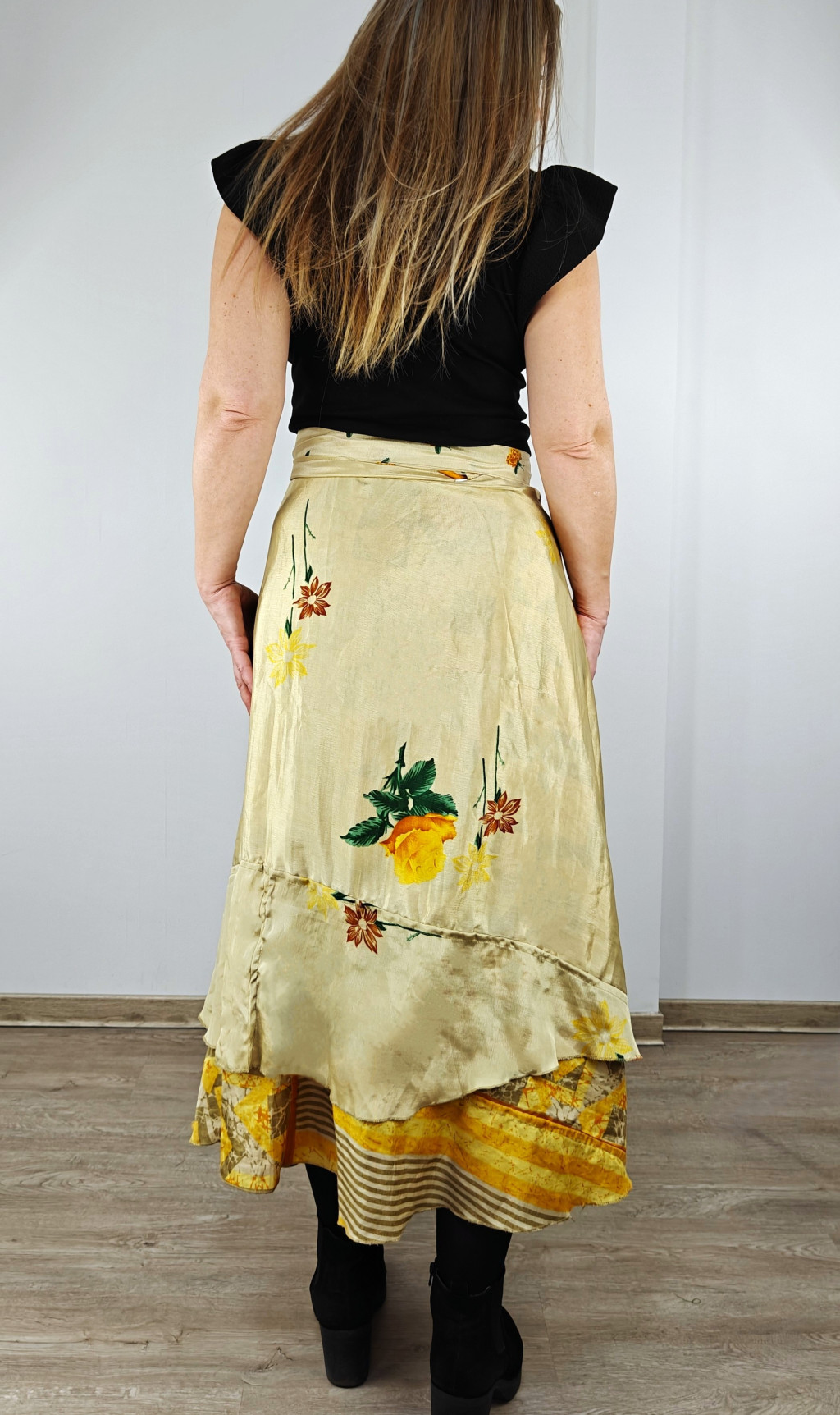 Lapszoknyáink újrahasznosított szárikból készülnek Indiában, egy hosszabb és egy rövidebb anyag derékban összevarrva! Két oldalú, kifordítható, mindkét oldala hordható, sokféleképpen köthető, variálható. Szoknyáinkból nincs két egyforma, mindegyikből csak EGY darab van, ha megtetszik, csapj le rá!